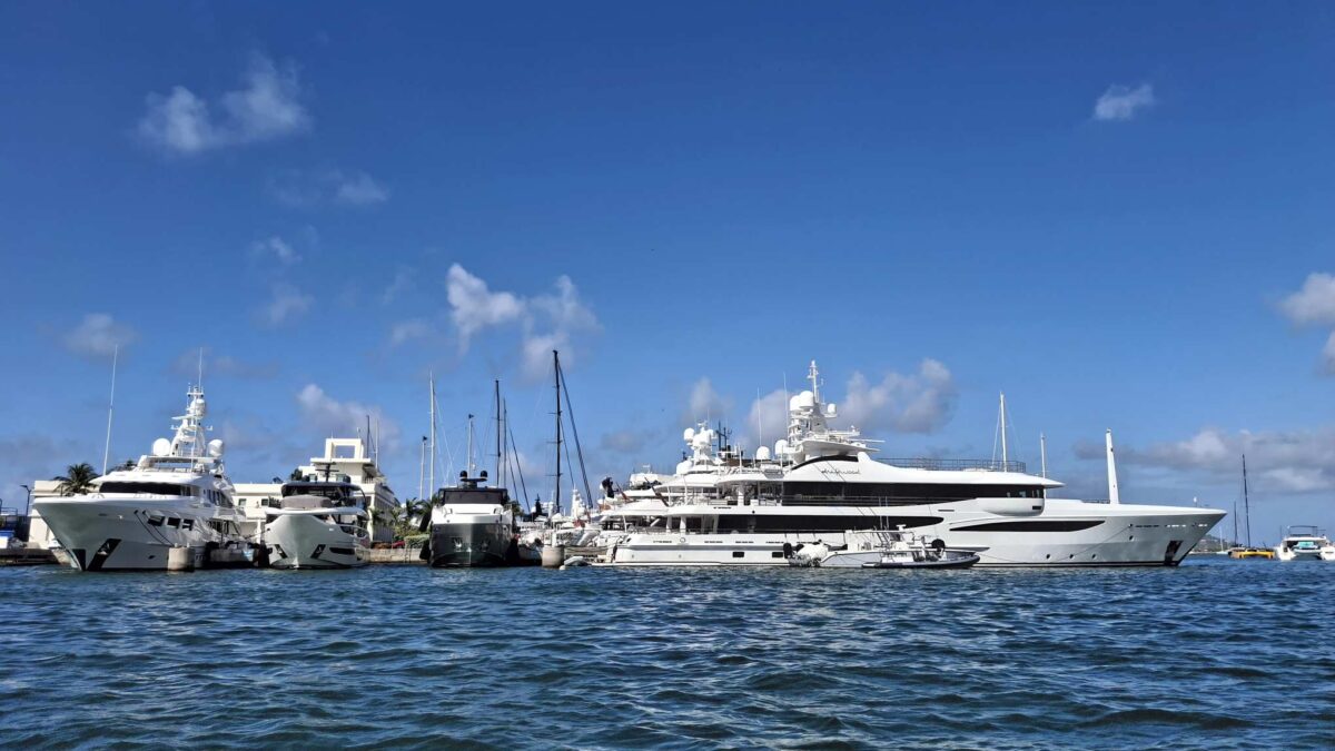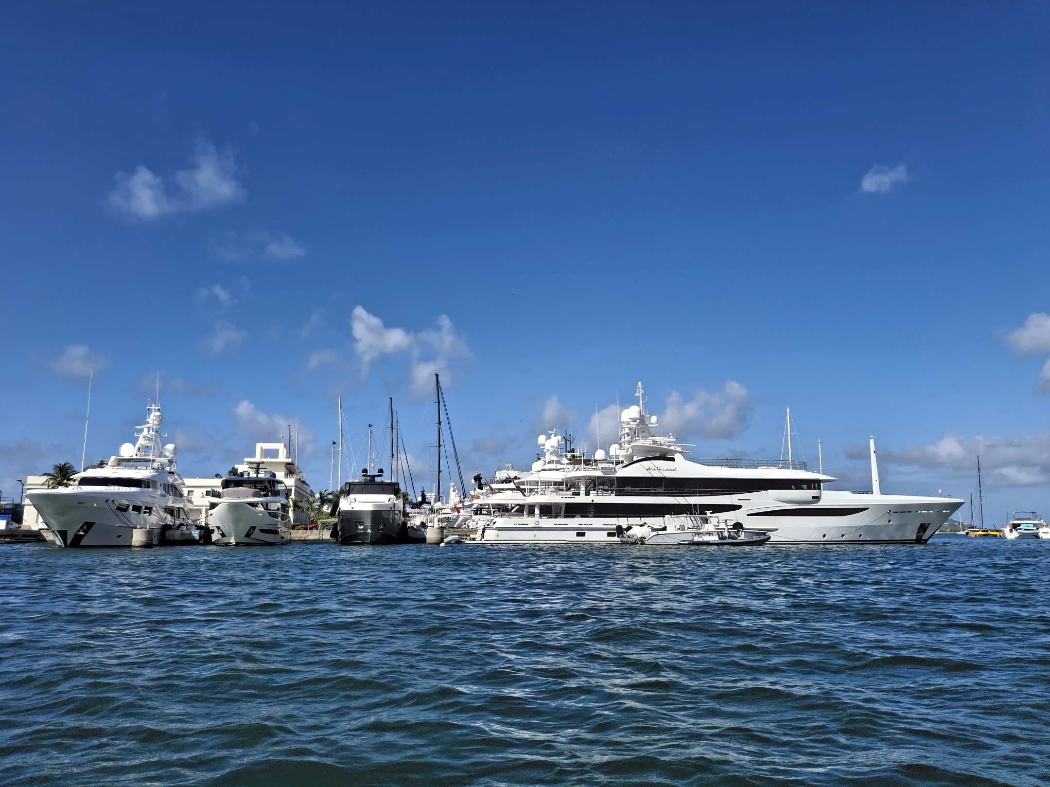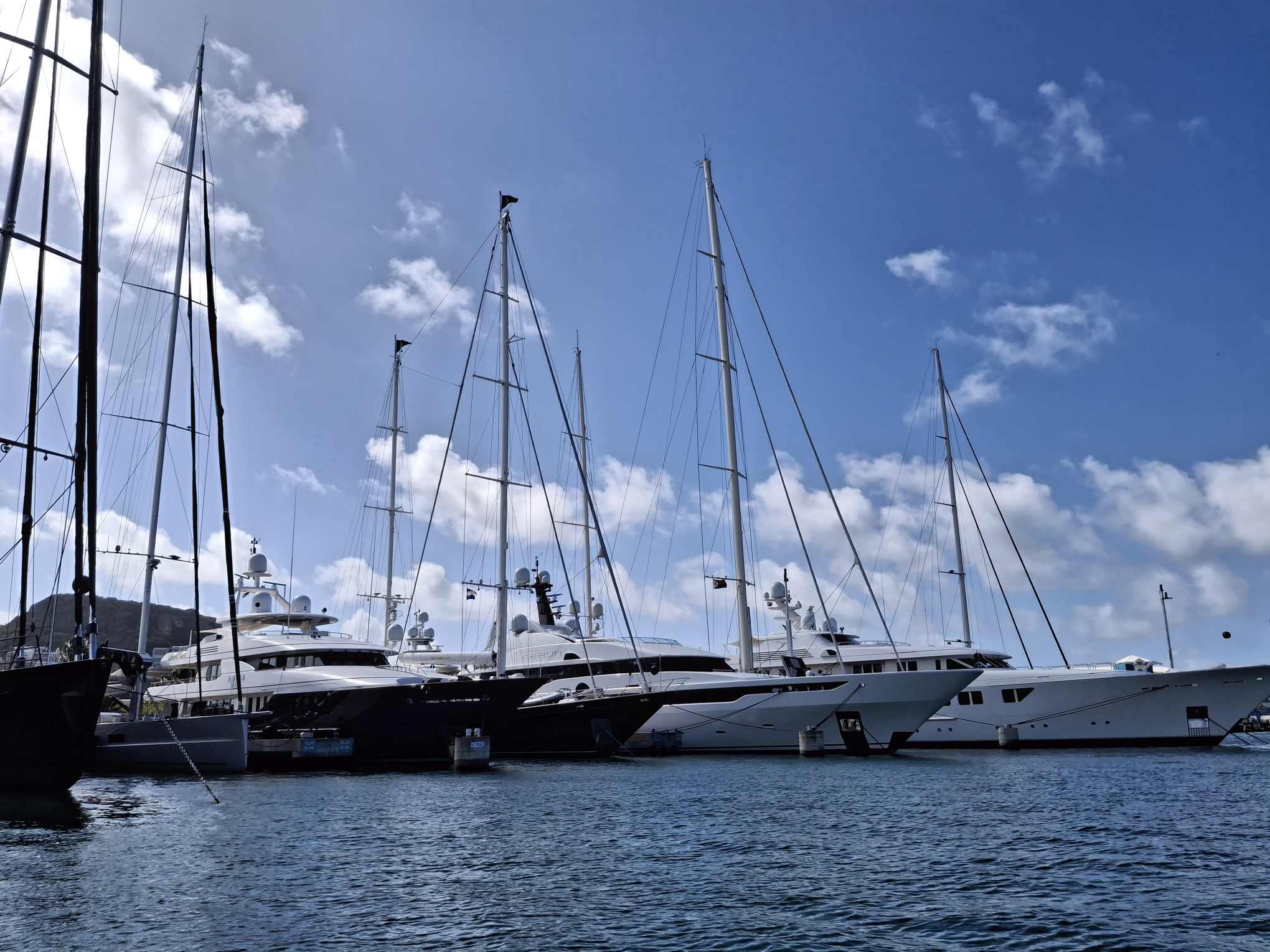 Im Kontrast zu den gedrängten und gefühlt noch immer zerfallenden Verhältnissen auf den Strassen des Städtchens Marigot stehen die unzähligen, riesigen Superjachten in der Lagune. Es wirkt irgendwie schon ziemlich befremdlich, so viel unglaublichen Luxus auf so wenig Raum angehäuft zu sehen. Manchmal wird man sich der riesigen Masse erst bewusst, wenn es einen Grössenvergleich mit einem Crewmitglied irgendwo auf den Ungetümen gibt… Unsere sea magiX ist oft gerade mal so gross, wie das Beiboot dieser Dampfer. Was wohl ein Tag Liegeplatz für so einen hier kostet? Wir könnten es nachlesen, aber lassen das lieber deren Problem sein.