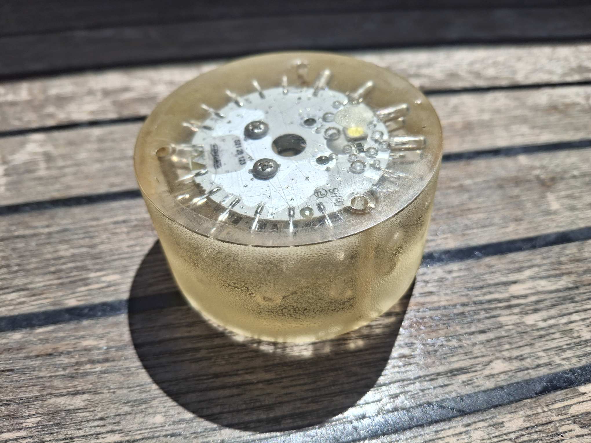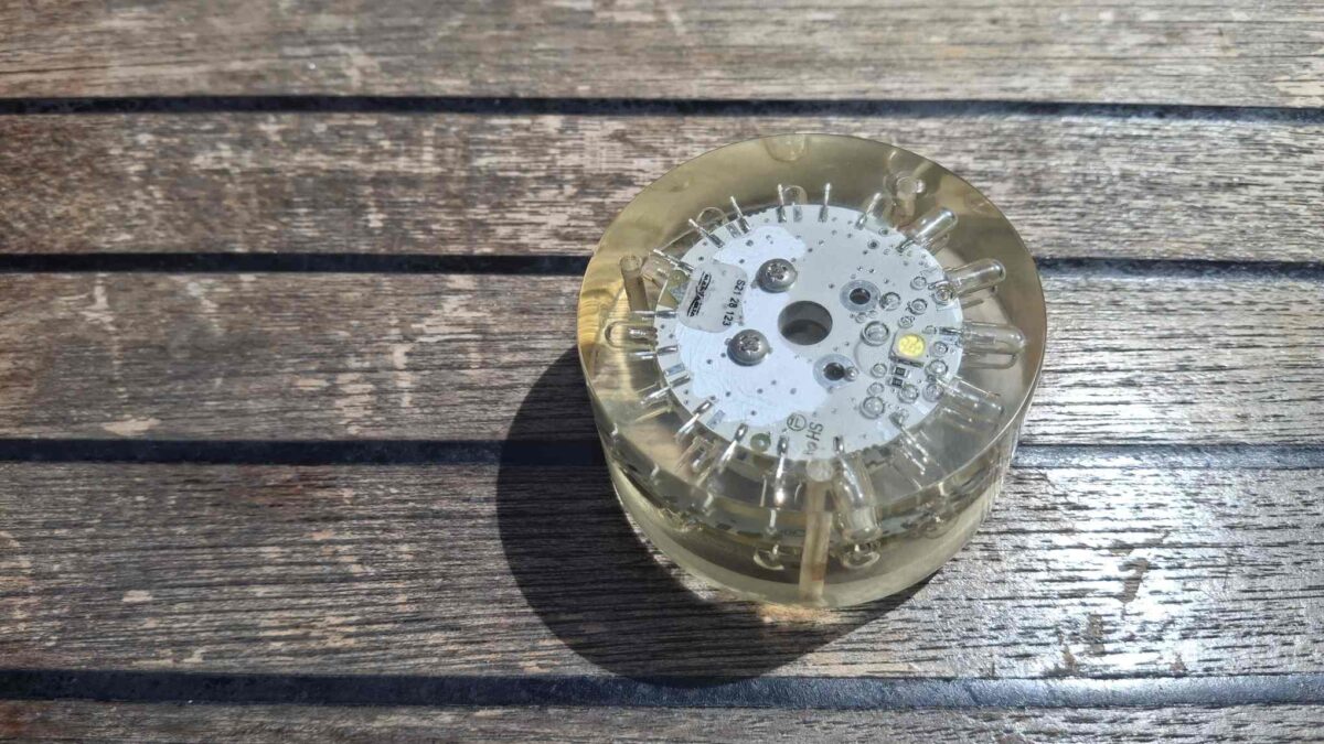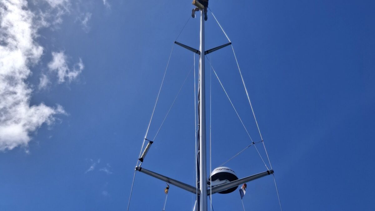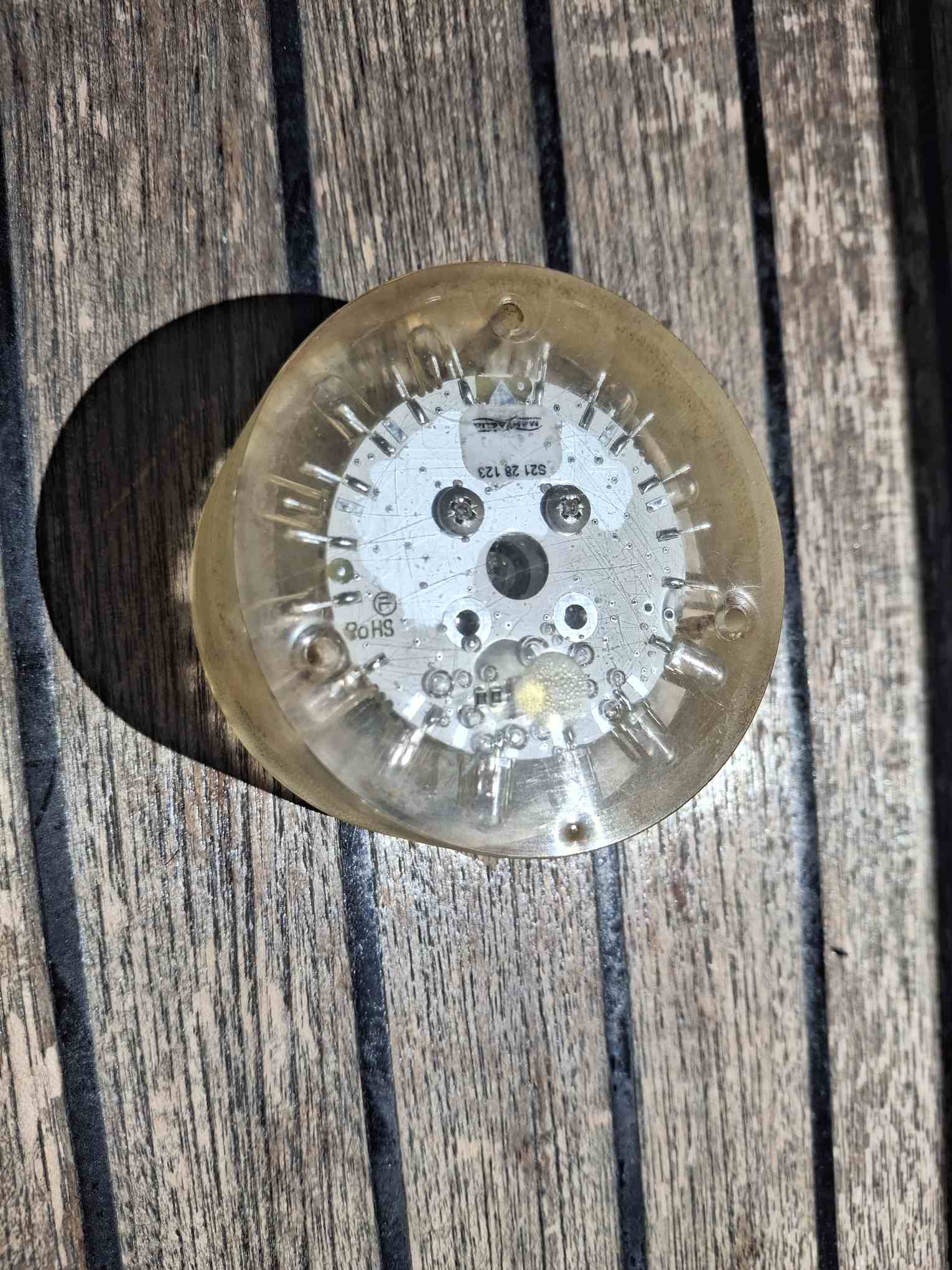 Eine wichtige Pendenz war – nebst dem “Verband” für das Genuafall – die Untersuchung unseres Ankerlichts im Masttop. Das schien plötzlich nicht mehr wirklich stark genug und war kaum mehr sichtbar. Bevor er ein neues bestellte, wollte der Skipper das Licht im Masttop mal kontrollieren. Mit der Elektrowinsch ist das Hinaufziehen heutzutage kein grosses Problem mehr für mich – auch nicht, wenn man dreimal hoch muss… Er montierte das Licht oben ab (das in dieser Variante neu ca. 300 € kostet) und brachte es ins Cockpit herunter. Wir staunten nicht schlecht: das Epoxy-Harz, in dem die LED-Lämpchen eingegossen sind, war nach 4 Jahren völlig erblindet.