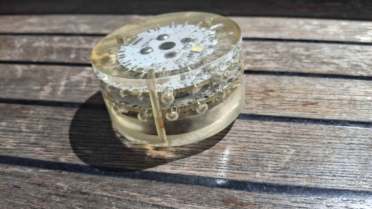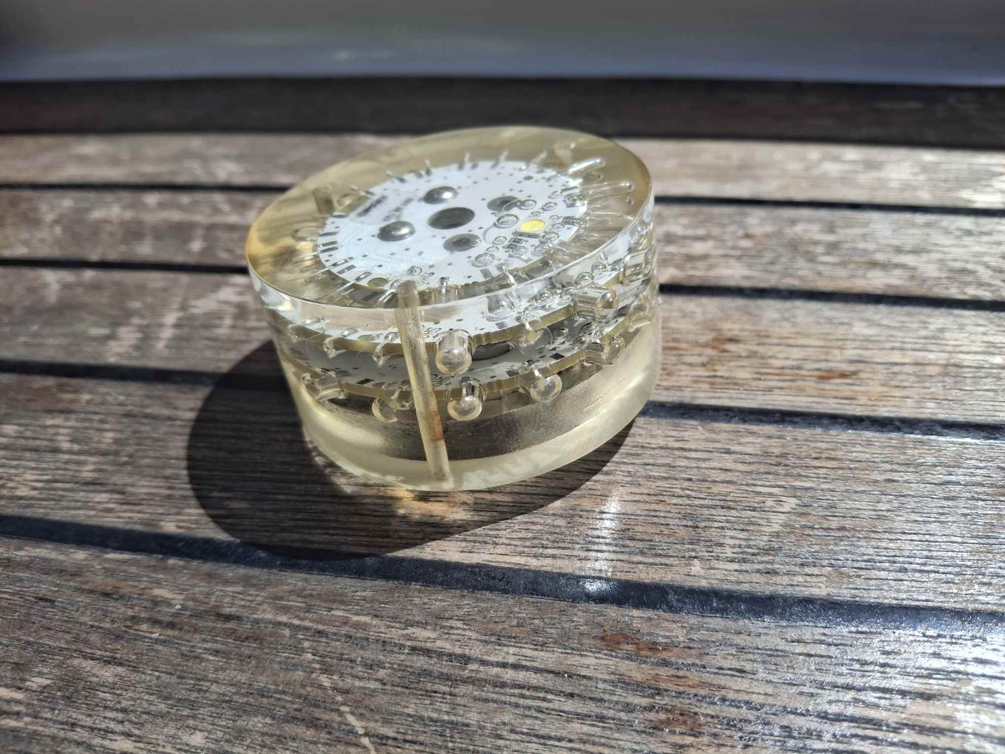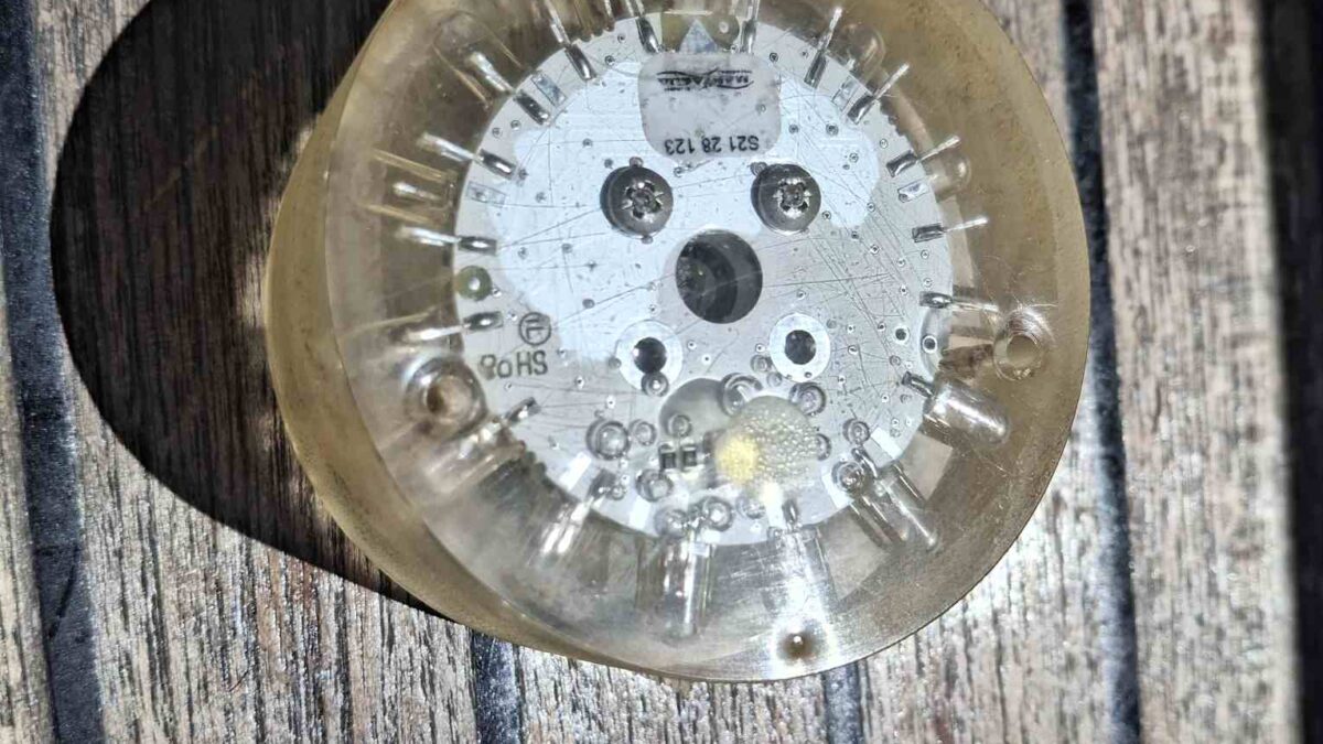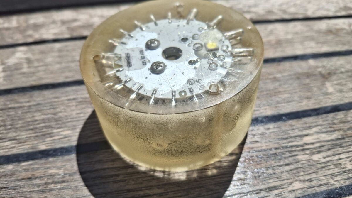 Eine wichtige Pendenz war – nebst dem “Verband” für das Genuafall – die Untersuchung unseres Ankerlichts im Masttop. Das schien plötzlich nicht mehr wirklich stark genug und war kaum mehr sichtbar. Bevor er ein neues bestellte, wollte der Skipper das Licht im Masttop mal kontrollieren. Mit der Elektrowinsch ist das Hinaufziehen heutzutage kein grosses Problem mehr für mich – auch nicht, wenn man dreimal hoch muss… Er montierte das Licht oben ab (das in dieser Variante neu ca. 300 € kostet) und brachte es ins Cockpit herunter. Wir staunten nicht schlecht: das Epoxy-Harz, in dem die LED-Lämpchen eingegossen sind, war nach 4 Jahren völlig erblindet.