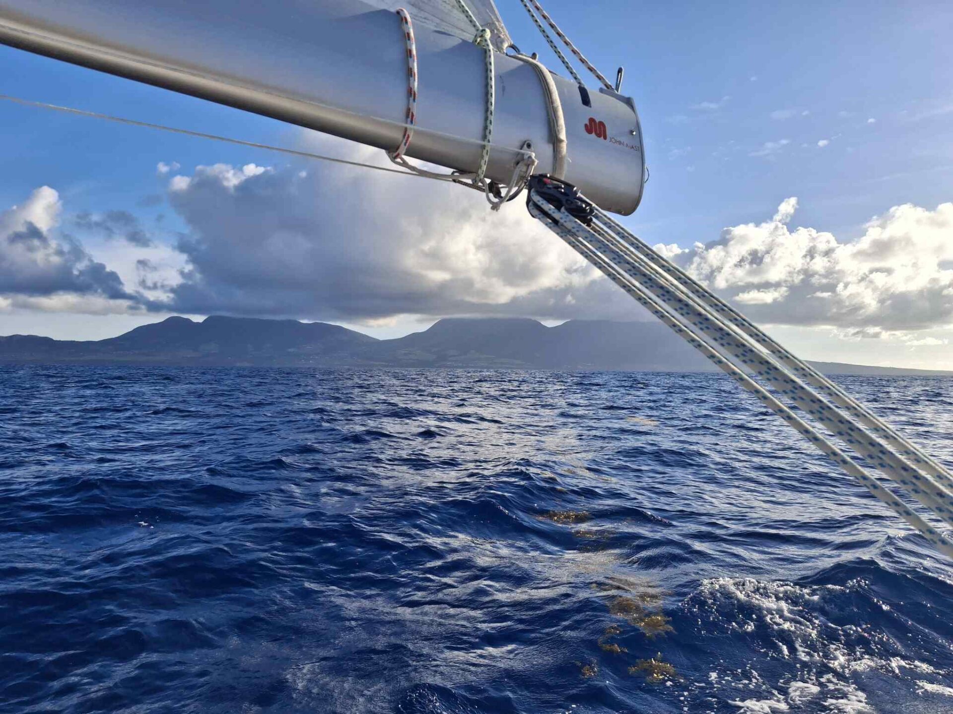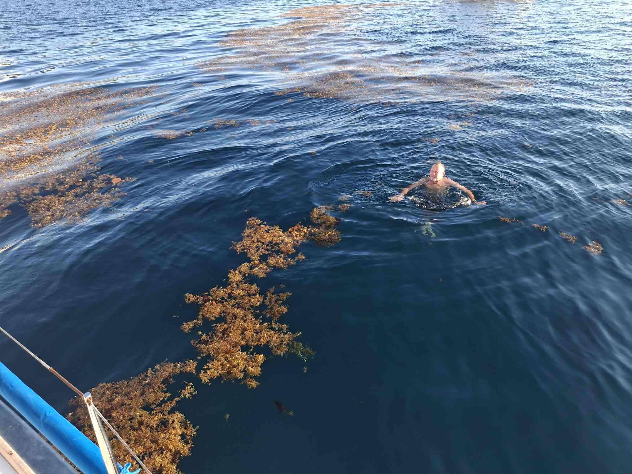 Unsere Windsteuerung Leonie hielt sea magiX mehr oder weniger auf Kurs, aber bald schon konnte sie ihre Irritation durch das stark auftretende Sargassogras nicht weiter verbergen und der neue Autopilot kam zum Zug. Der hielt uns bestens auf Kurs, wenn auch seinerseits herausgefordert durch das sehr leichtgängige Ruder von sea magiX. Wenn wenig Druck am Ruder liegt, dann schaukelt sich der Autopilot in ein lästiges Hin- und Herschwingen auf, das man nur auf zwei Arten verhindern kann: entweder mit dem Human Touch, d.h. leichtem Handauflegen, oder mit Hilfe eines Gummizuges, das dem Rad etwas Widerstand gibt, aber bei Bedarf einem grösseren Radausschlag nicht im Weg steht. Mit der Zeit hatten wir das System perfektioniert, damit der Gummi nicht ständig wegknallte (tut weh, wenn man sich gerade in der Nähe befindet und eins abkriegt! 😊) oder sea magiX am Abfallen hinderte, wenn gerade eine Bö kam. Es war jedoch zwei Nächte und 1.5 Tage lang sehr entspannt mit dem neuen Autopiloten – nie mussten wir befürchten, dass er plötzlich aussteigen könnte. Und auch seine Windsteuerung war einwandfrei. Wie wichtig es doch ist, dass die zentralen Instrumente an Bord richtig funktionieren! Die lange Reise des Autopiloten, via Gians Handgepäck in die Schweiz, dort per Bahnhofsübergabe zu uns nach Hause und dann wieder mit Alexandras Sachen zurück nach Puerto Rico hat sich eindeutig gelohnt. Nochmals ein grosses Merci an alle Beteiligten!