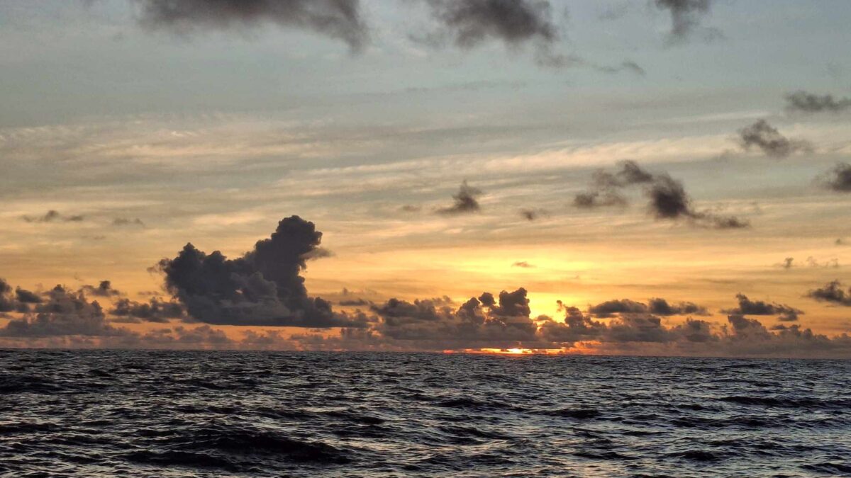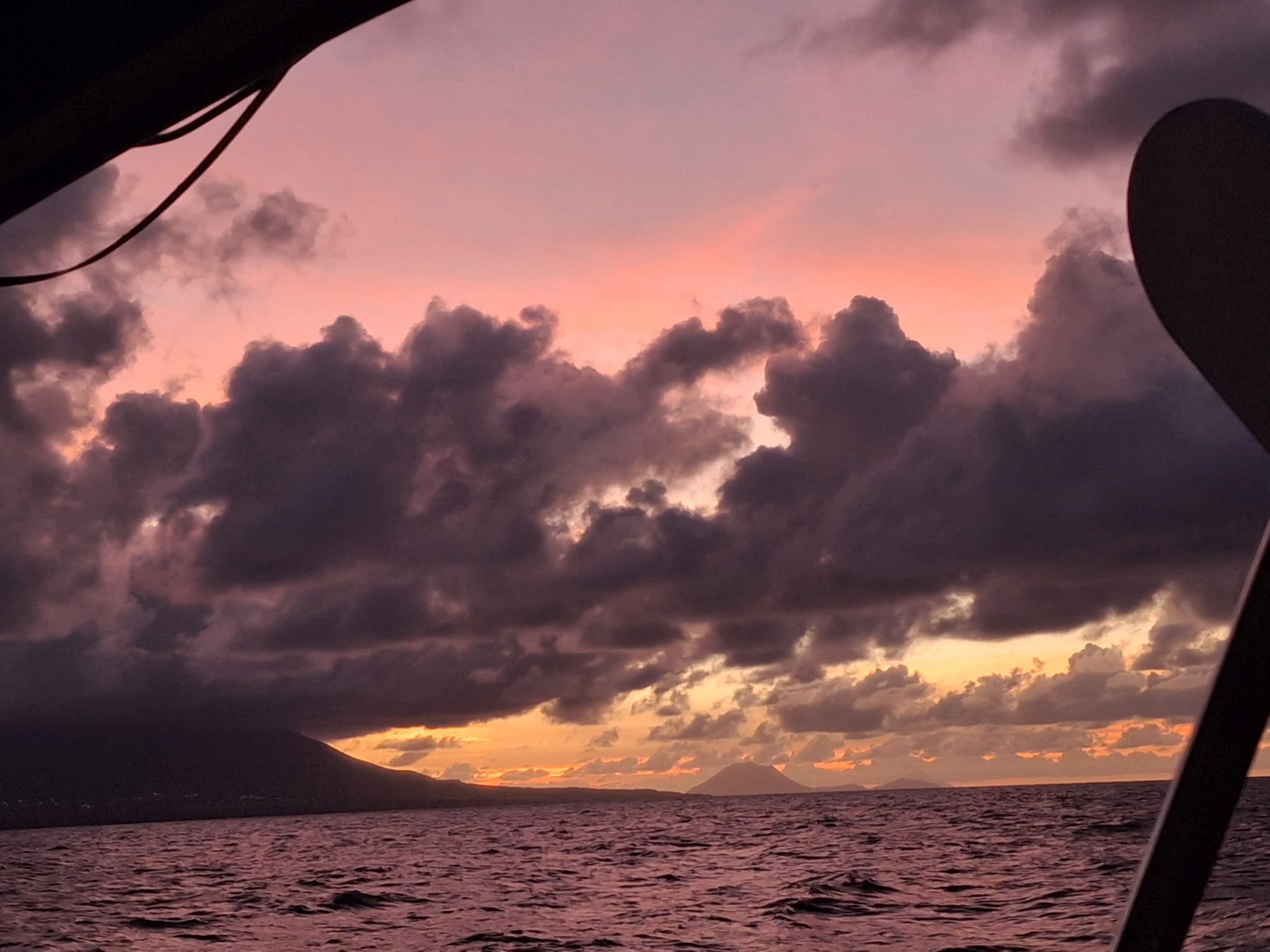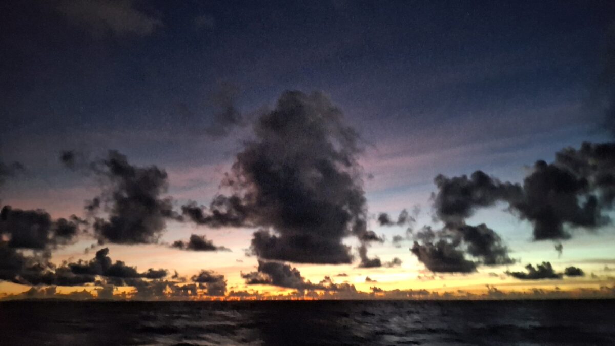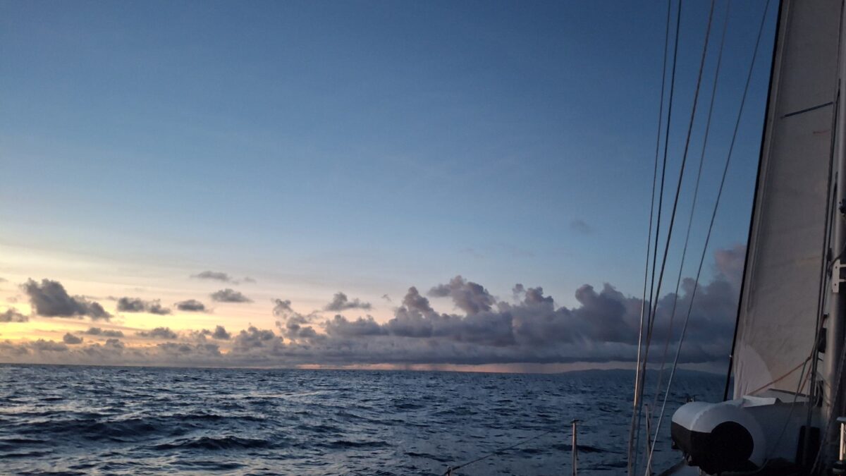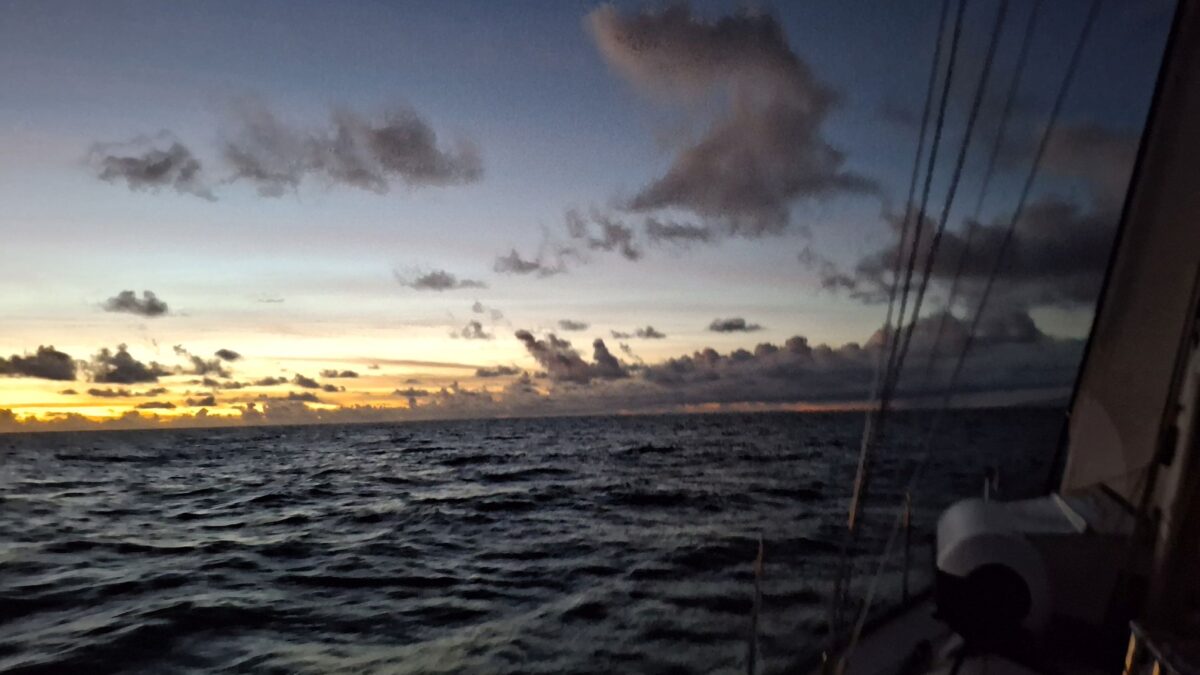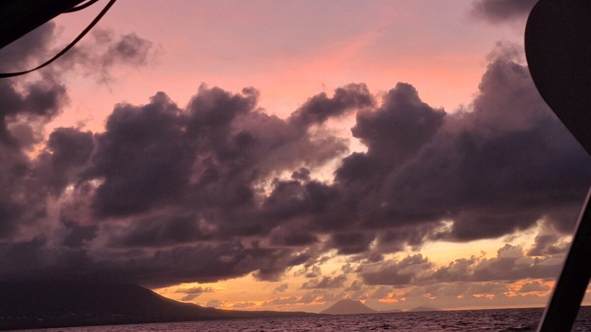 Kaum hatte es am Mittwochabend eingedunkelt, als das Wetter plötzlich unfreundlicher wurde. Die Wolken zogen sich zusammen und im Nu waren wir mitten in einem heftigen Squall. In Sekunden nahm der Wind von 8-12 Knoten auf 18-24 Knoten zu. Auf Amwindkursen reduzieren wir die Segelfläche normalerweise ab etwa 14 Knoten Wind… sea magiX legte sich auf die Seite, der Autopilot zog seinen Gummi lang, bis der mit einem gequälten Quietsch-Knall nachgab, und schon waren wir mit mehr als 7 Knoten Fahrt auf einem etwas höheren Kurs als vorher unterwegs… Inzwischen war auch der Regen da, bzw. die Regenwand und wiedereinmal sah man nicht mehr bis zum Bug unseres kleinen Schiffes. Mit weit aufgefiertem (frei gegebenem) Grosssegel rauschten wir südostwärts, froh, dass unser neuer Autopilot so unbeeindruckt weiter steuerte. Trotzdem hatte ich den Skipper aus der Koje geholt – mir war es unheimlich, bei so viel Wind mit Vollbesegelung unterwegs zu sein. Bänz, leicht schlaftrunken im Niedergang hängend, meinte mit seinem grossen Urvertrauen in unser braves Boot nur „das geht vorbei, das chunnt scho guet“. Und so wars dann auch. Nach einer wilden halben Stunde konnte ich die Segel schon wieder etwas passender einstellen und nach nochmals 30 Minuten war der gröbste Spuk und vor allem der Regen vorbei, ohne dass Segel oder Boot zu Schaden gekommen wären. Wir nutzten die Regenpause, um jetzt das Vorsegel zu verkleinern, und waren ab dann mit einmal gereffter Genua und noch immer dem vollen Gross für alle Wahrscheinlichkeiten gewappnet. Die Nacht blieb unruhig, mit anderem Wind unter jedem Wölkchen, aber die Änderungen blieben im mit dieser Besegelung gut verträglichen Rahmen. Und unser Autopilot steuerte brav, ohne jeden Muckser, inzwischen an Montserrat vorbei auf Guadeloupe zu. Morgens liess der Wind wie vom Wetterbericht angekündigt nach auf ein leises Lüftchen. Wieder konnte ich fasziniert das Farbenspiel am Himmel beobachten; diesmal für den Sonnenaufgang.