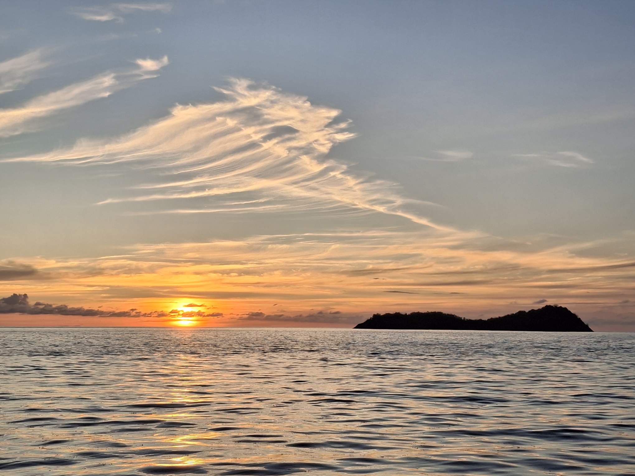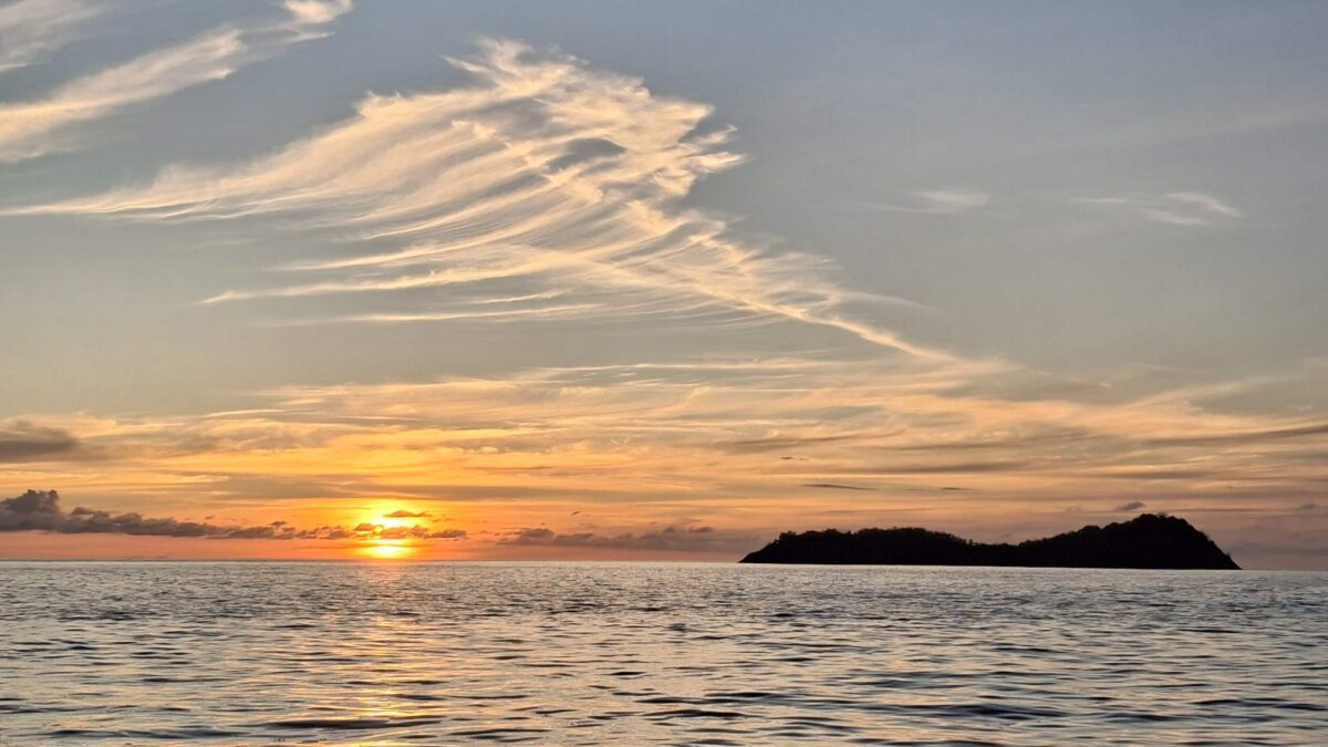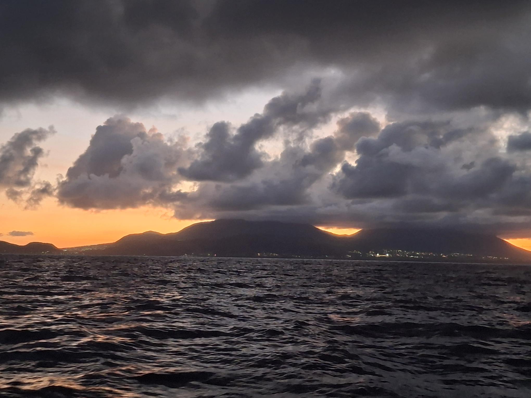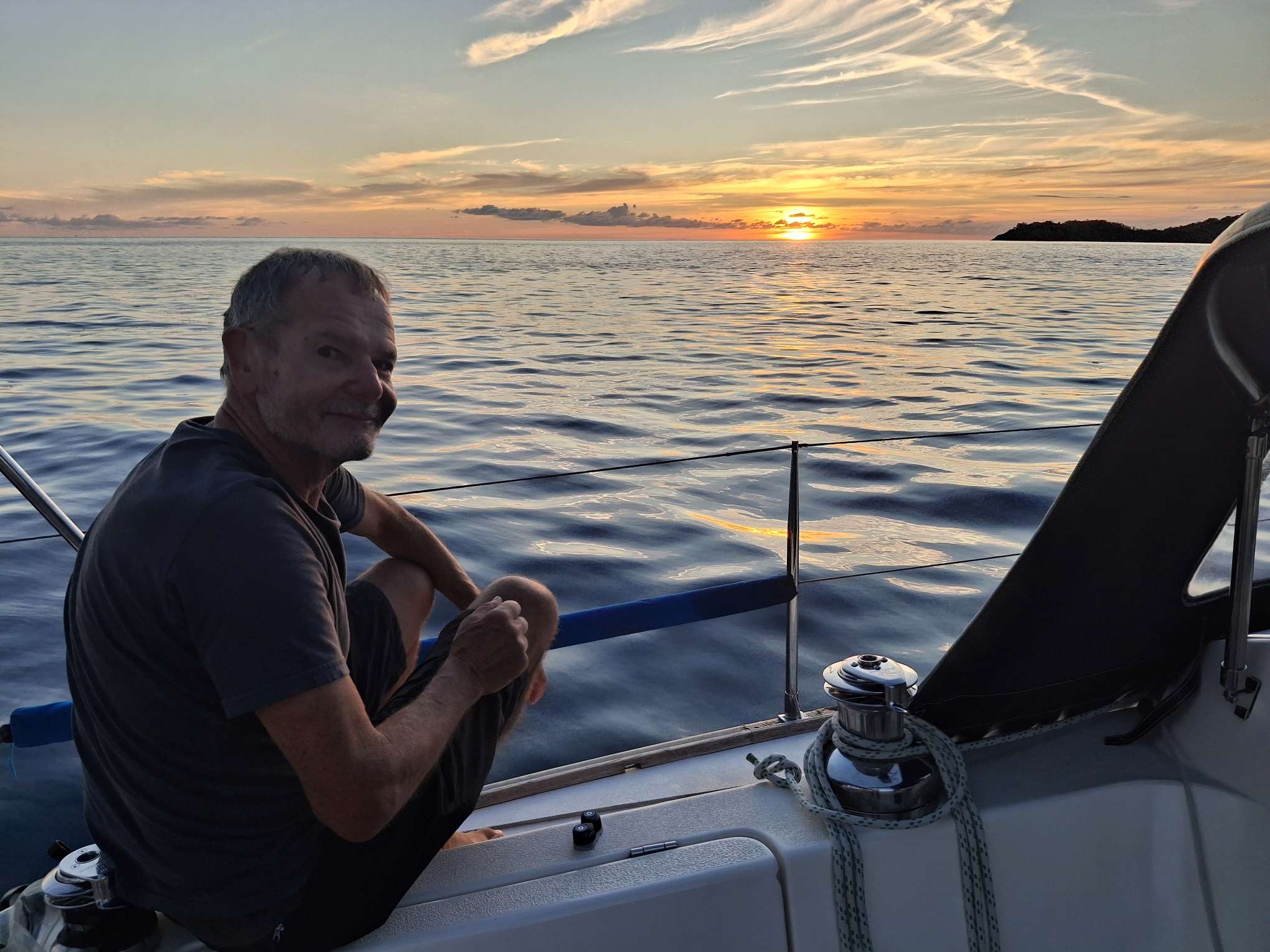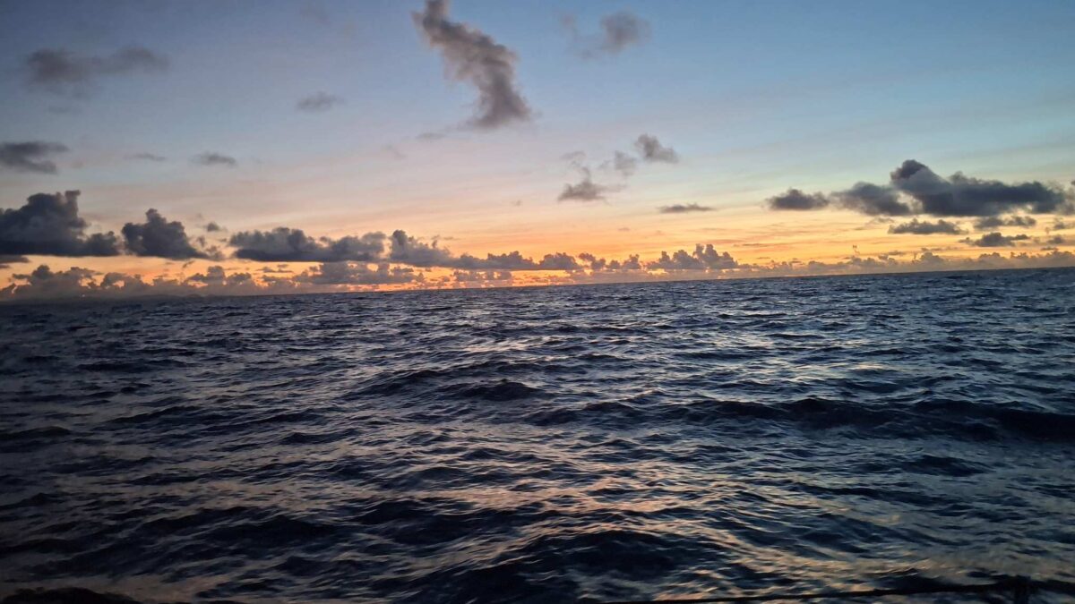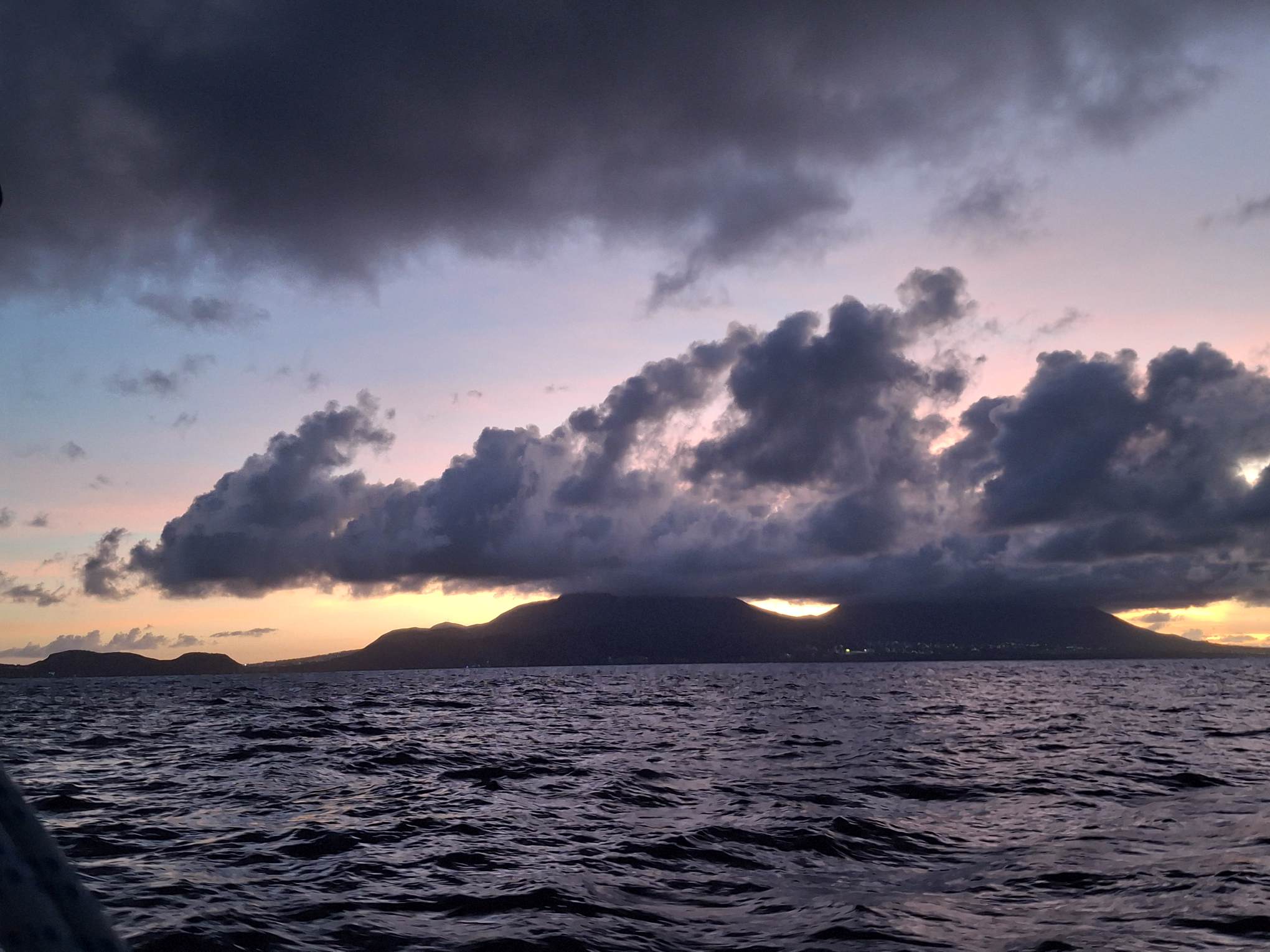 Kaum hatte es am Mittwochabend eingedunkelt, als das Wetter plötzlich unfreundlicher wurde. Die Wolken zogen sich zusammen und im Nu waren wir mitten in einem heftigen Squall. In Sekunden nahm der Wind von 8-12 Knoten auf 18-24 Knoten zu. Auf Amwindkursen reduzieren wir die Segelfläche normalerweise ab etwa 14 Knoten Wind… sea magiX legte sich auf die Seite, der Autopilot zog seinen Gummi lang, bis der mit einem gequälten Quietsch-Knall nachgab, und schon waren wir mit mehr als 7 Knoten Fahrt auf einem etwas höheren Kurs als vorher unterwegs… Inzwischen war auch der Regen da, bzw. die Regenwand und wiedereinmal sah man nicht mehr bis zum Bug unseres kleinen Schiffes. Mit weit aufgefiertem (frei gegebenem) Grosssegel rauschten wir südostwärts, froh, dass unser neuer Autopilot so unbeeindruckt weiter steuerte. Trotzdem hatte ich den Skipper aus der Koje geholt – mir war es unheimlich, bei so viel Wind mit Vollbesegelung unterwegs zu sein. Bänz, leicht schlaftrunken im Niedergang hängend, meinte mit seinem grossen Urvertrauen in unser braves Boot nur „das geht vorbei, das chunnt scho guet“. Und so wars dann auch. Nach einer wilden halben Stunde konnte ich die Segel schon wieder etwas passender einstellen und nach nochmals 30 Minuten war der gröbste Spuk und vor allem der Regen vorbei, ohne dass Segel oder Boot zu Schaden gekommen wären. Wir nutzten die Regenpause, um jetzt das Vorsegel zu verkleinern, und waren ab dann mit einmal gereffter Genua und noch immer dem vollen Gross für alle Wahrscheinlichkeiten gewappnet. Die Nacht blieb unruhig, mit anderem Wind unter jedem Wölkchen, aber die Änderungen blieben im mit dieser Besegelung gut verträglichen Rahmen. Und unser Autopilot steuerte brav, ohne jeden Muckser, inzwischen an Montserrat vorbei auf Guadeloupe zu. Morgens liess der Wind wie vom Wetterbericht angekündigt nach auf ein leises Lüftchen. Wieder konnte ich fasziniert das Farbenspiel am Himmel beobachten; diesmal für den Sonnenaufgang.