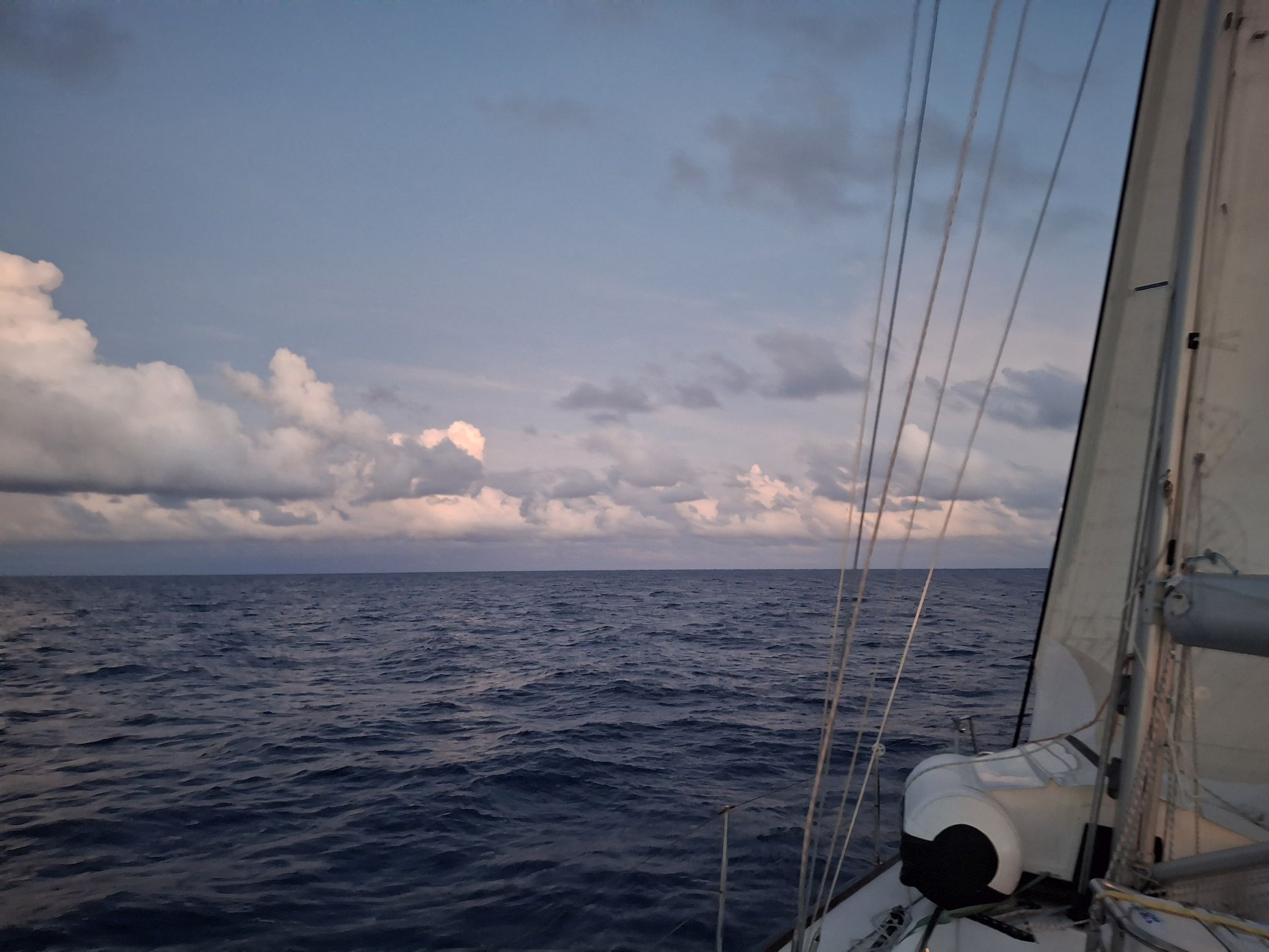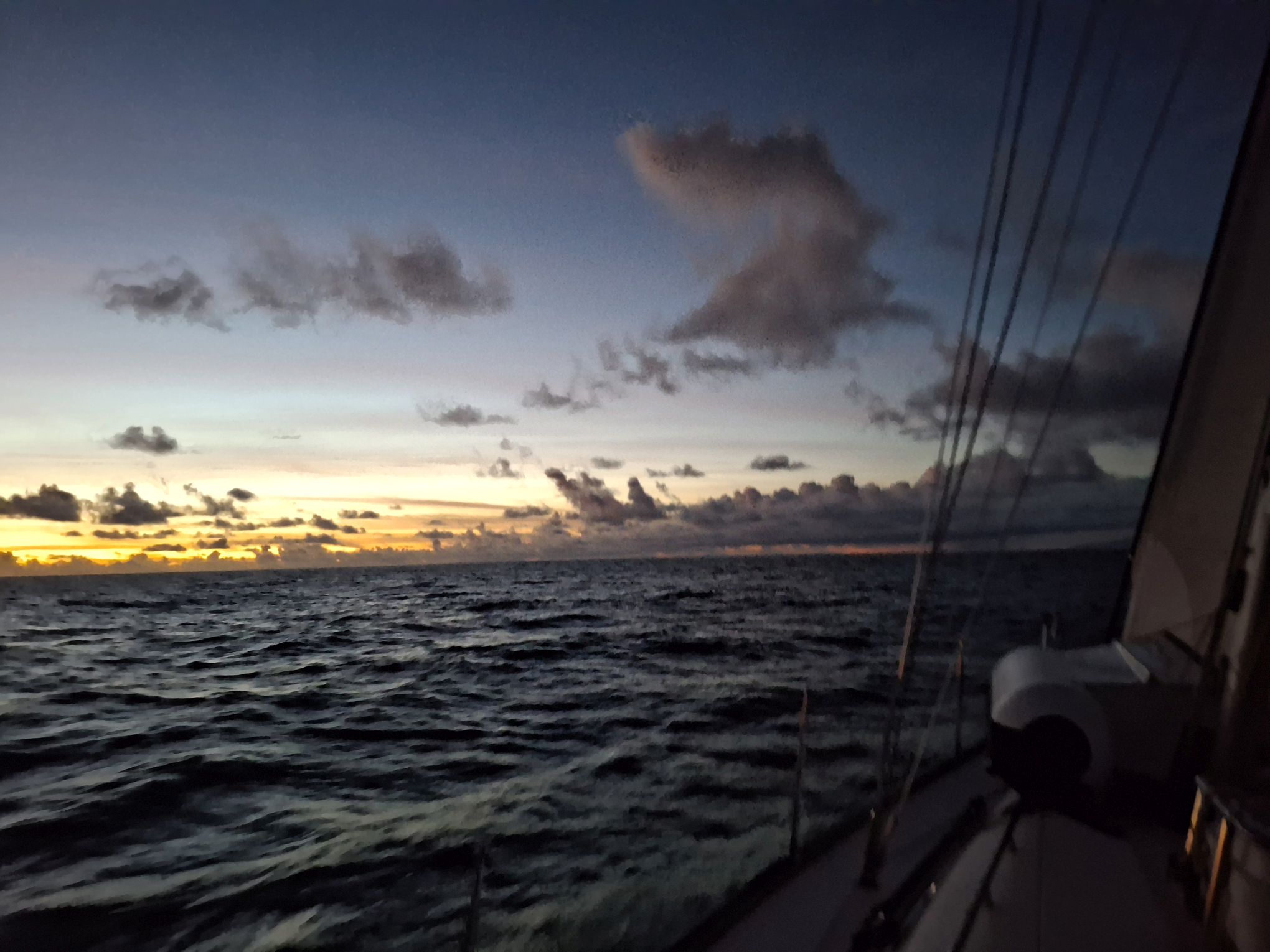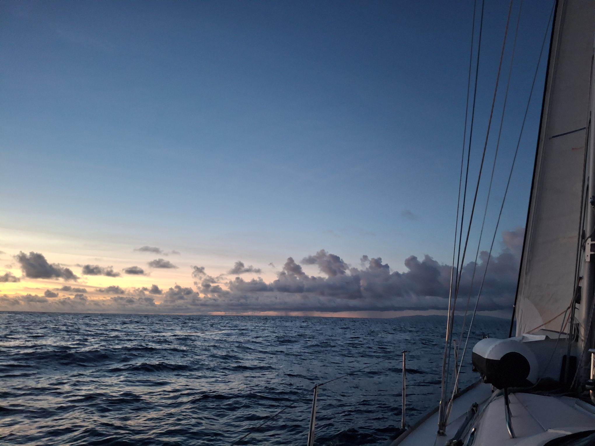 Da hier in diesem Monaten der Ostwind üblicherweise stark bläst, und meistens eine leichte Süd-Komponente enthält, wollten wir diese Chance nutzen. Unser Weg zurück nach Trinidad führte von Puerto Rico aus eben nach Südosten. Gegen 17 Uhr am Dienstag ging es deshalb los, hinaus aus dem schönen Sound und nachdem wir die Südost-Spitze von Virgin Gorda erreicht hatten, mit voller Besegelung, dem Sonnenuntergang im Rücken und viel weitem Horizont vor dem Bug in die pastellfarbene Abendstimmung.