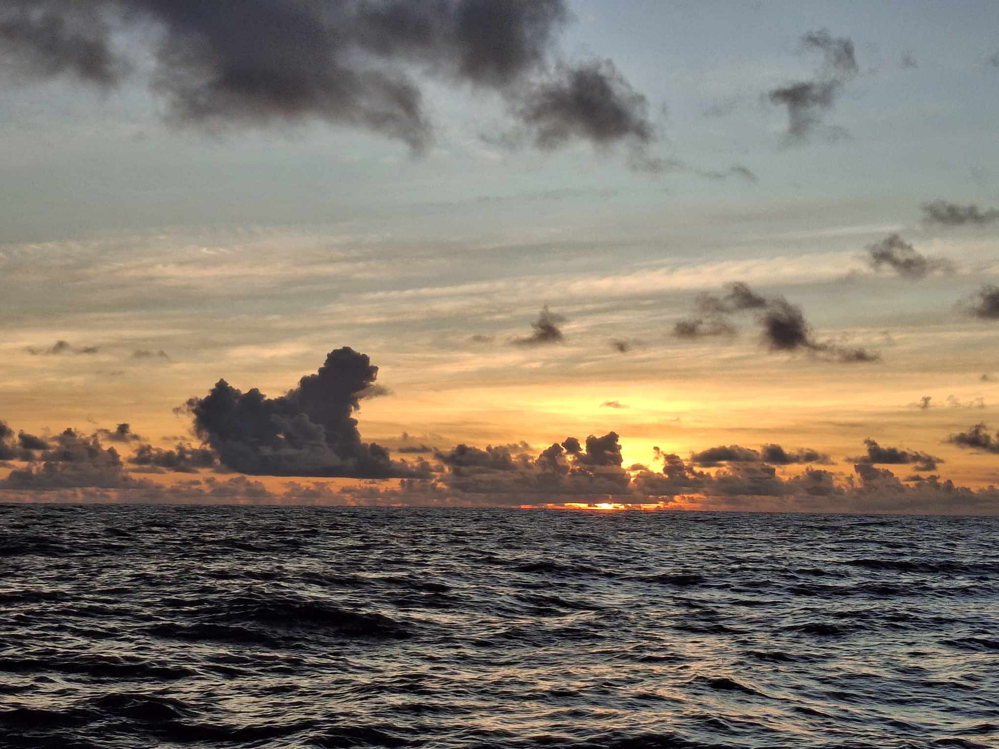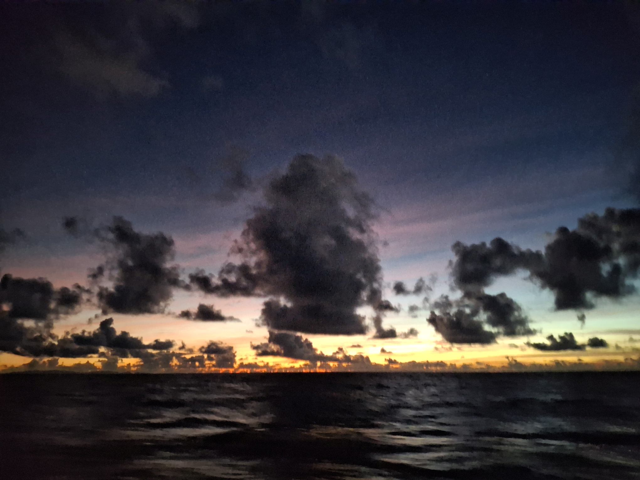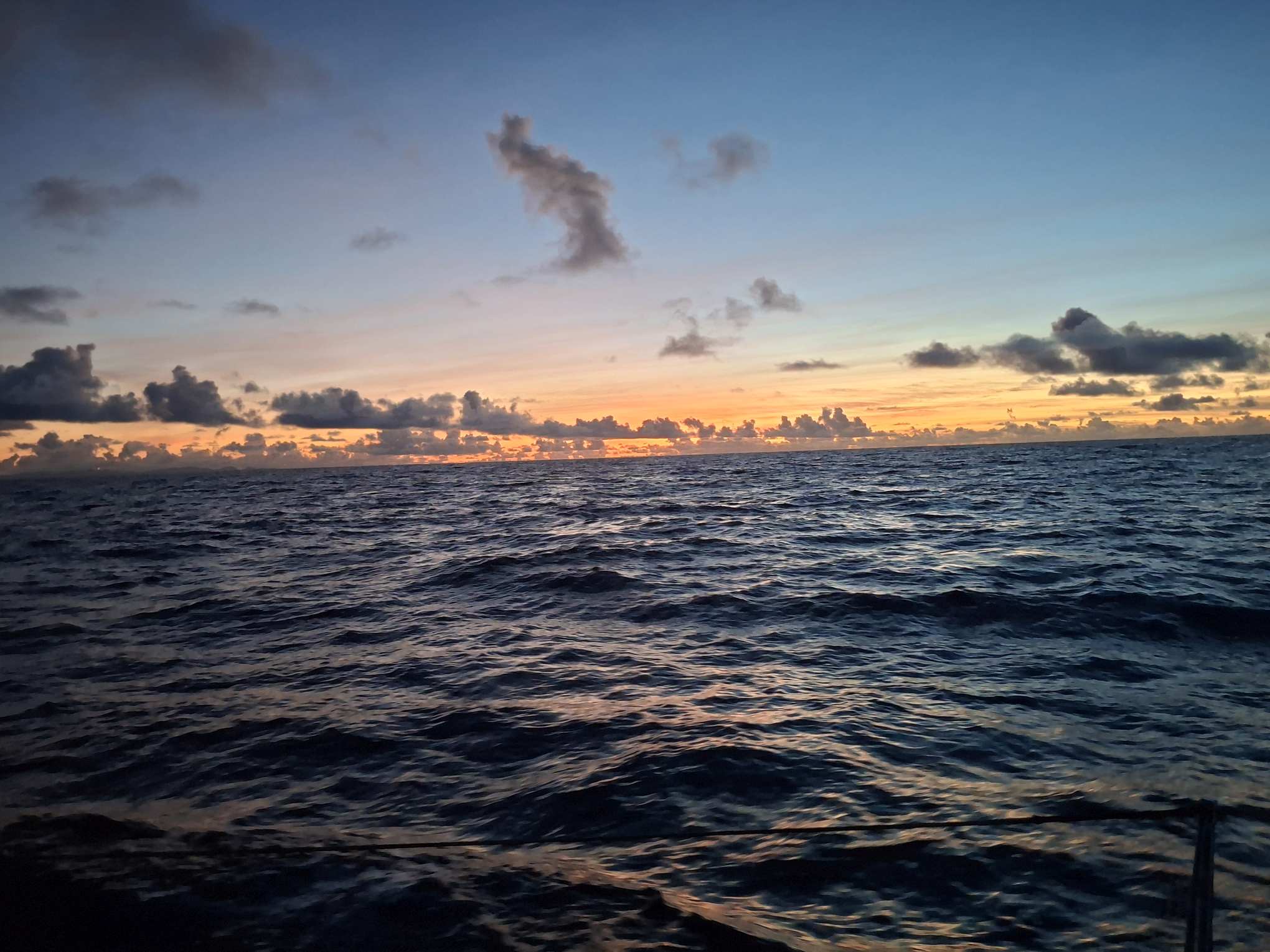 Da hier in diesem Monaten der Ostwind üblicherweise stark bläst, und meistens eine leichte Süd-Komponente enthält, wollten wir diese Chance nutzen. Unser Weg zurück nach Trinidad führte von Puerto Rico aus eben nach Südosten. Gegen 17 Uhr am Dienstag ging es deshalb los, hinaus aus dem schönen Sound und nachdem wir die Südost-Spitze von Virgin Gorda erreicht hatten, mit voller Besegelung, dem Sonnenuntergang im Rücken und viel weitem Horizont vor dem Bug in die pastellfarbene Abendstimmung.