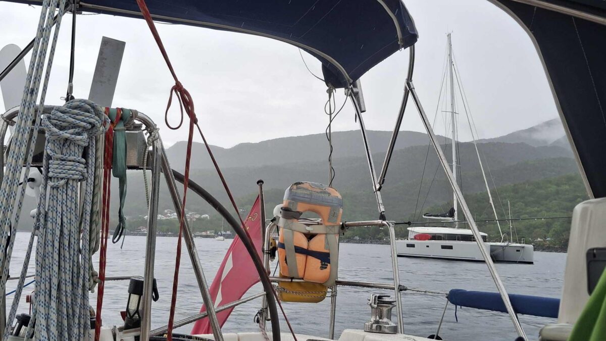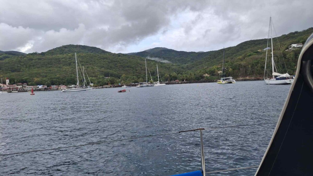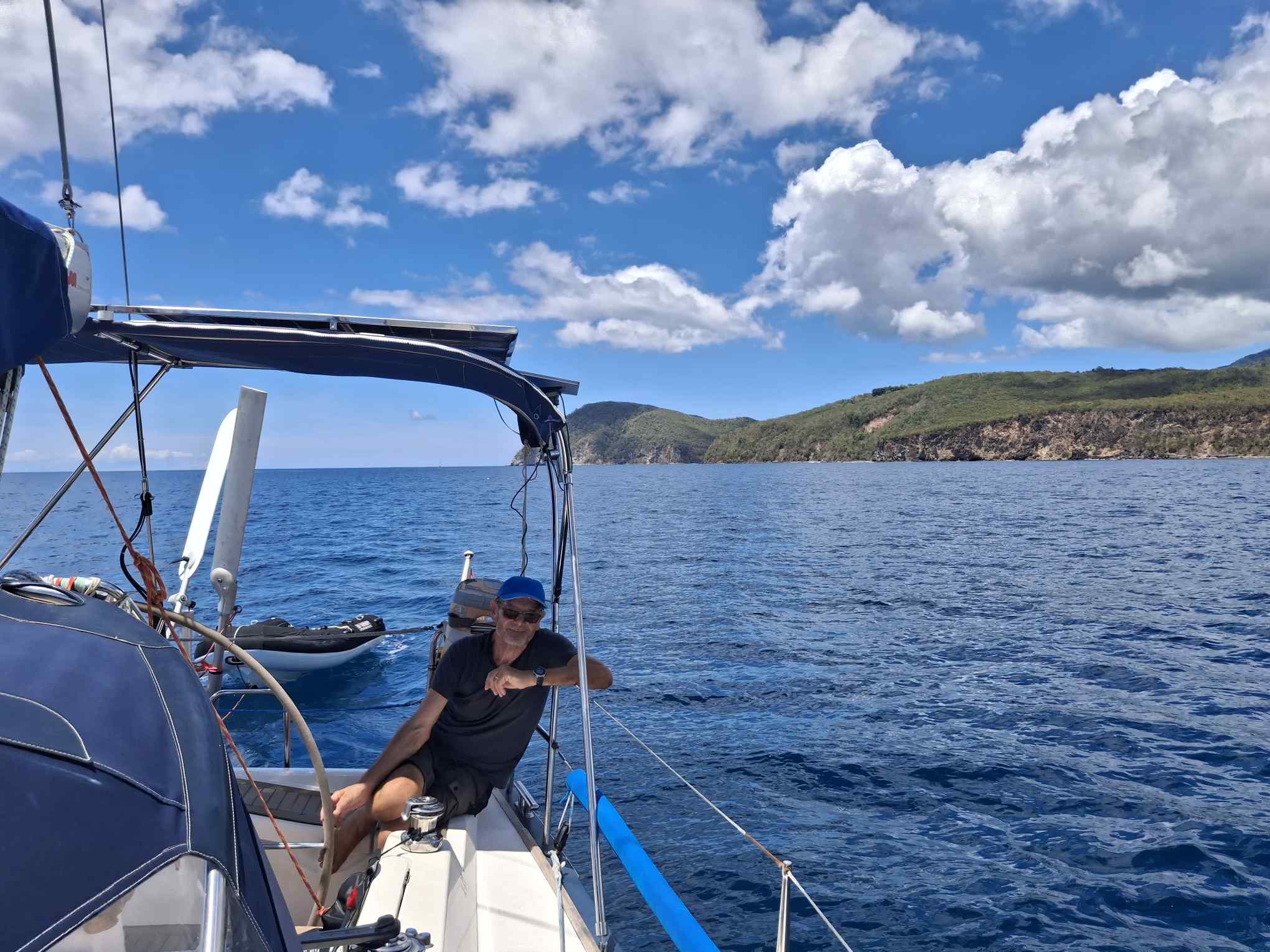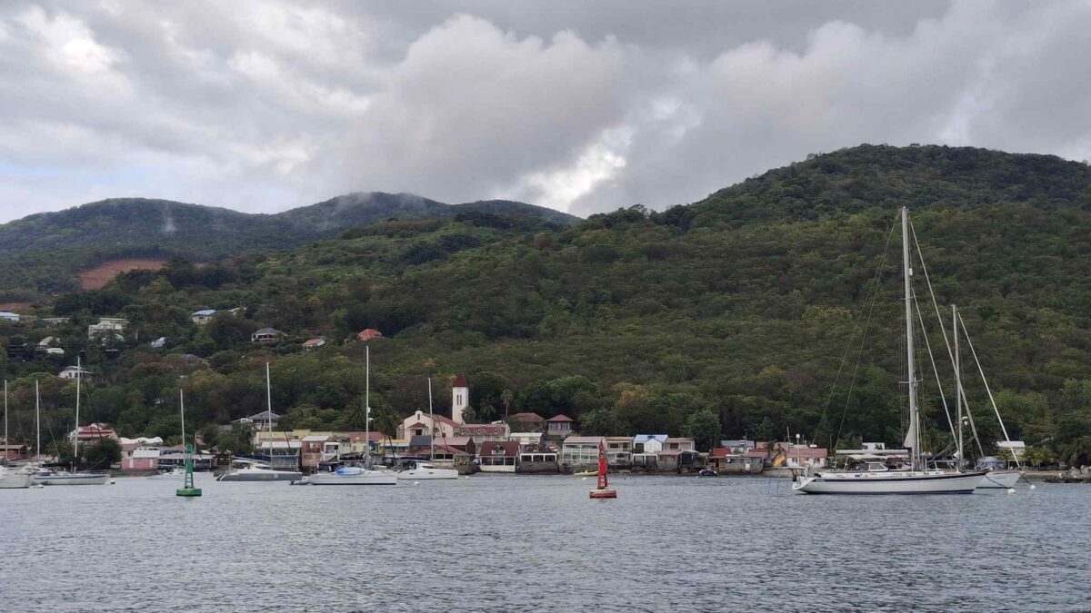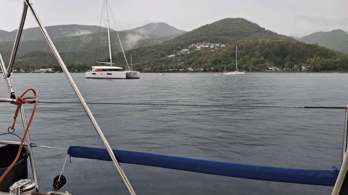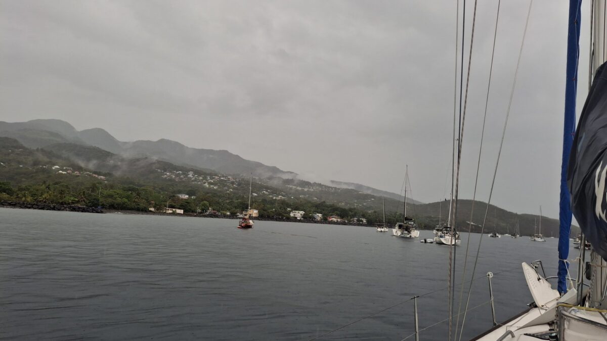 Im schönsten Sonnenschein tümpelten wir gemütlich nach Deshaies und brauchten für die letzten 15 SM fast einen halben Tag. Über Guadeloupe hing eine dicke Regenwolke, der wir Zeit geben wollten, sich zu verziehen. Und da mein nächster Arbeitstermin erst am nächsten Vormittag war, hatten wir nicht die geringste Eile, dort im Regen anzukommen. In aller Ruhe konnten wir nochmals ein Stündchen schlafen, unser Morgenmüesli geniessen, lesen, mit diesem Bericht anfangen und in den Tag hineinträumen.