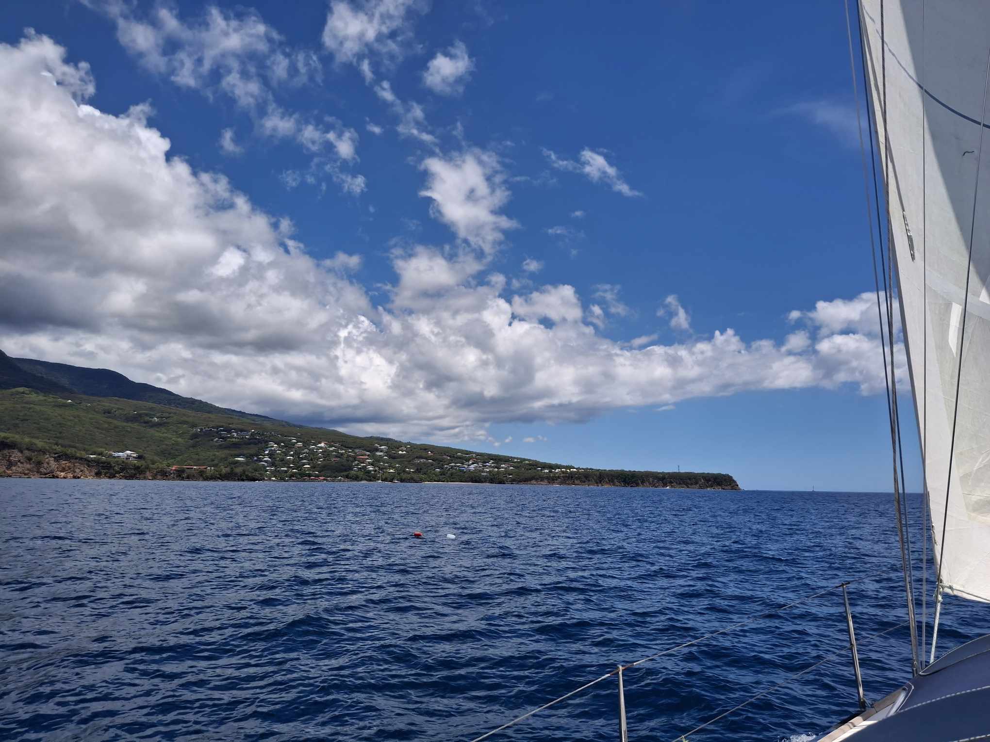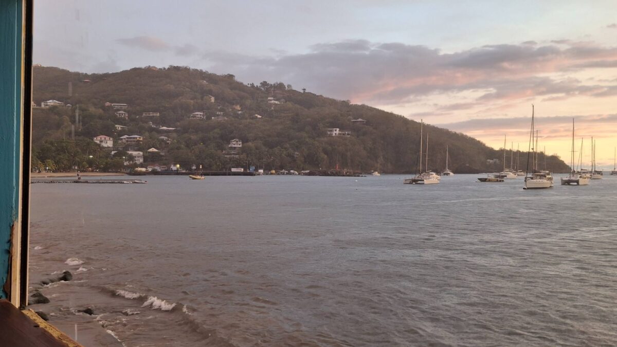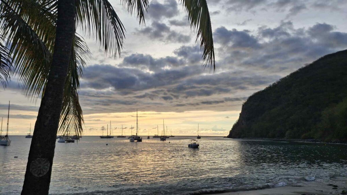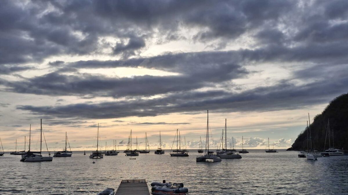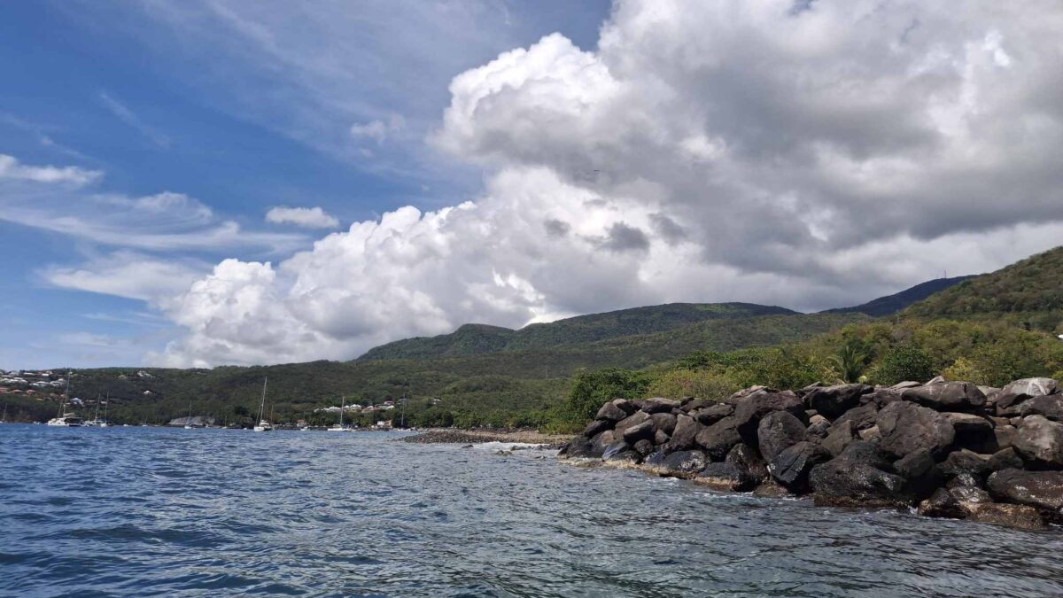 Im schönsten Sonnenschein tümpelten wir gemütlich nach Deshaies und brauchten für die letzten 15 SM fast einen halben Tag. Über Guadeloupe hing eine dicke Regenwolke, der wir Zeit geben wollten, sich zu verziehen. Und da mein nächster Arbeitstermin erst am nächsten Vormittag war, hatten wir nicht die geringste Eile, dort im Regen anzukommen. In aller Ruhe konnten wir nochmals ein Stündchen schlafen, unser Morgenmüesli geniessen, lesen, mit diesem Bericht anfangen und in den Tag hineinträumen.