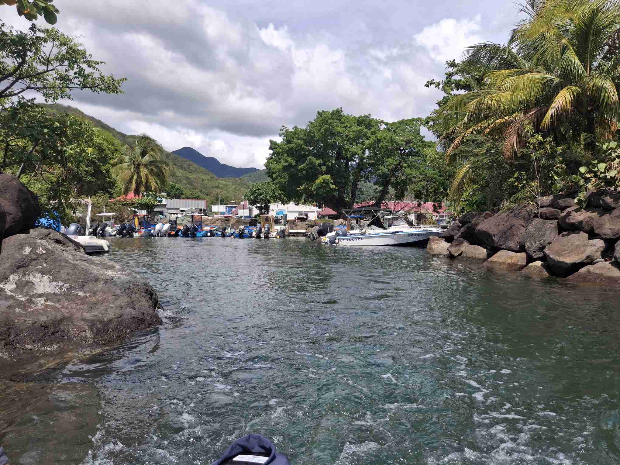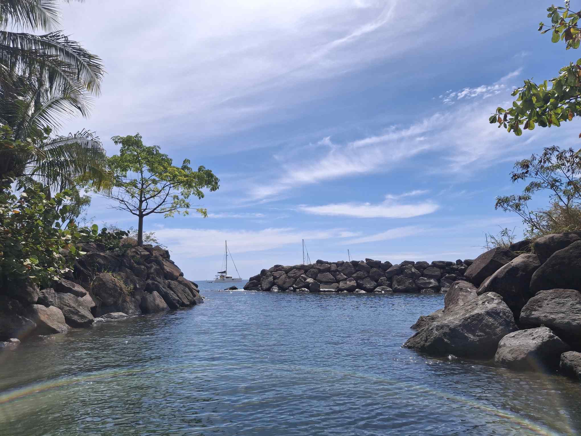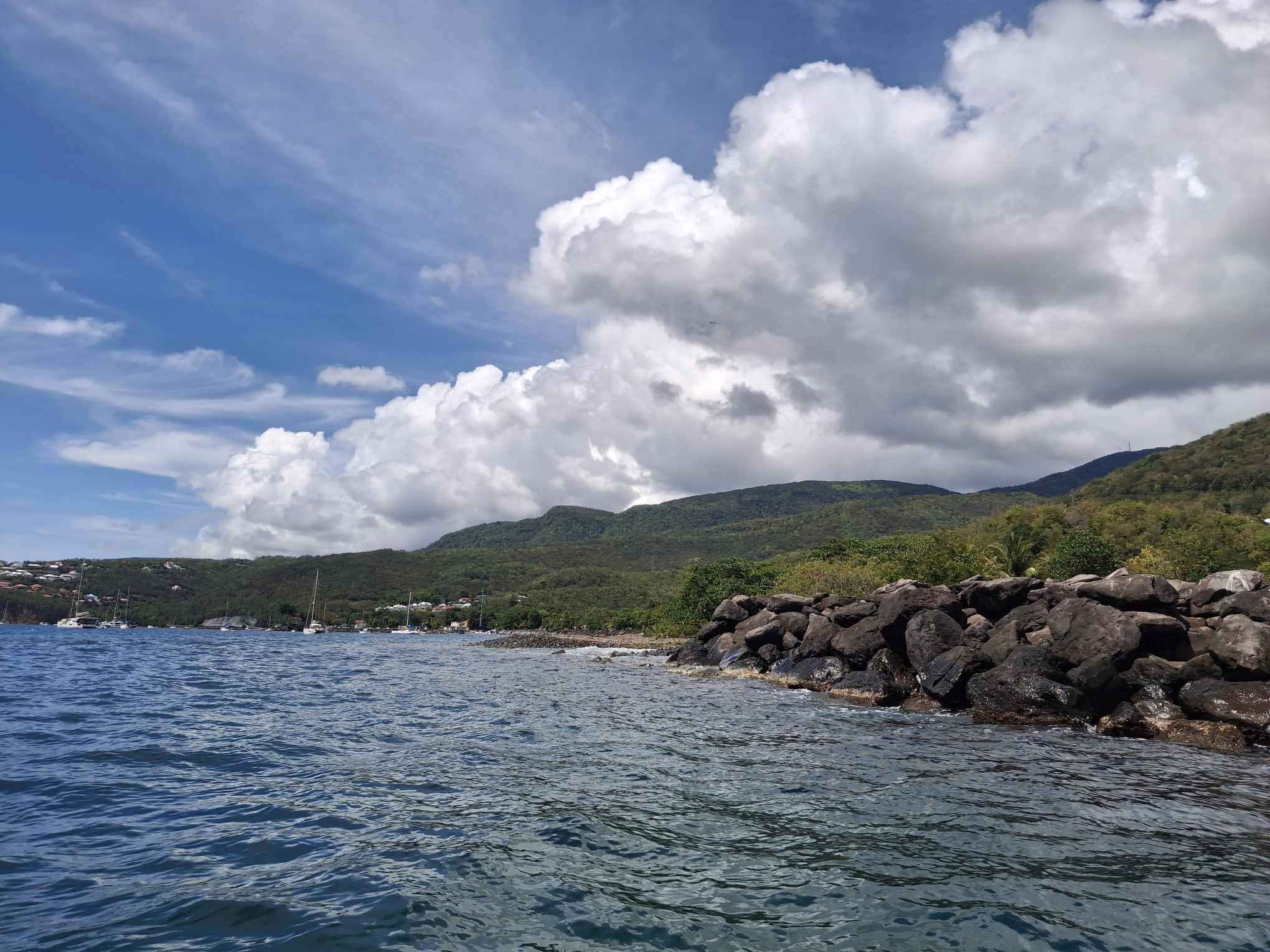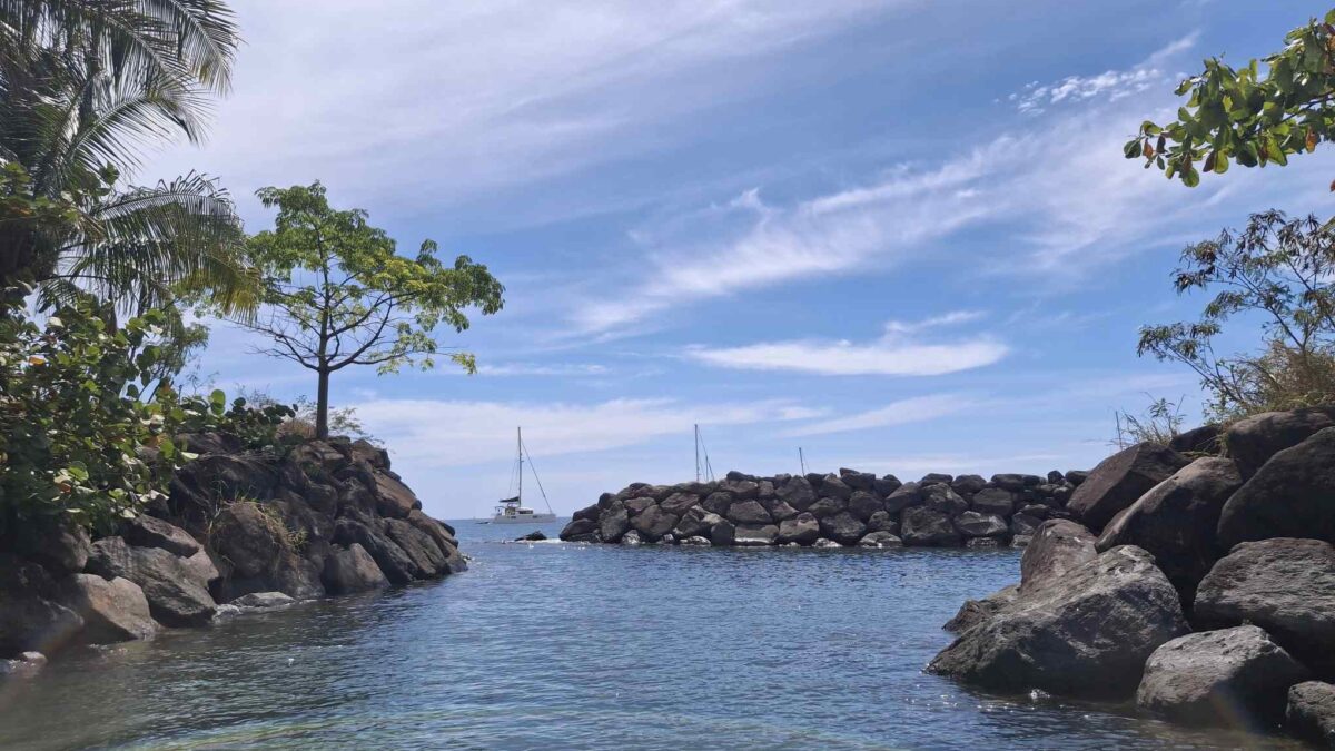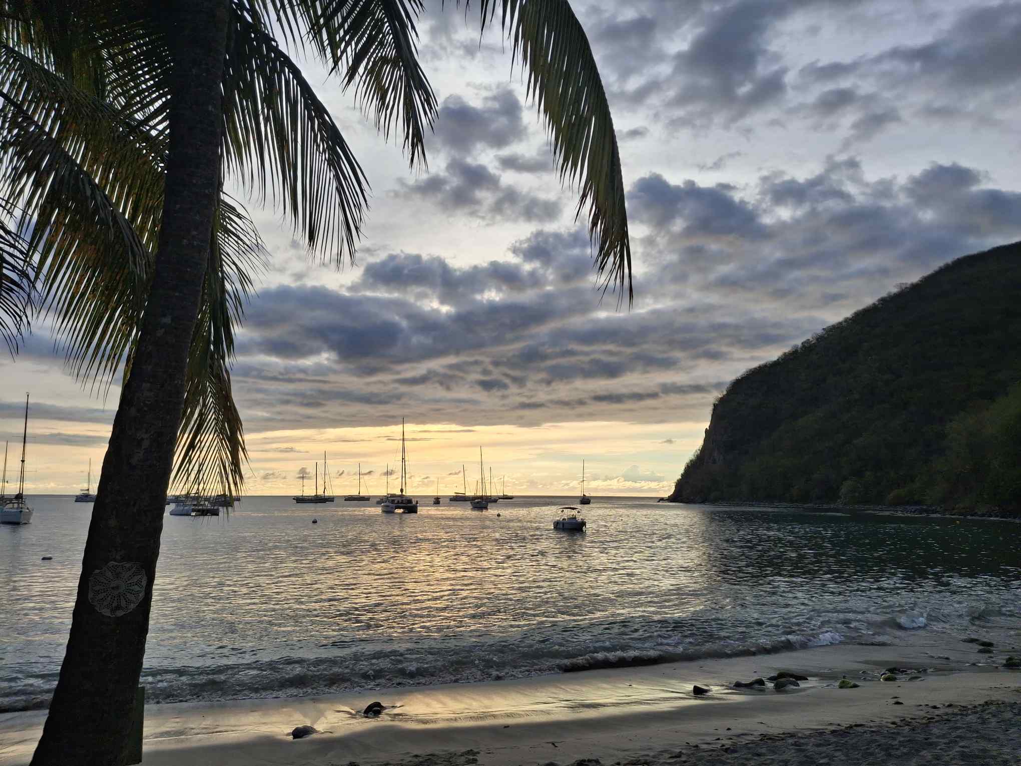 Im schönsten Sonnenschein tümpelten wir gemütlich nach Deshaies und brauchten für die letzten 15 SM fast einen halben Tag. Über Guadeloupe hing eine dicke Regenwolke, der wir Zeit geben wollten, sich zu verziehen. Und da mein nächster Arbeitstermin erst am nächsten Vormittag war, hatten wir nicht die geringste Eile, dort im Regen anzukommen. In aller Ruhe konnten wir nochmals ein Stündchen schlafen, unser Morgenmüesli geniessen, lesen, mit diesem Bericht anfangen und in den Tag hineinträumen.