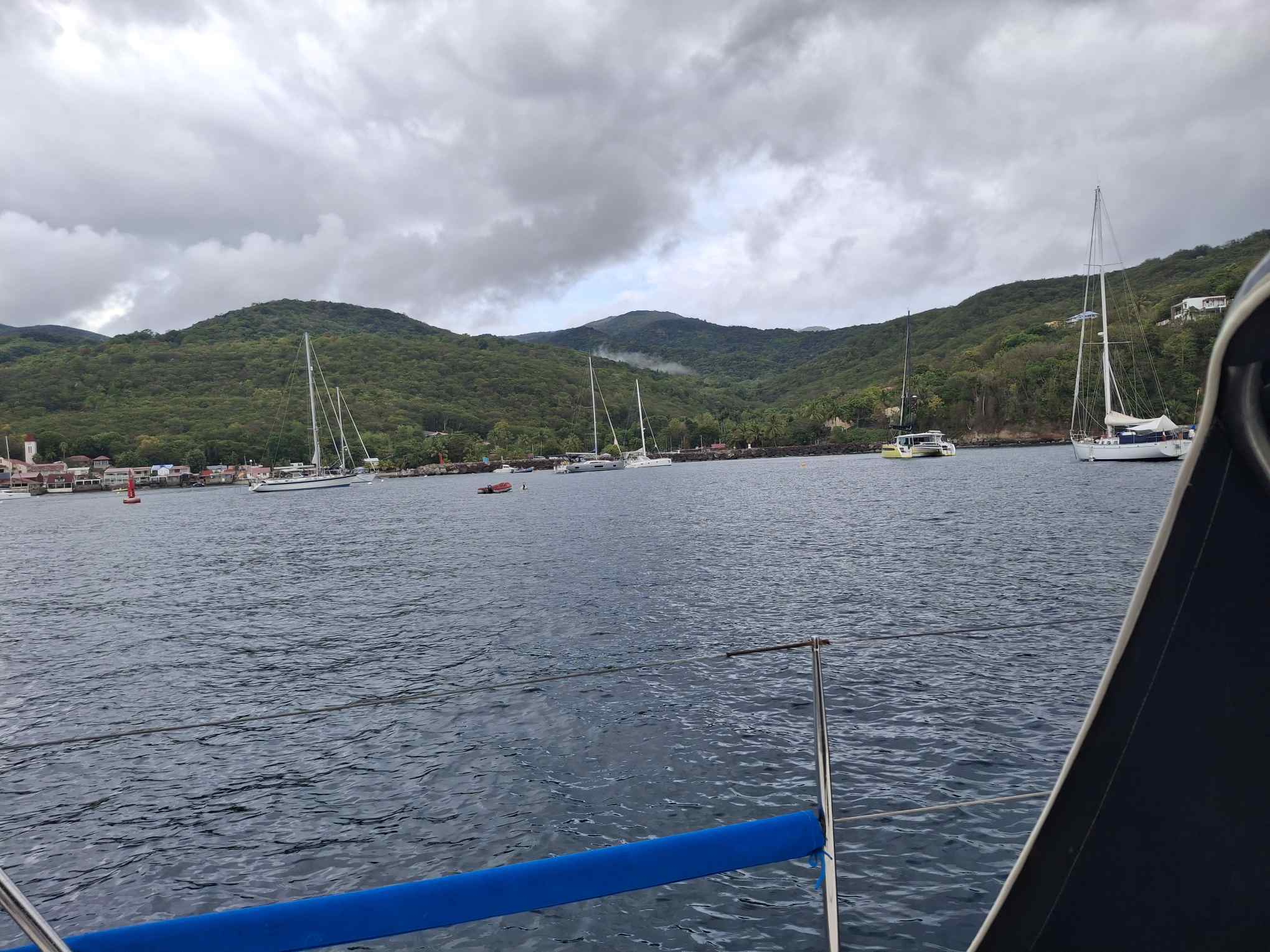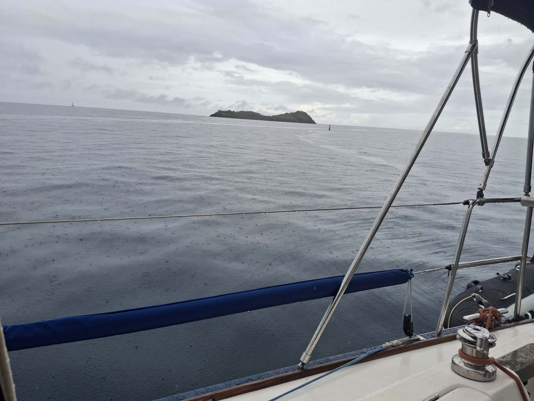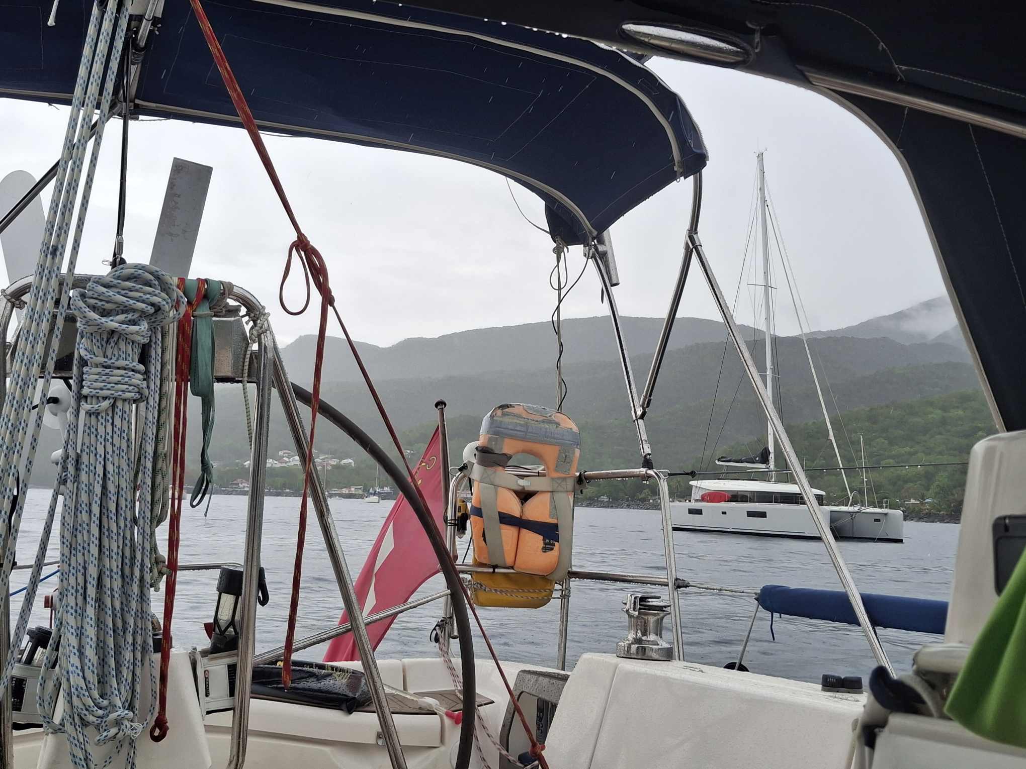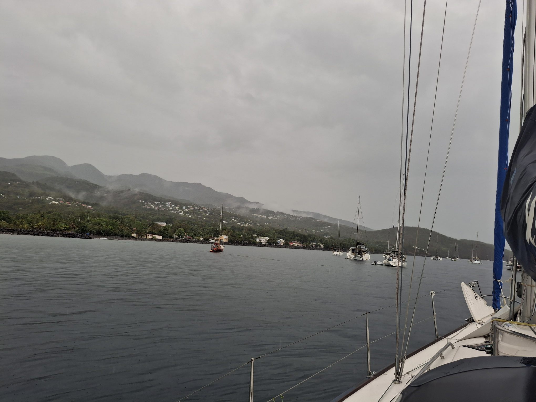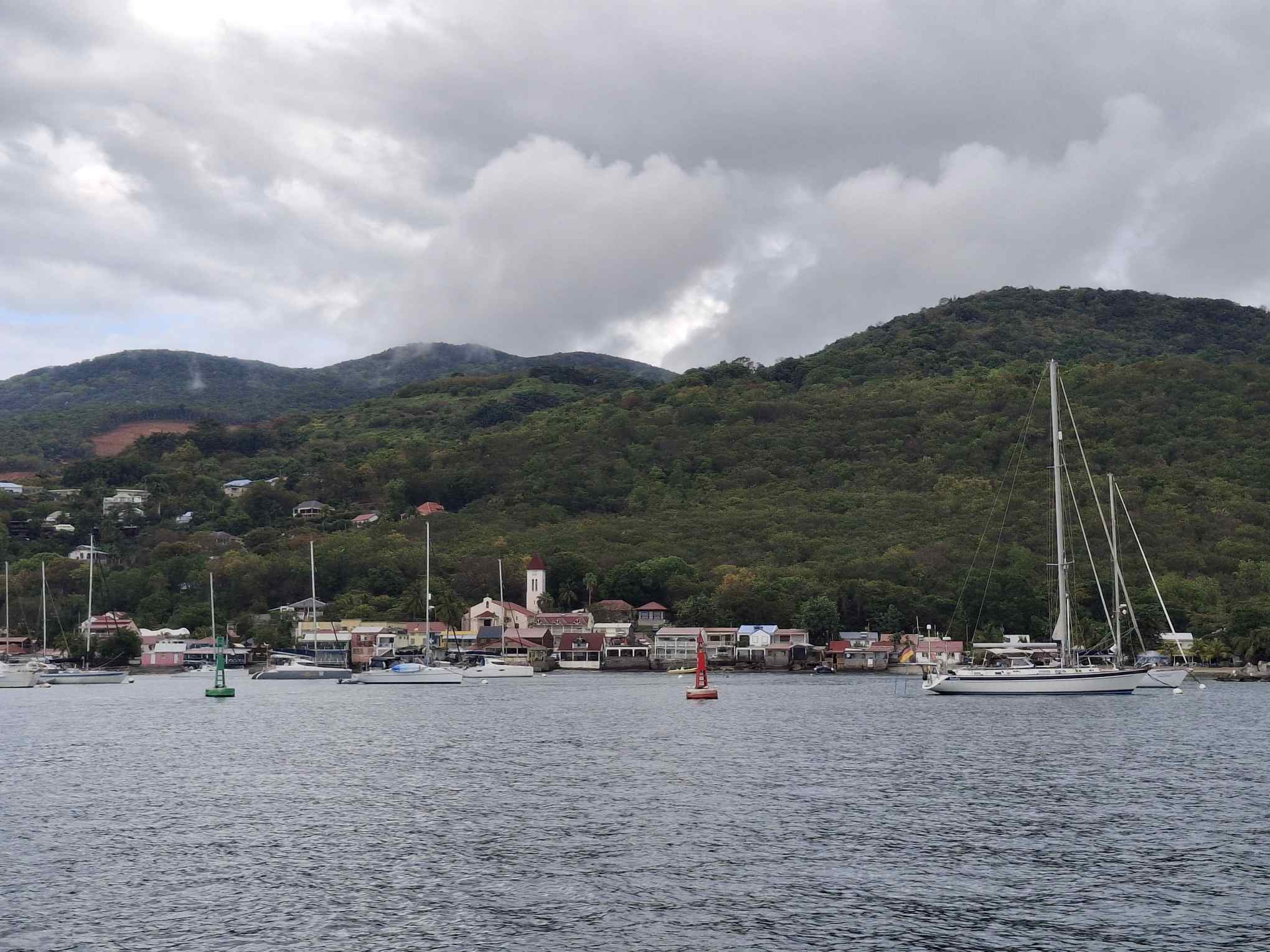 Do., 23. April: Es sind noch 3.5 SM und dann sind wir da; zurück auf Guadeloupe. Vor uns liegt Deshaies, das sich gerade in einen Regenschauer hüllt. Hinter uns zwei Nächte und 1.5 Tage mit ca. 220SM ab Virgin Gorda auf den BVIs.
