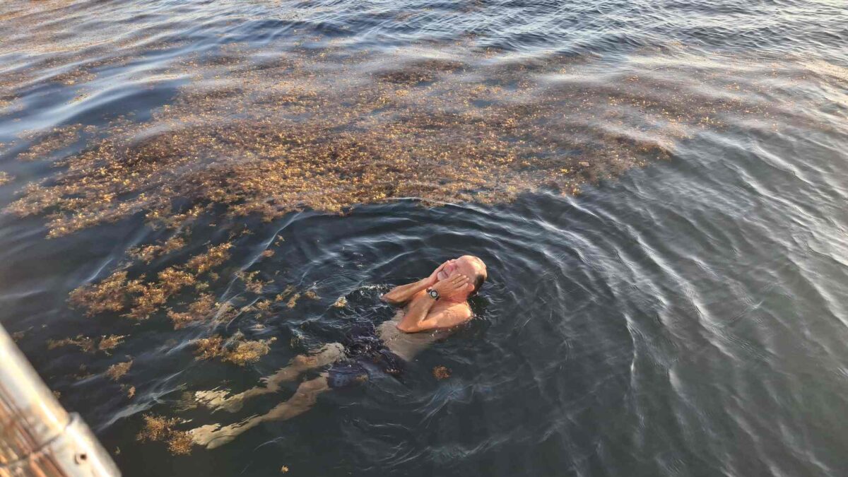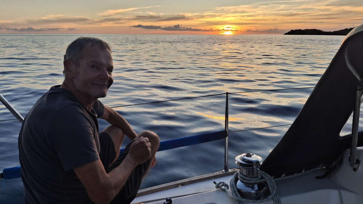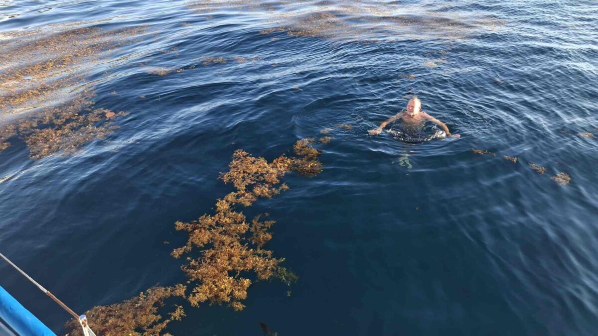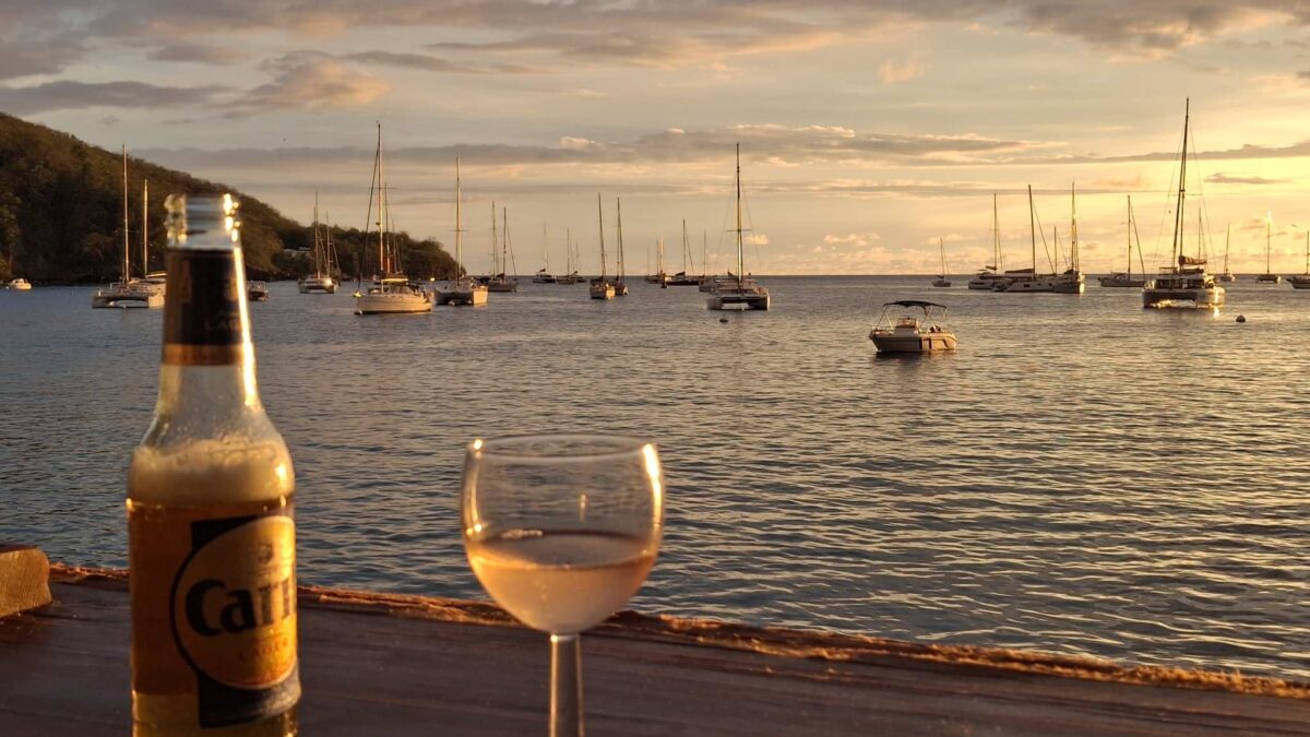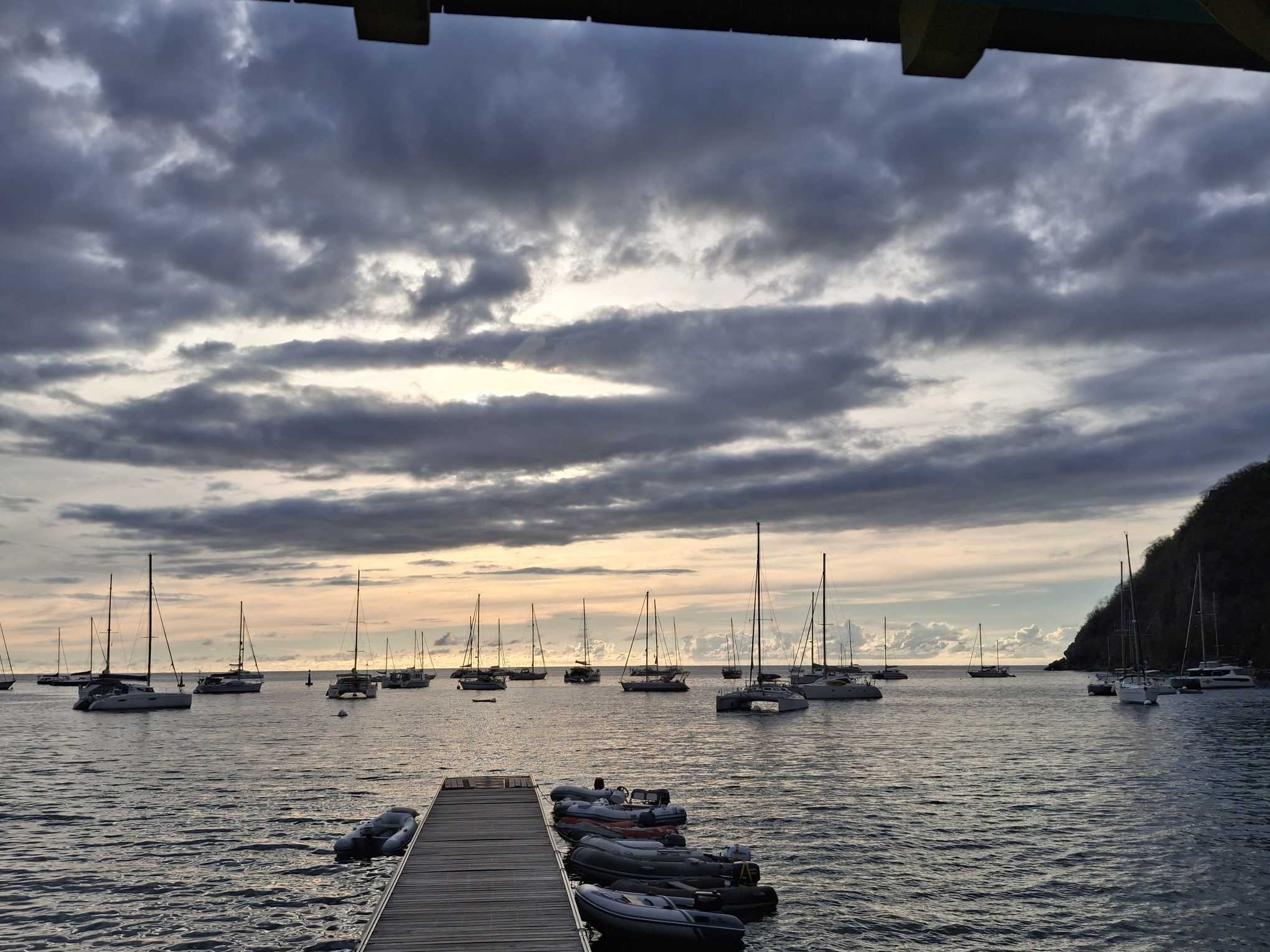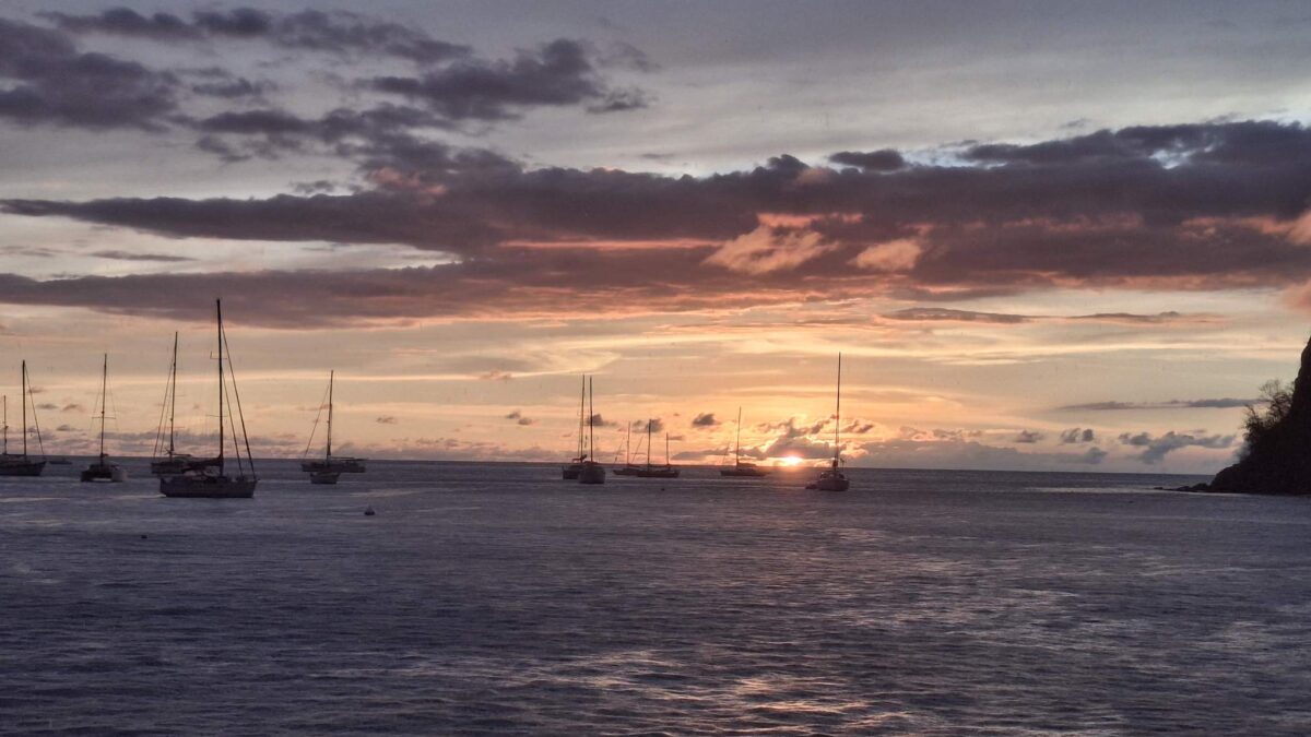 Motoren wird derzeit nach Möglichkeit vermieden: der Motor „klopft“ für des Skippers Ohren verdächtig. Deshalb hatte ich ja drei Motorfundamente in meinem Gepäck dabei. Aber einbauen konnte er sie noch nicht; das wäre auch mir lieber, dass das erst passiert, wenn wir irgendwo festgemacht sind, wo die Wahrscheinlichkeit, den Motor plötzlich zu benötigen, bei 0 liegt… Also segeln, wo und wenn immer das geht, und das ist ja auch unser Normalbetrieb. Einmal mehr waren wir froh über die Segelfreudigkeit unserer sea magiX; die meisten anderen Boote hätten mit den 4.5 bis 6.5 Knoten Wind keinen Meter gesegelt. Wir brauchten dann einfach etwas länger, kamen aber trotzdem rechtzeitig für den Sundowner vor Malendure an. Auch hier war der Sprung ins kühlende Nass etwas getrübt durch das viele Sargassogras.