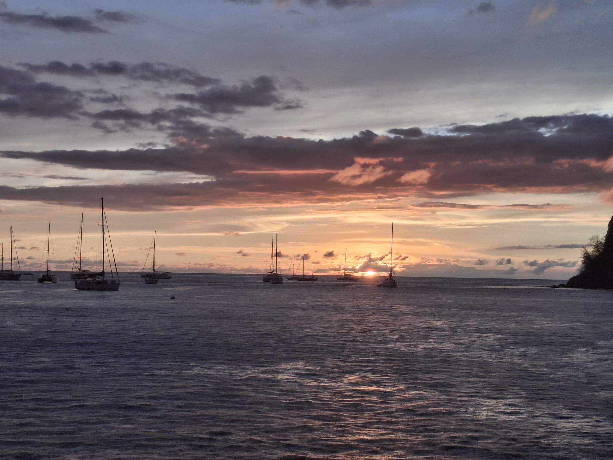 Unterdessen hatte ich meinerseits feststellen müssen, dass meine Speicherkarte im Handy anscheinend im Verlauf unserer Überfahrt ausgestiegen war und mir nun alle nicht schon in der Cloud gespeicherten Fotos bis dahin verloren gegangen sind. Diverse Versuche, die Karte wieder lesbar zu machen, scheiterten. Das bedeutet, dass in diesem Bericht die Fotos von dem schönen Kreuz-Tag nach Virgin Gorda und die Bilder vom Sound of Virgin Gorda fehlen, sowie jene vom ersten Sonnenuntergang beim Start am Dienstagabend. Glücklicherweise hat mein Handy schneller als ich erkannt, dass es ein Problem gab, und stellte automatisch die Speicherung der neuen Bilder auf den eigenen Speicher um. Schade nur um die verlorenen Bilder! Ein Learning mehr: auch wenn gerade kein Datennetz da ist, um die Bilder in die Cloud hochzuladen, macht es dennoch Sinn, sie wenigstens schon mal auf den Laptop zu übertragen…
