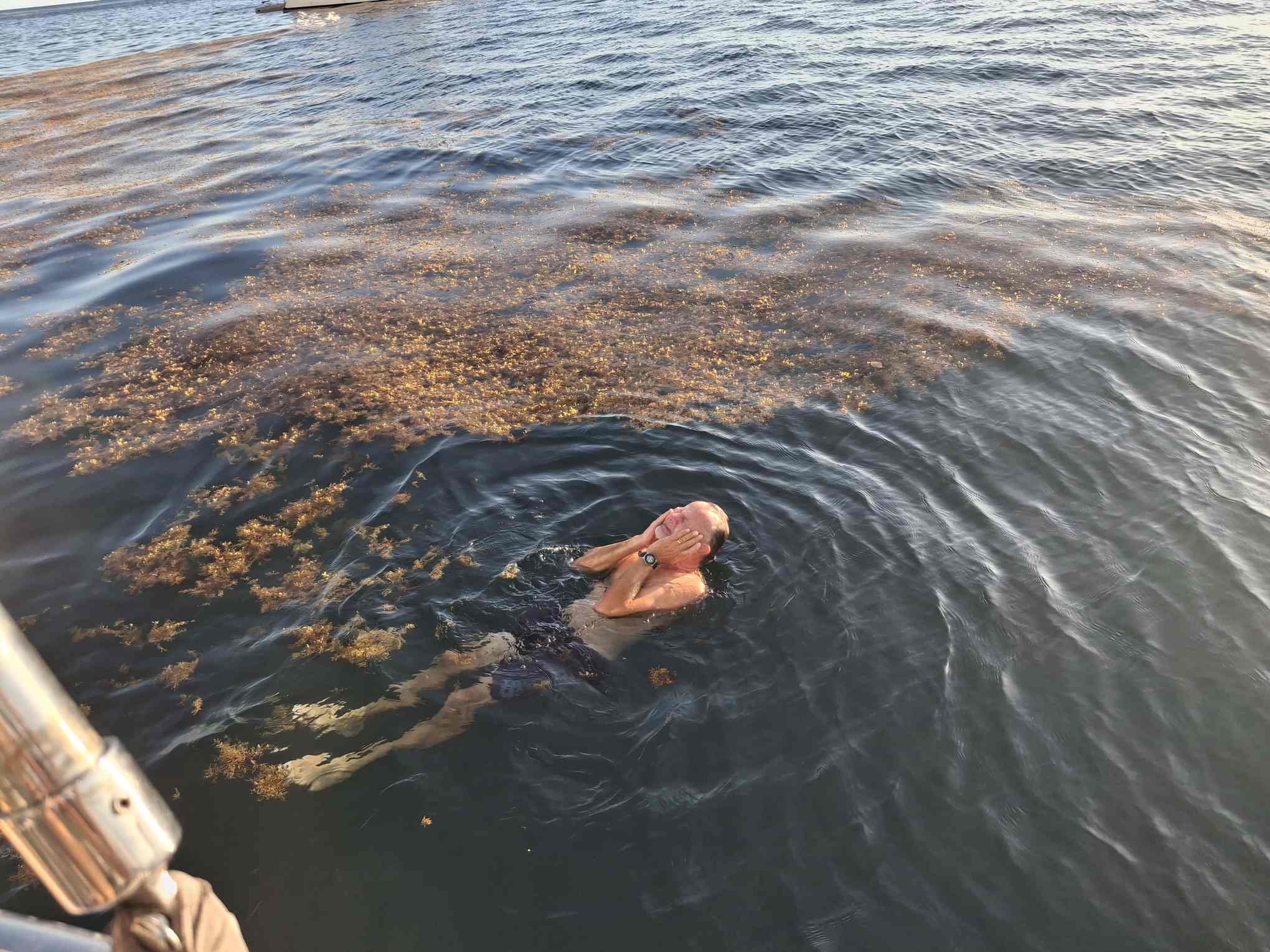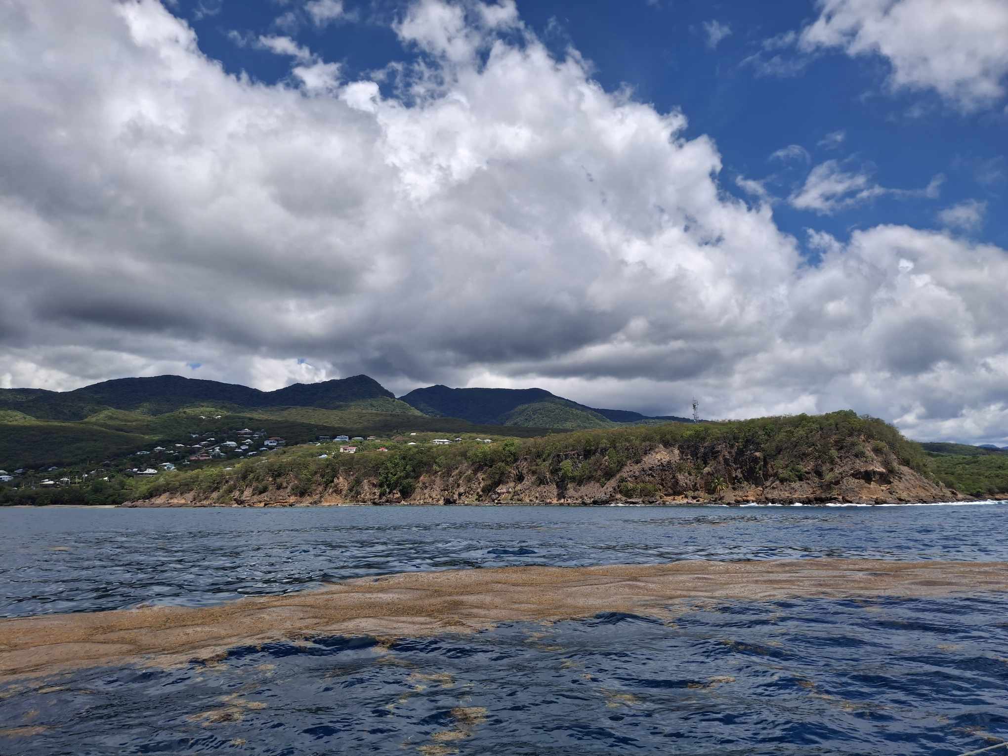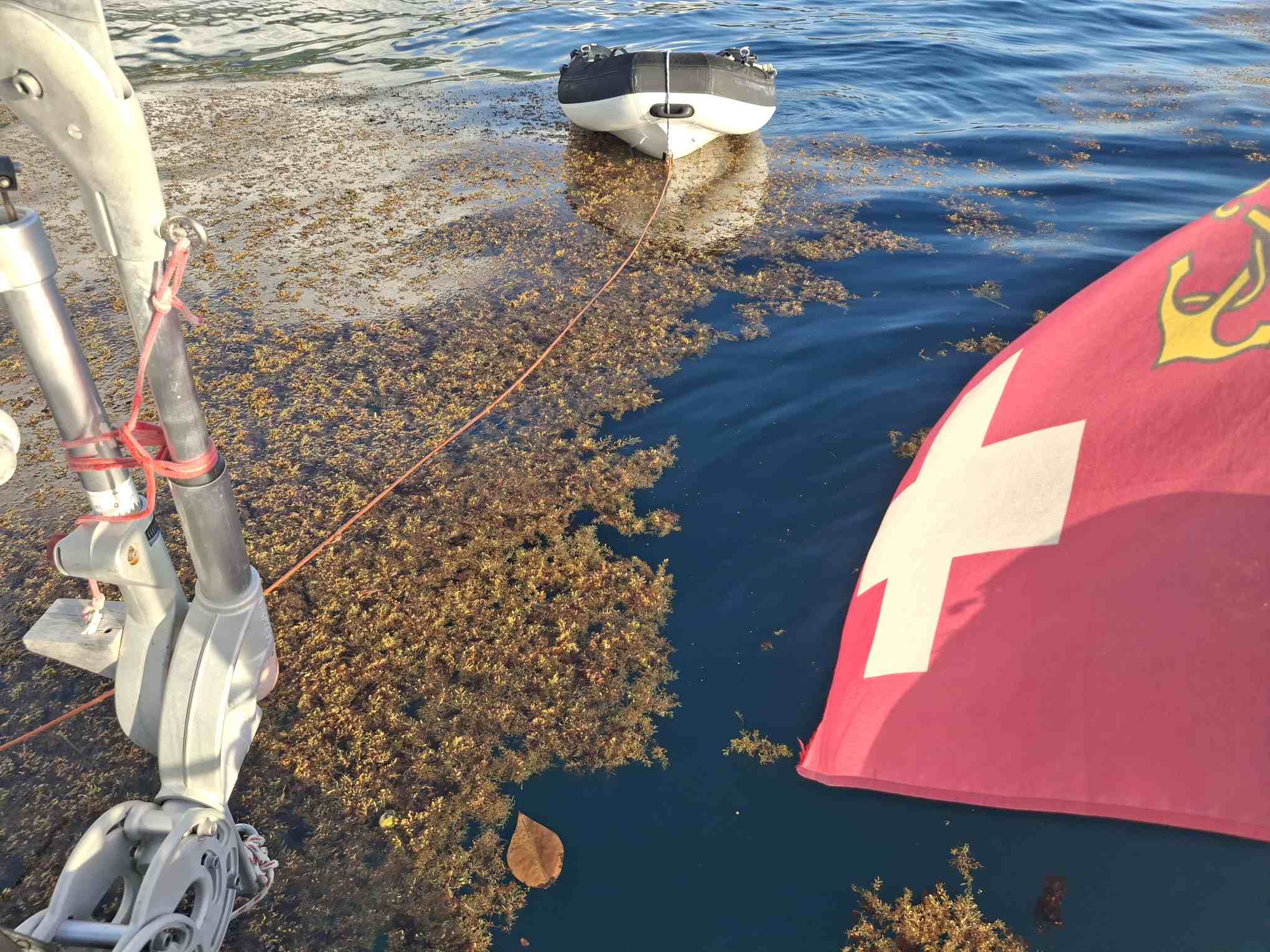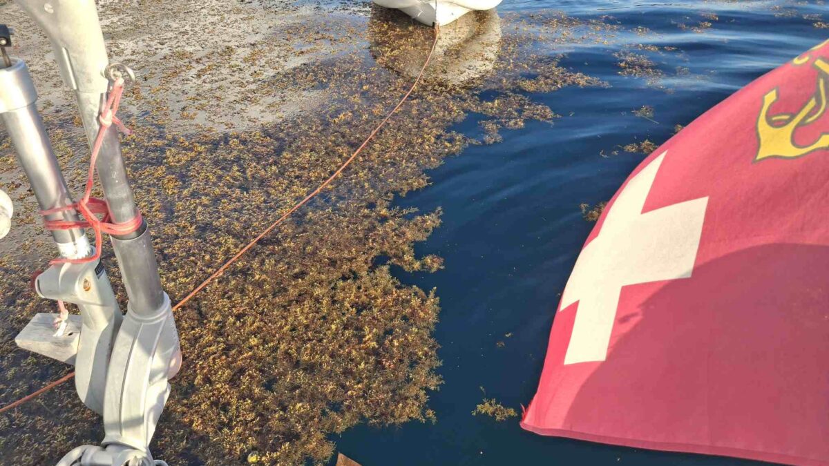 Beim Rückwärtsfahren zum Ankern in Deshaies lösten sich gleich mehrere grosse Büschel Sargassogras von unter sea magiX. Wir hatten wohl einen rechten Ballen von dem Zeug mitgeschleppt. Leider war auch sonst schon viel von der Alge in der Bucht von Deshaies angekommen; das Zeug hat offensichtlich inzwischen auch die Westseite der Insel erreicht und verseucht. Schade!