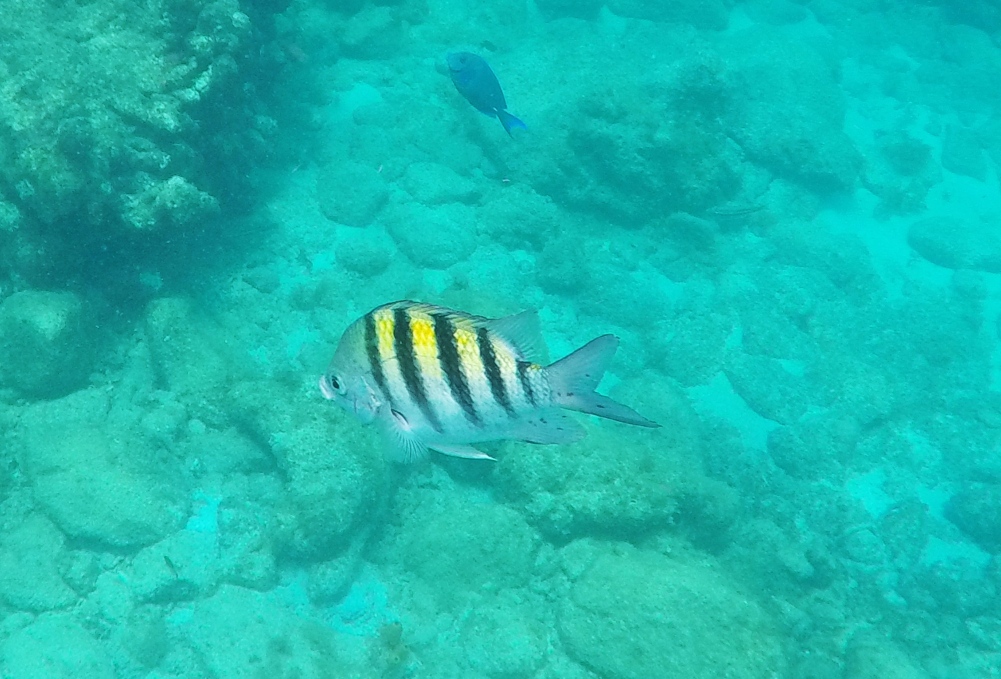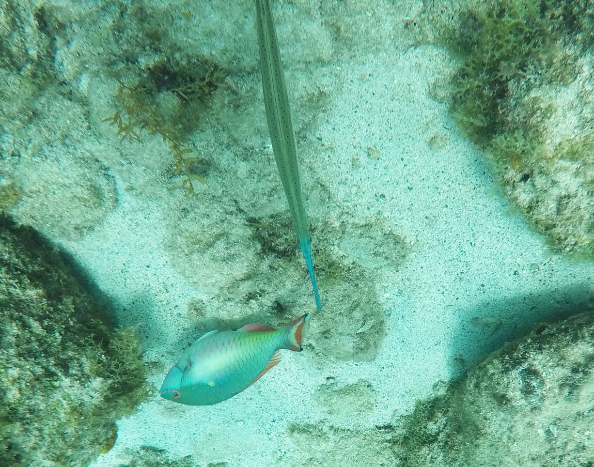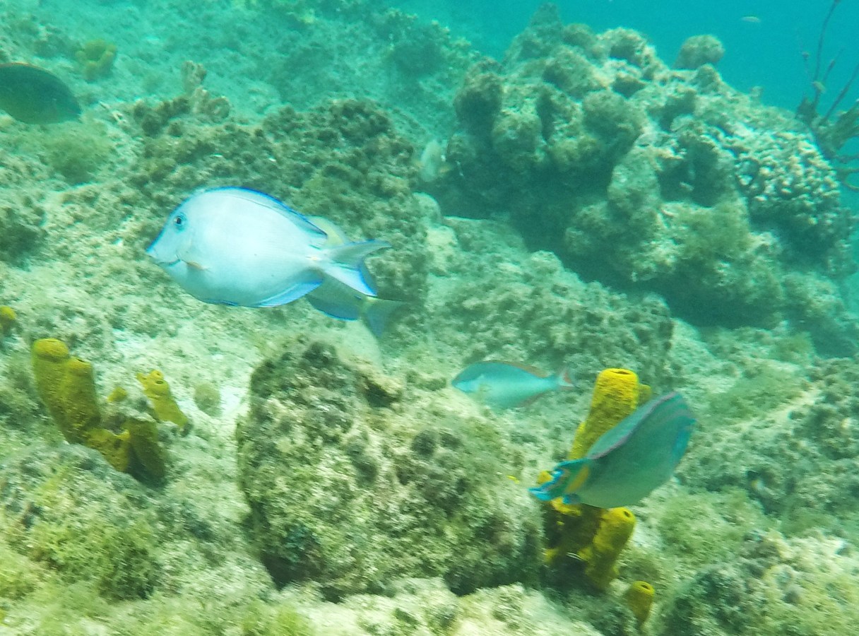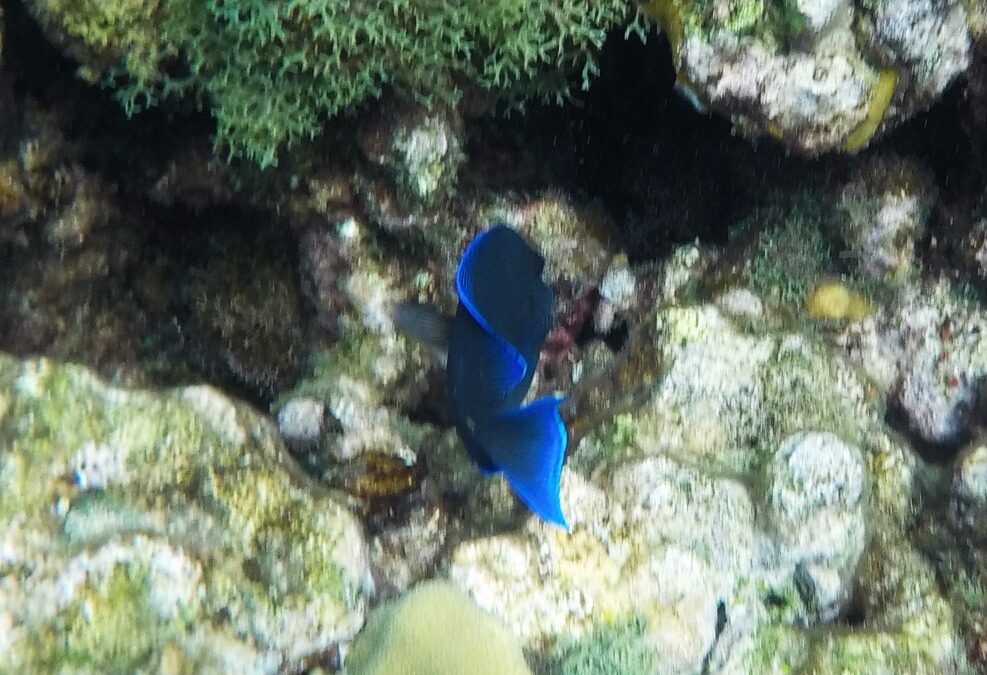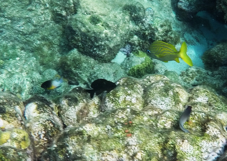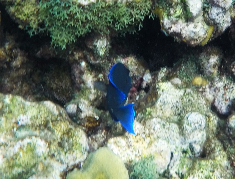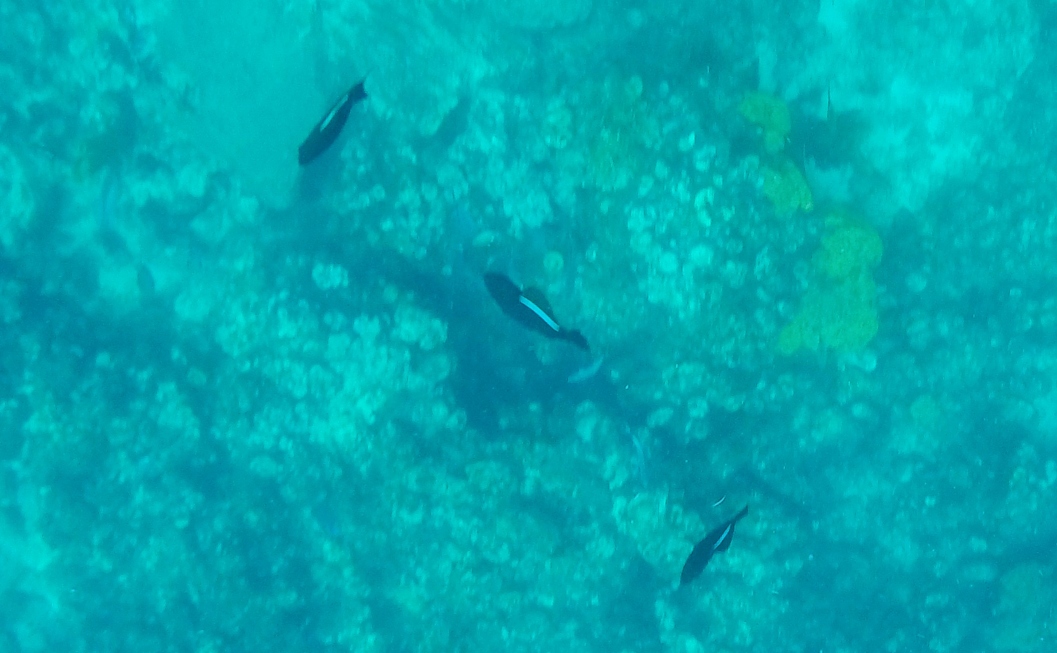 Rund um die Ile du Pigeon liegt der Cousteau Unterwasser-Nationalpark. Ankern und Fischen ist innerhalb der Nationalpark-Grenzen verboten. Am Samstag sattelten wir deshalb das Dinghy und brausten mit unserem Schnorchelzeug – nach einem kurzen Abstecher, um Arnaud auf der Schweizer Stahlyacht „Atlas“ zu begrüssen – hinüber zur Insel für einen ausgiebigen Schnorchelgang. Die Vielfalt und Menge an Fischen war grossartig. Leider waren wir etwas spät dran und mussten uns den recht begrenzten Raum mit sehr vielen anderen Schnorchlern und Tauchern (uva -Anfängern) teilen. Trotzdem – ein Genuss! Erstmals seit langem bekam ich auch wieder mal Lust auf einen Tauchgang. Vielleicht bei Gelegenheit mal wieder aufzunehmen? Aber auch schnorchelnd hatten wir viel Schönes, Farbiges und Vielfältiges gesehen. Besonders angetan hatte es mir ein winziger blauer Fisch mit leuchtend hellen Pünktchen. Bänz meinte, er sehe aus wie in Geschenkpapier gewickelt. Die Trompetenfische waren mir jeweils zu schnell und flitzten immer aus dem Blickfeld der GoPro, während sich die grösseren Barracudas u.a. vornehm in grösserer Tiefe zurück hielten, ausserhalb der Reichweite unserer kleinen Kamera. Schön wars!