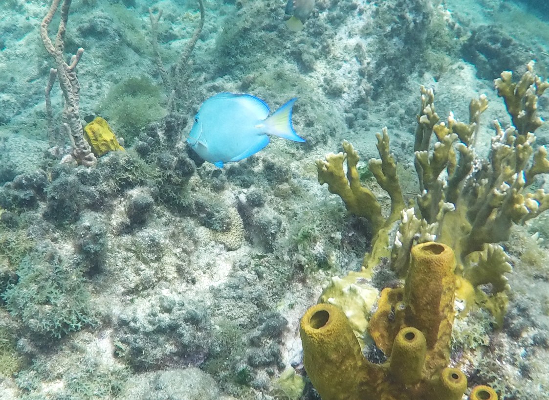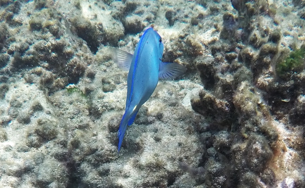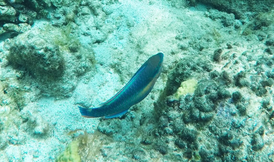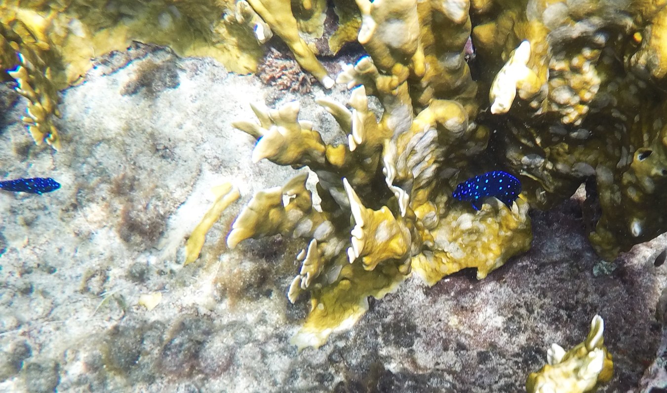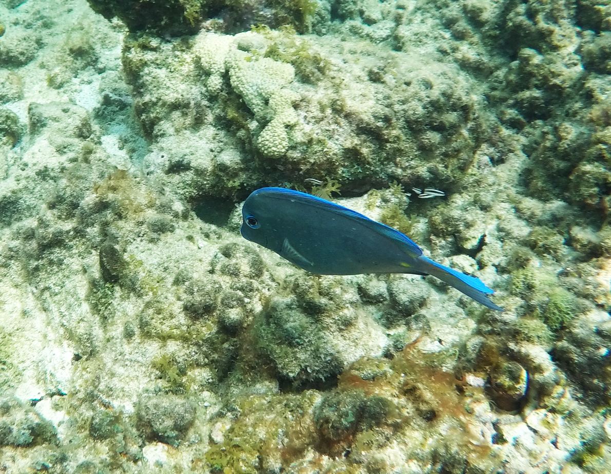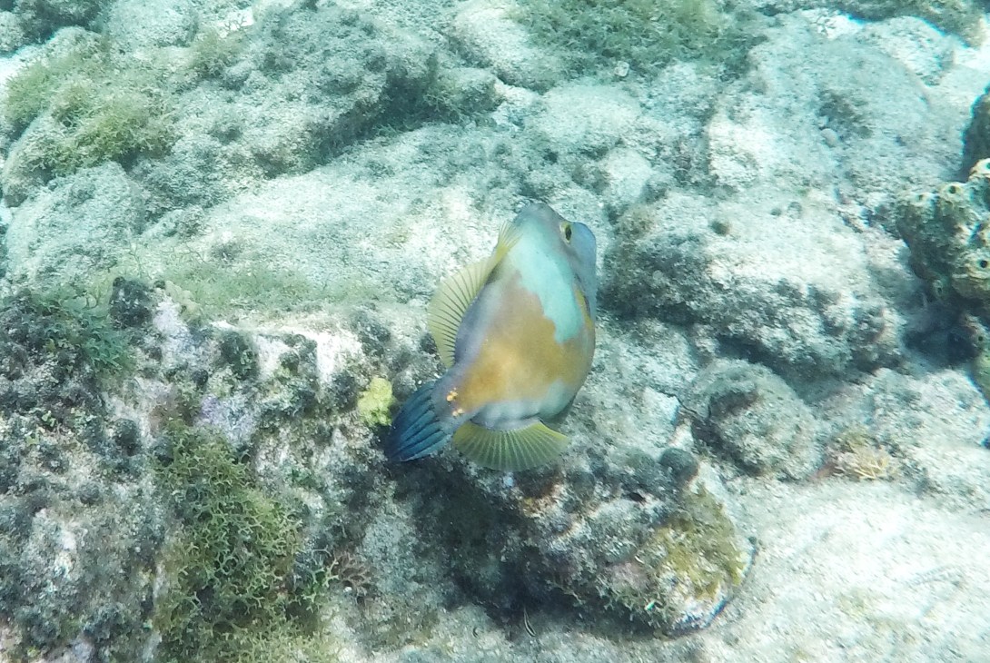 Rund um die Ile du Pigeon liegt der Cousteau Unterwasser-Nationalpark. Ankern und Fischen ist innerhalb der Nationalpark-Grenzen verboten. Am Samstag sattelten wir deshalb das Dinghy und brausten mit unserem Schnorchelzeug – nach einem kurzen Abstecher, um Arnaud auf der Schweizer Stahlyacht „Atlas“ zu begrüssen – hinüber zur Insel für einen ausgiebigen Schnorchelgang. Die Vielfalt und Menge an Fischen war grossartig. Leider waren wir etwas spät dran und mussten uns den recht begrenzten Raum mit sehr vielen anderen Schnorchlern und Tauchern (uva -Anfängern) teilen. Trotzdem – ein Genuss! Erstmals seit langem bekam ich auch wieder mal Lust auf einen Tauchgang. Vielleicht bei Gelegenheit mal wieder aufzunehmen? Aber auch schnorchelnd hatten wir viel Schönes, Farbiges und Vielfältiges gesehen. Besonders angetan hatte es mir ein winziger blauer Fisch mit leuchtend hellen Pünktchen. Bänz meinte, er sehe aus wie in Geschenkpapier gewickelt. Die Trompetenfische waren mir jeweils zu schnell und flitzten immer aus dem Blickfeld der GoPro, während sich die grösseren Barracudas u.a. vornehm in grösserer Tiefe zurück hielten, ausserhalb der Reichweite unserer kleinen Kamera. Schön wars!