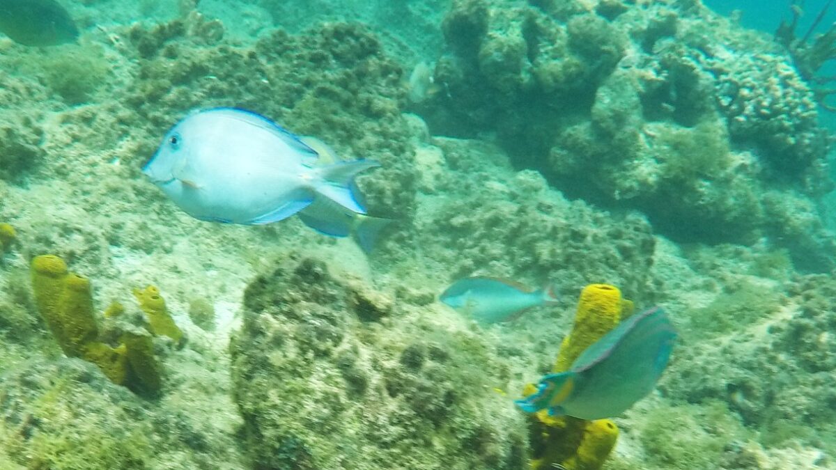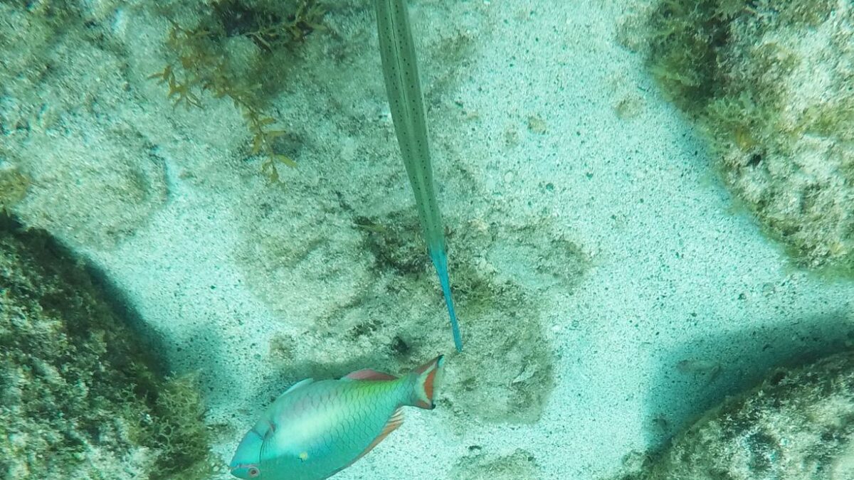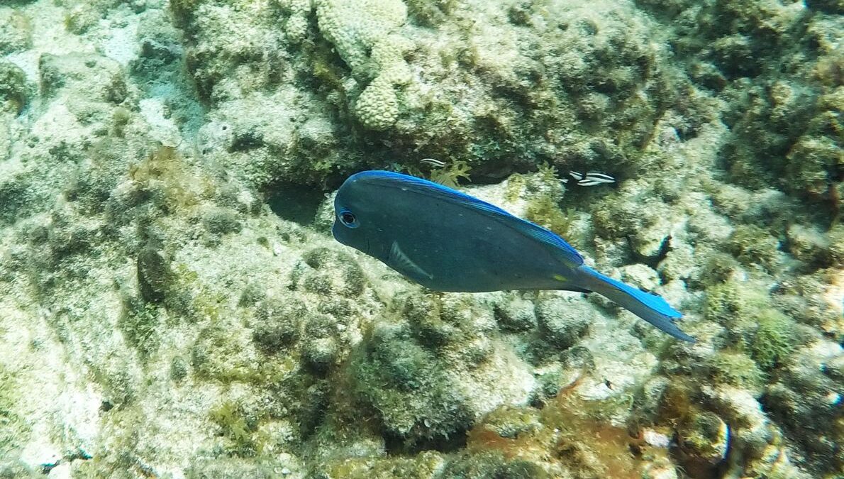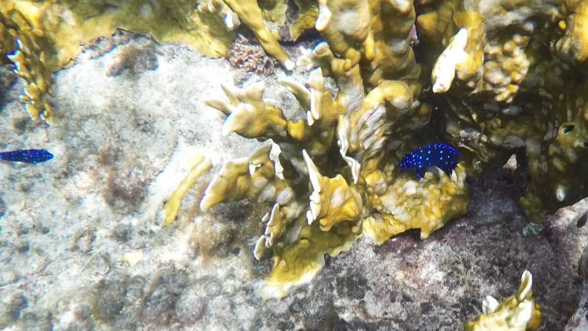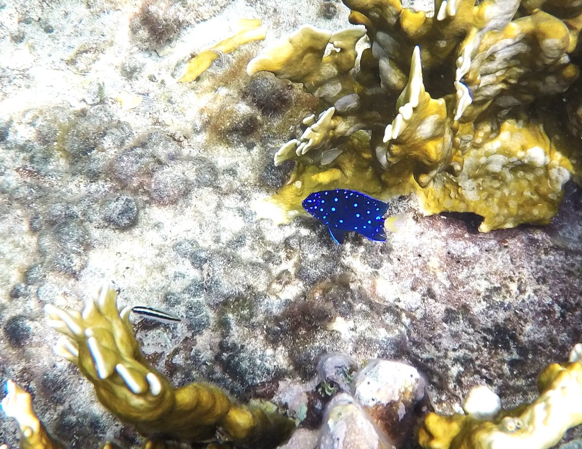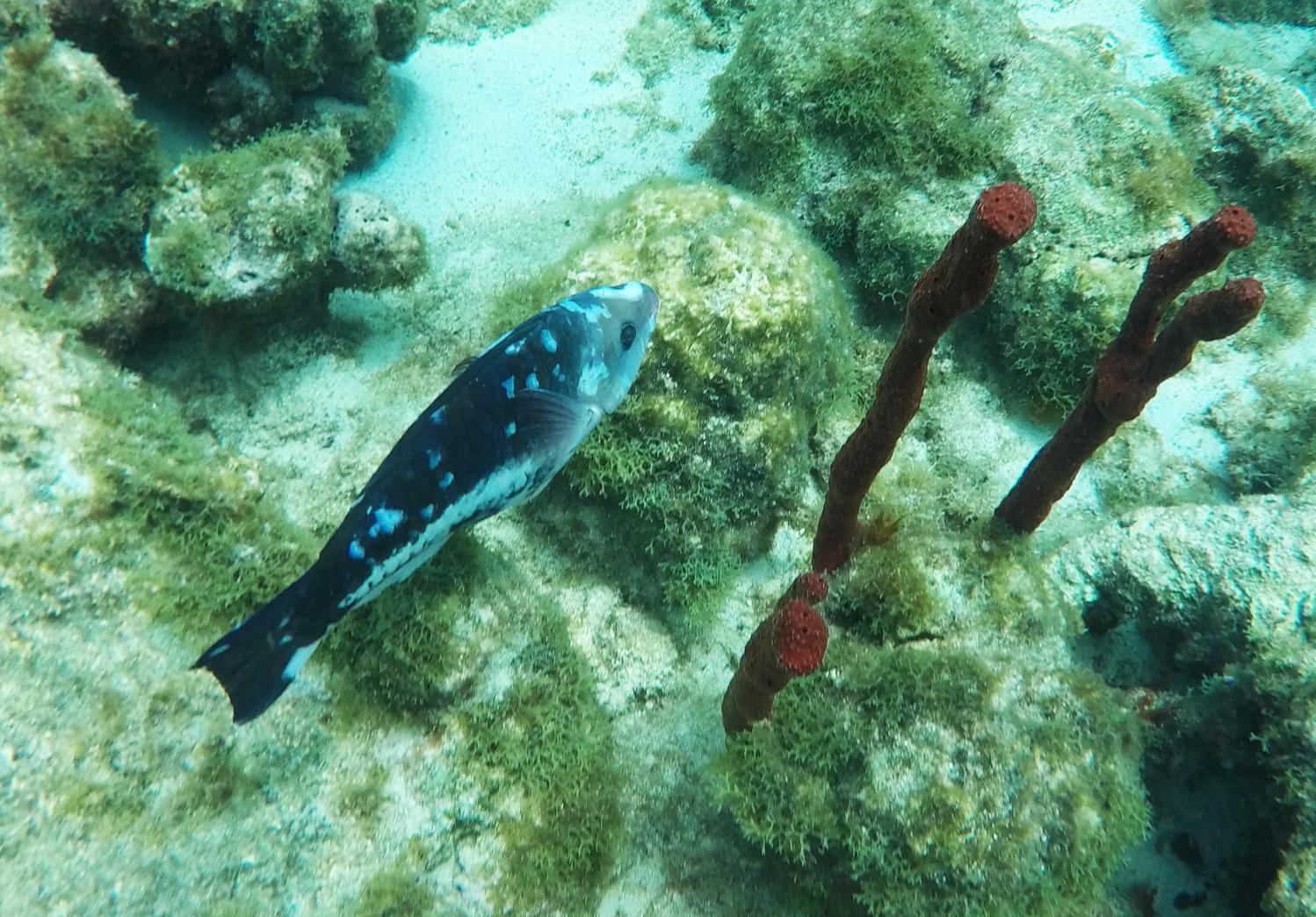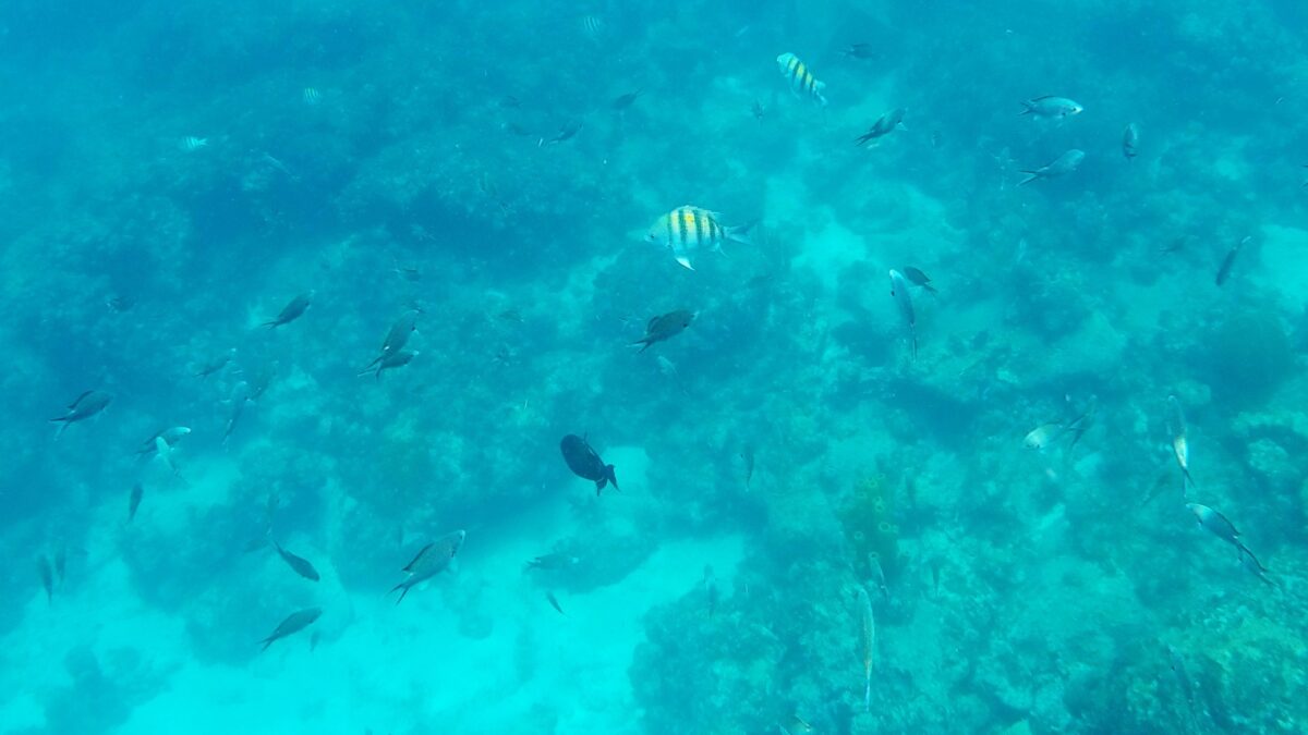 Rund um die Ile du Pigeon liegt der Cousteau Unterwasser-Nationalpark. Ankern und Fischen ist innerhalb der Nationalpark-Grenzen verboten. Am Samstag sattelten wir deshalb das Dinghy und brausten mit unserem Schnorchelzeug – nach einem kurzen Abstecher, um Arnaud auf der Schweizer Stahlyacht „Atlas“ zu begrüssen – hinüber zur Insel für einen ausgiebigen Schnorchelgang. Die Vielfalt und Menge an Fischen war grossartig. Leider waren wir etwas spät dran und mussten uns den recht begrenzten Raum mit sehr vielen anderen Schnorchlern und Tauchern (uva -Anfängern) teilen. Trotzdem – ein Genuss! Erstmals seit langem bekam ich auch wieder mal Lust auf einen Tauchgang. Vielleicht bei Gelegenheit mal wieder aufzunehmen? Aber auch schnorchelnd hatten wir viel Schönes, Farbiges und Vielfältiges gesehen. Besonders angetan hatte es mir ein winziger blauer Fisch mit leuchtend hellen Pünktchen. Bänz meinte, er sehe aus wie in Geschenkpapier gewickelt. Die Trompetenfische waren mir jeweils zu schnell und flitzten immer aus dem Blickfeld der GoPro, während sich die grösseren Barracudas u.a. vornehm in grösserer Tiefe zurück hielten, ausserhalb der Reichweite unserer kleinen Kamera. Schön wars!