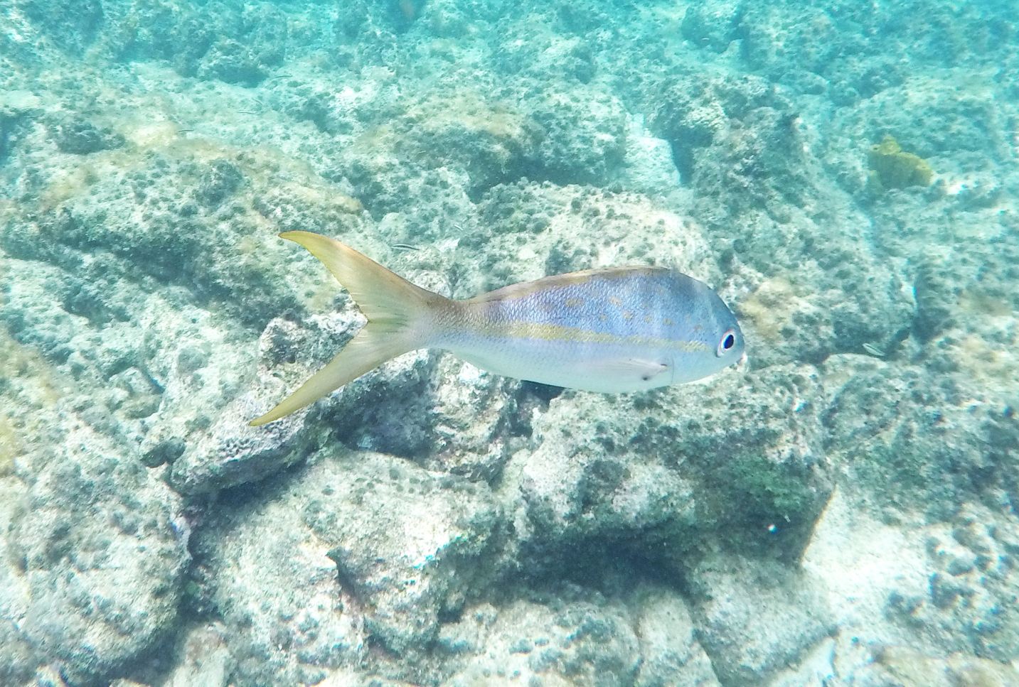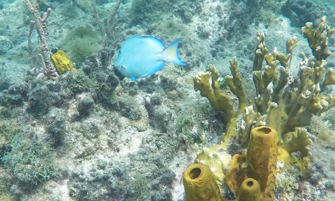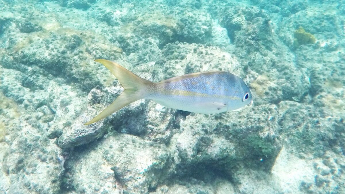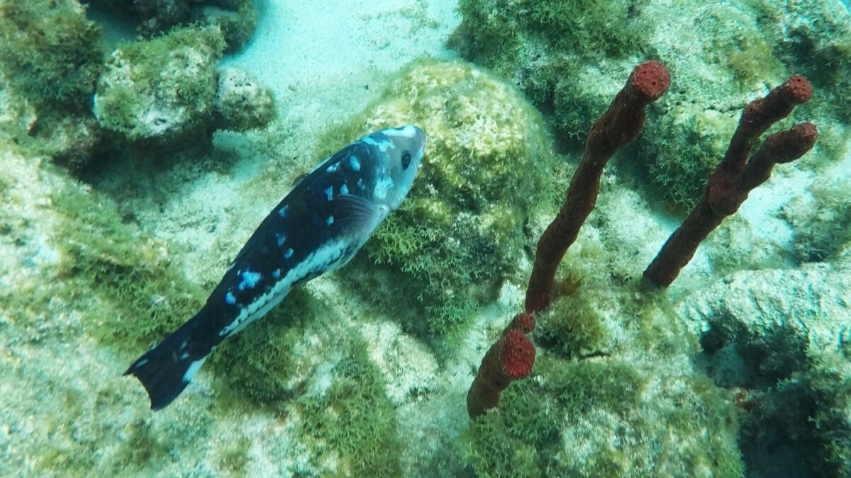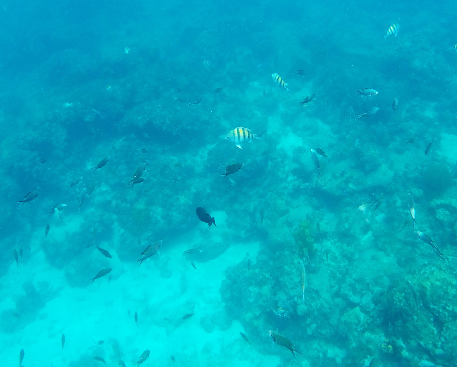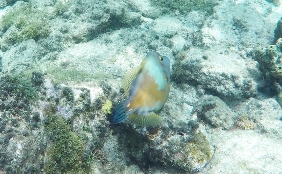 Rund um die Ile du Pigeon liegt der Cousteau Unterwasser-Nationalpark. Ankern und Fischen ist innerhalb der Nationalpark-Grenzen verboten. Am Samstag sattelten wir deshalb das Dinghy und brausten mit unserem Schnorchelzeug – nach einem kurzen Abstecher, um Arnaud auf der Schweizer Stahlyacht „Atlas“ zu begrüssen – hinüber zur Insel für einen ausgiebigen Schnorchelgang. Die Vielfalt und Menge an Fischen war grossartig. Leider waren wir etwas spät dran und mussten uns den recht begrenzten Raum mit sehr vielen anderen Schnorchlern und Tauchern (uva -Anfängern) teilen. Trotzdem – ein Genuss! Erstmals seit langem bekam ich auch wieder mal Lust auf einen Tauchgang. Vielleicht bei Gelegenheit mal wieder aufzunehmen? Aber auch schnorchelnd hatten wir viel Schönes, Farbiges und Vielfältiges gesehen. Besonders angetan hatte es mir ein winziger blauer Fisch mit leuchtend hellen Pünktchen. Bänz meinte, er sehe aus wie in Geschenkpapier gewickelt. Die Trompetenfische waren mir jeweils zu schnell und flitzten immer aus dem Blickfeld der GoPro, während sich die grösseren Barracudas u.a. vornehm in grösserer Tiefe zurück hielten, ausserhalb der Reichweite unserer kleinen Kamera. Schön wars!