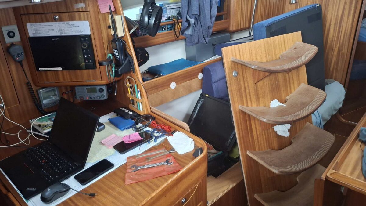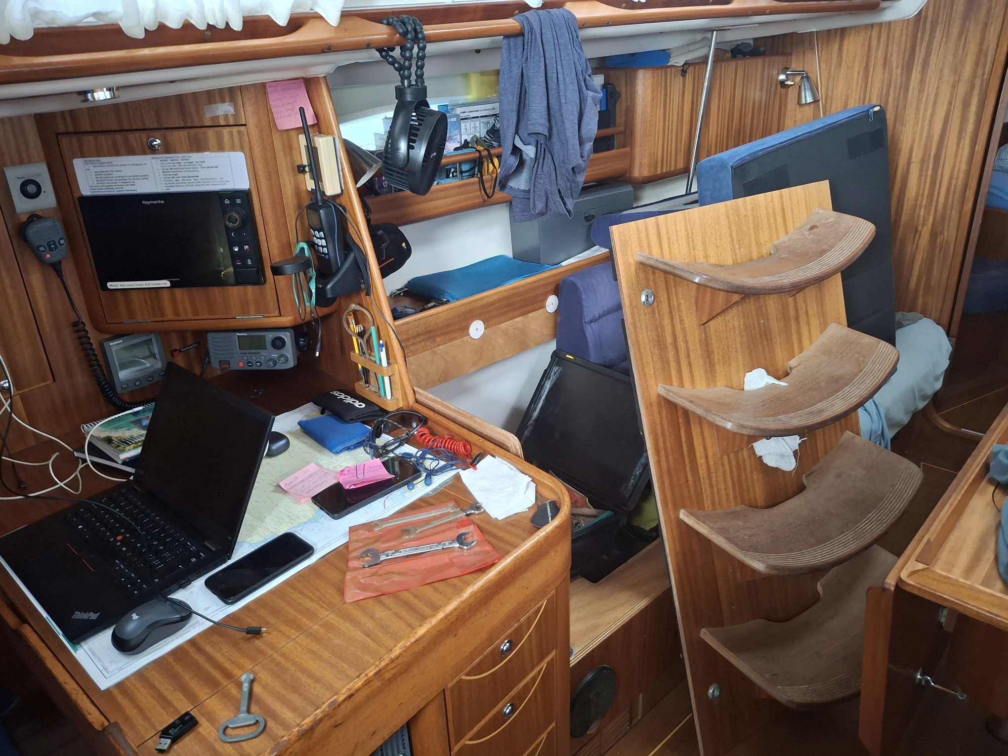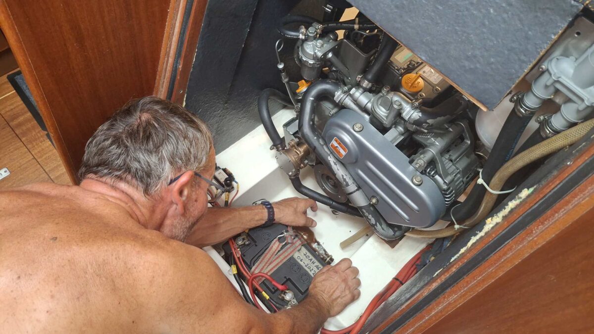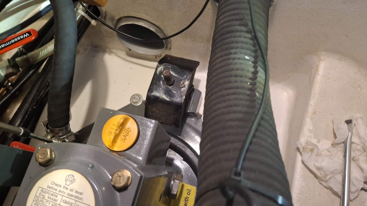 Während ich mich um diesen Bericht kümmerte, begann der Skipper irgendwann am Motorkasten zu rumoren. Nach einiger Zeit ging es darum, dass ich einen Holzblock unter den Motor schieben sollte, während er ihn leicht anhob. Mooooooment – Motor anheben? Hatten wir nicht kurz vorher noch darüber gesprochen, dass das besser erst passieren sollte, wenn wir irgendwo ganz fest lagen? Leicht nervös beobachtete ich ab da den Wind und das Wetter genauer. Hoffentlich kam nicht plötzlich die Gewitterfront, die Dr. Schrader vom Wetterbericht mit 24-30 Knoten angekündigt hatte… Des Skippers Erklärung, dass er ja nur schauen wollte, was es denn für den Wechsel der Motorfundamente brauchen würde, konnte ich ja nachvollziehen. Aber trotzdem – mein Puls stieg augenblicklich auf überhöhte Werte – ganz ohne Sport.