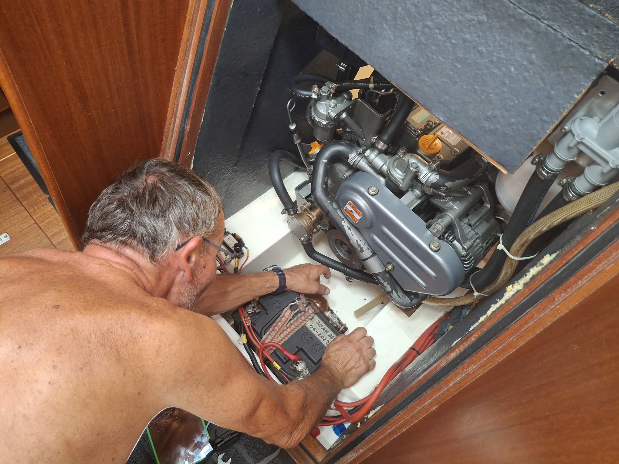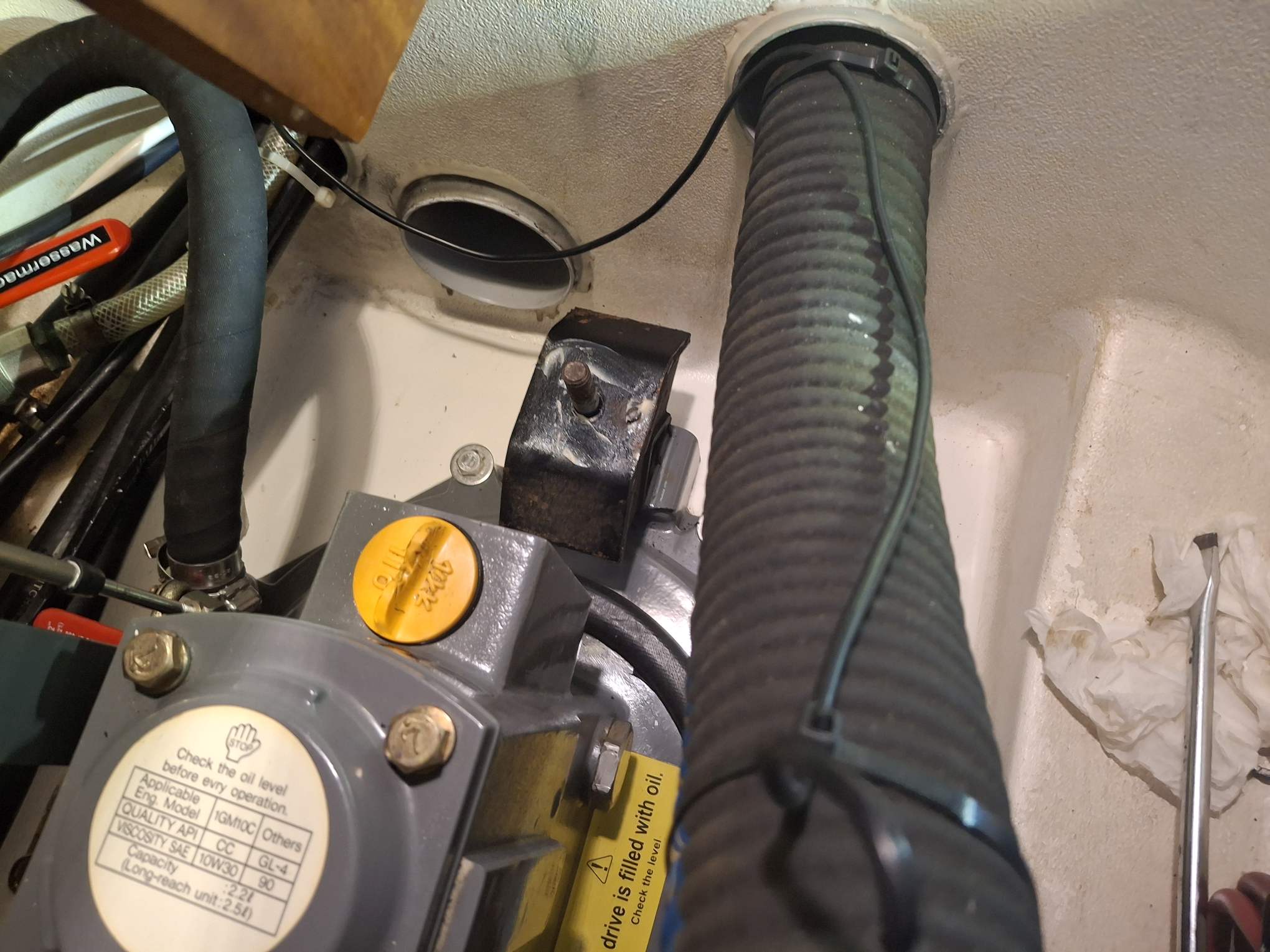 Inzwischen ist auch der Skipper zu einer wenig erbaulichen Erkenntnis gelangt (die seine Motor-Ausserbetriebnahme tatsächlich rechtfertigt ;-)): die Fundament-Muttern lassen sich nur lösen, wenn sea magiX nicht im Wasser liegt. Um an sie heran zu kommen, muss nämlich die Dichtung des Saildrives (des Antriebs für den Propeller) gelöst werden. Und das würde bedeuten, am tiefsten Punkt im Schiff ein sehr grosses Loch zu öffnen. Horrorvorstellung! Da müssen wir wohl noch eine Weile bis in Trinidad mit dem Klopfen leben und hoffen, dass unser Motörchen nicht plötzlich in seinem Motorraum umherhüpft. Mit diesem Erkenntnisgewinn ging Bänz bald wieder zum Rückbau über und nach einer halben Stunde, in der sich nur der Regen intensiviert hatte, aber nicht der Wind, kam die erlösende Meldung aus dem Achterschiff: „ab jetzt sind wir wieder manövrierfähig“. Puh, ein Schluck Wasser und schon war mein Puls wieder auf normal.