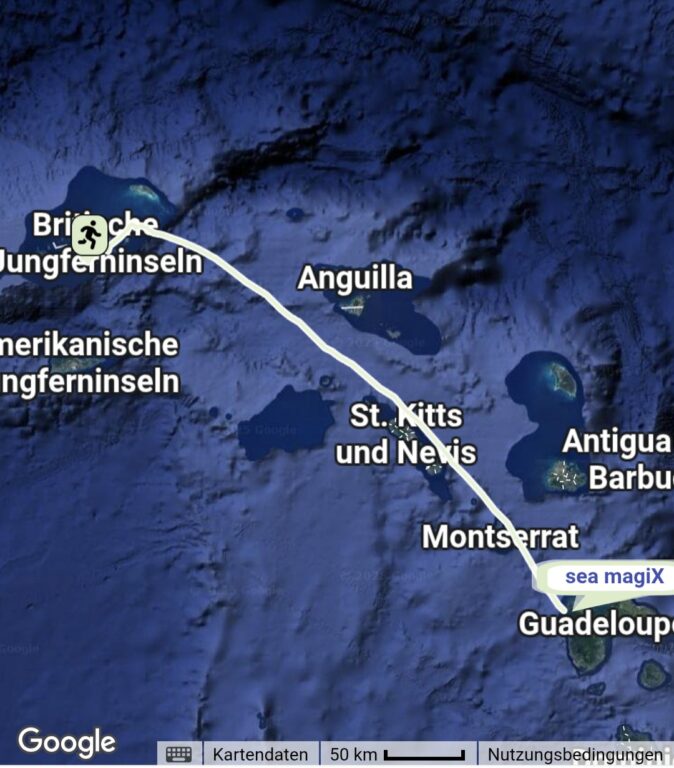 Im grossen Sound von Virgin Gorda genossen wir nochmals das unglaublich türkisfarbene Wasser und die Ruhe am schön im Sand festgezogenen Anker. Vorschlafen, vorkochen und sonst vorbereiten standen am Dienstag tagsüber auf dem Programm. Dann ein letzter Blick auf den Wetterbericht – der bestätigte, dass sich ein knappes Fenster mit eher nördlichem und leichtem Wind bei schönem Wetter abzeichnete, das reichen würde, um mindestens bis Montserrat zu kommen, oder evtl. die ca. 220 SM bis nach Guadeloupe.