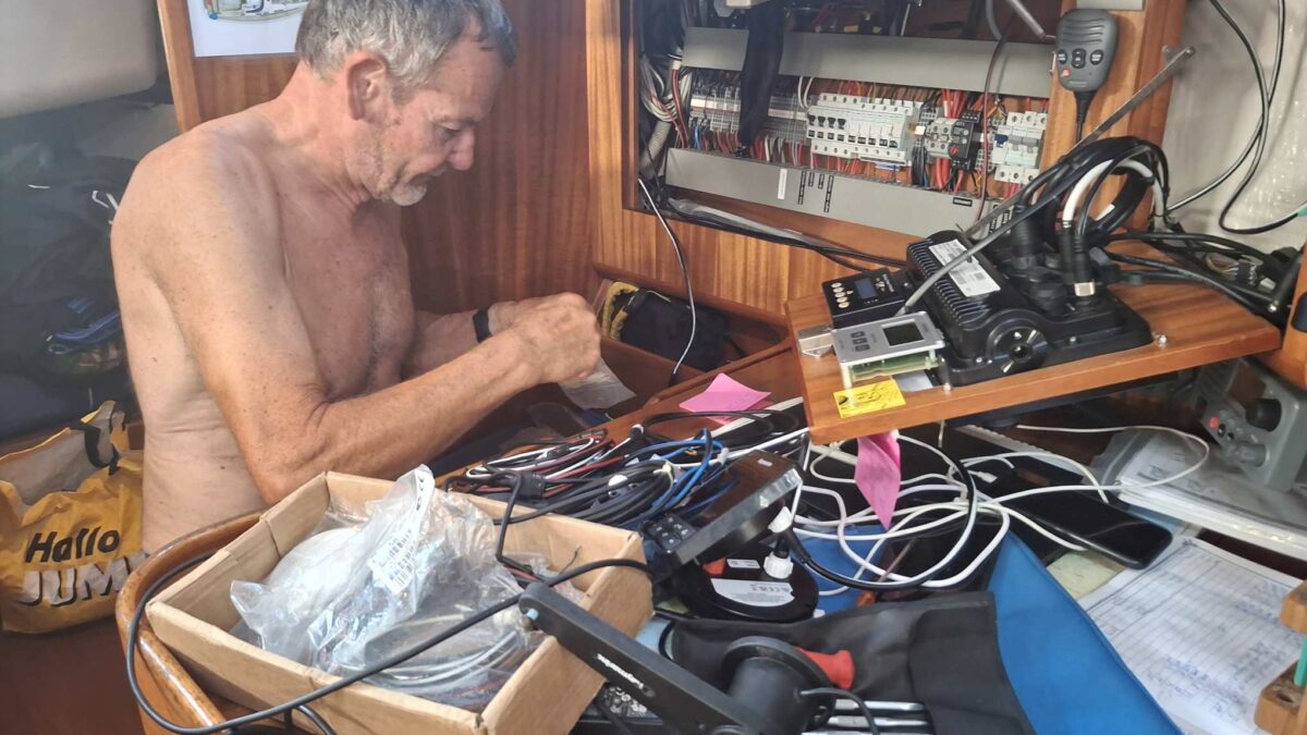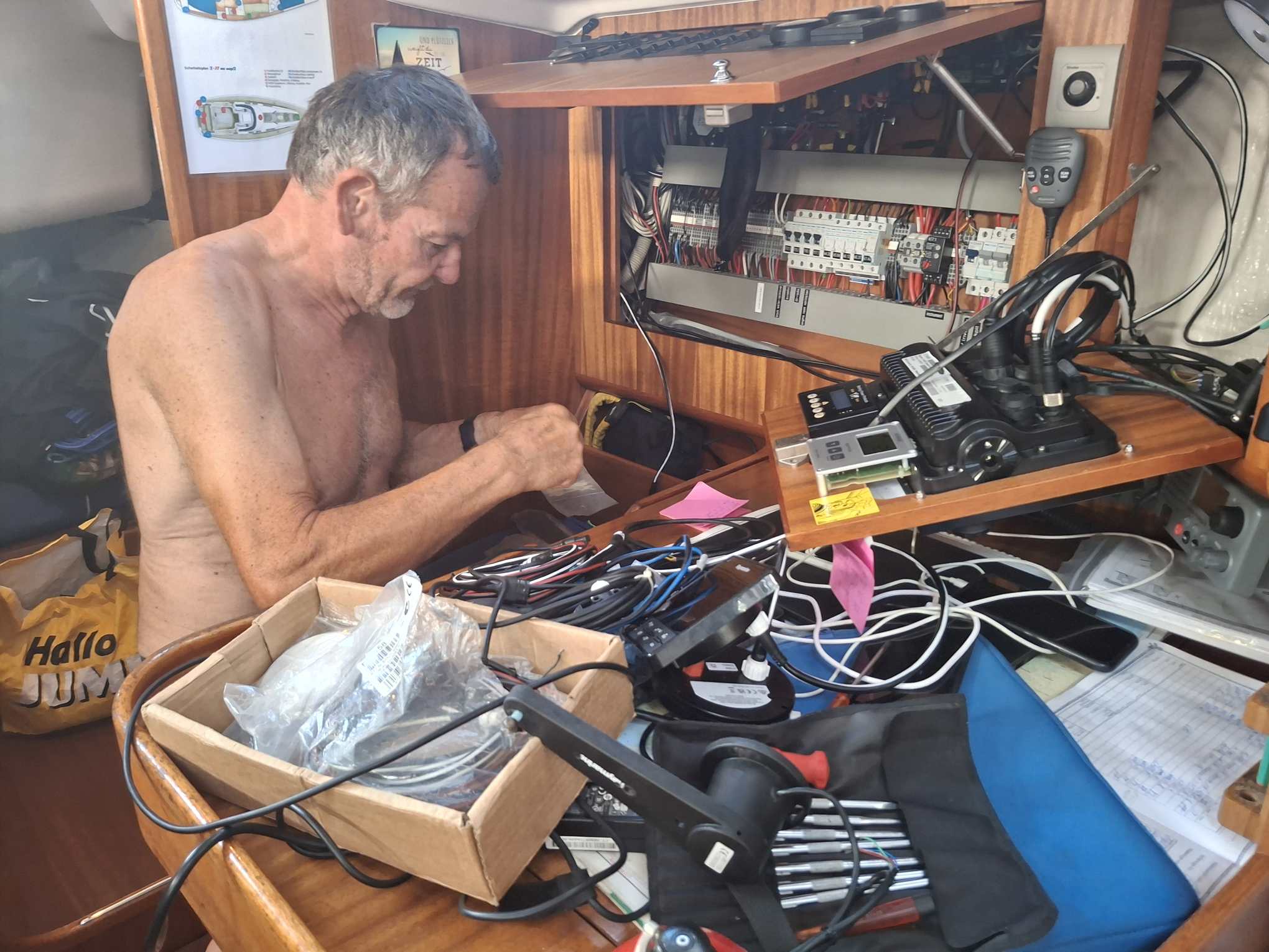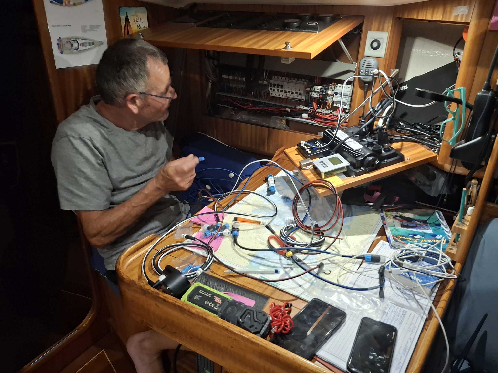 Bis am Abend hatten wir dann traurige Gewissheit: das Autopilot-Problem konnte mit dem neuen Controller nicht gelöst werden. Und so folgte ein weiterer, frustrierender Tag für den Rückbau zum alten Gerät. „Nur mal schnell“ hatte diesmal in äusserst heftiger Form zugeschlagen. Wie Bänz in gewohnt positiver Art feststellte, hatte er zwar sehr viel über das Bordnetzwerk und die einzelnen Geräte gelesen und gelernt, hatte aufgeräumt, schön verkabelt, und ein sehr detailliertes Fachwissen aufgebaut. Aber wir werden nun trotzdem auch die nächsten Monate mit dem alten Autopiloten unterwegs sein, der ja ausgetauscht werden sollte, weil er mit zunehmendem Alter öfters unerwartete Aussetzer hatte und wir ihm nicht mehr so richtig trauen…