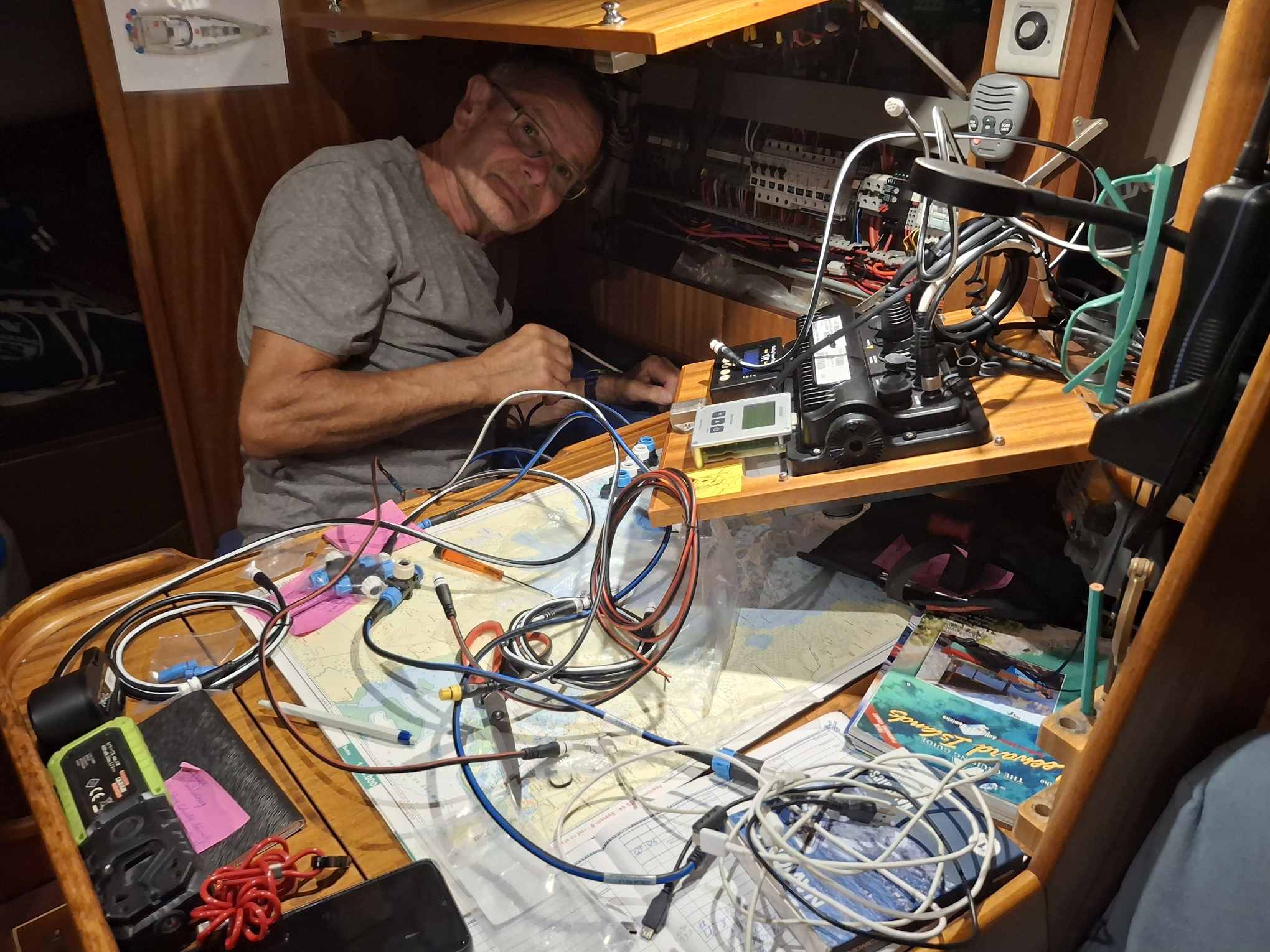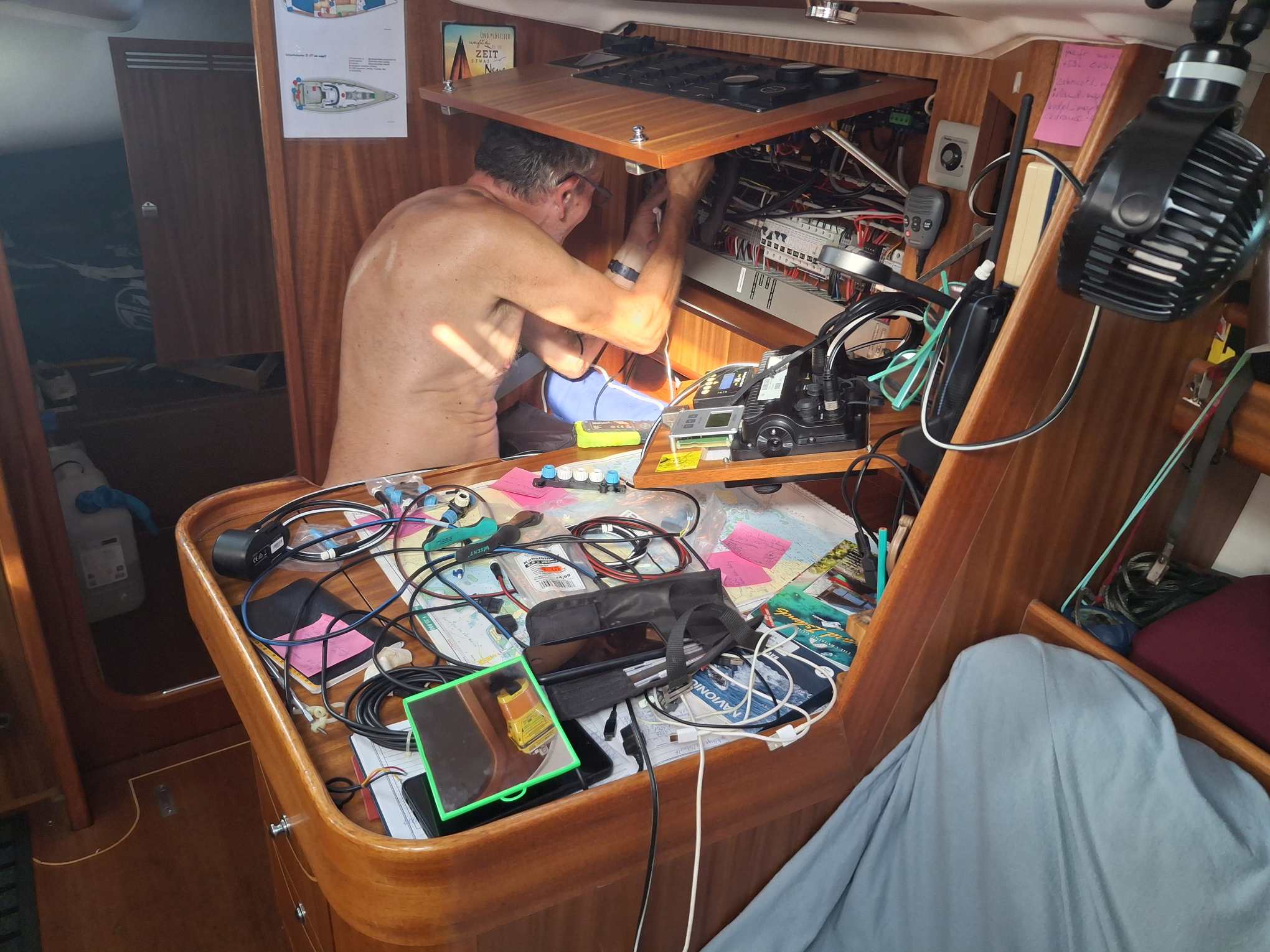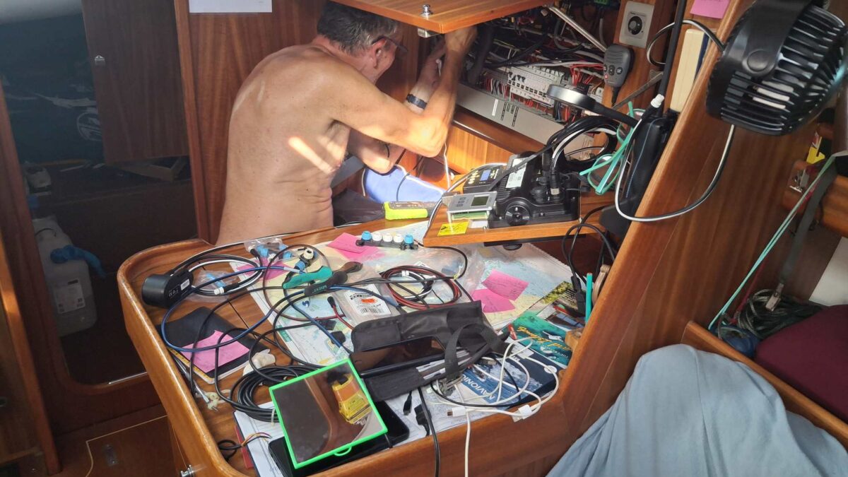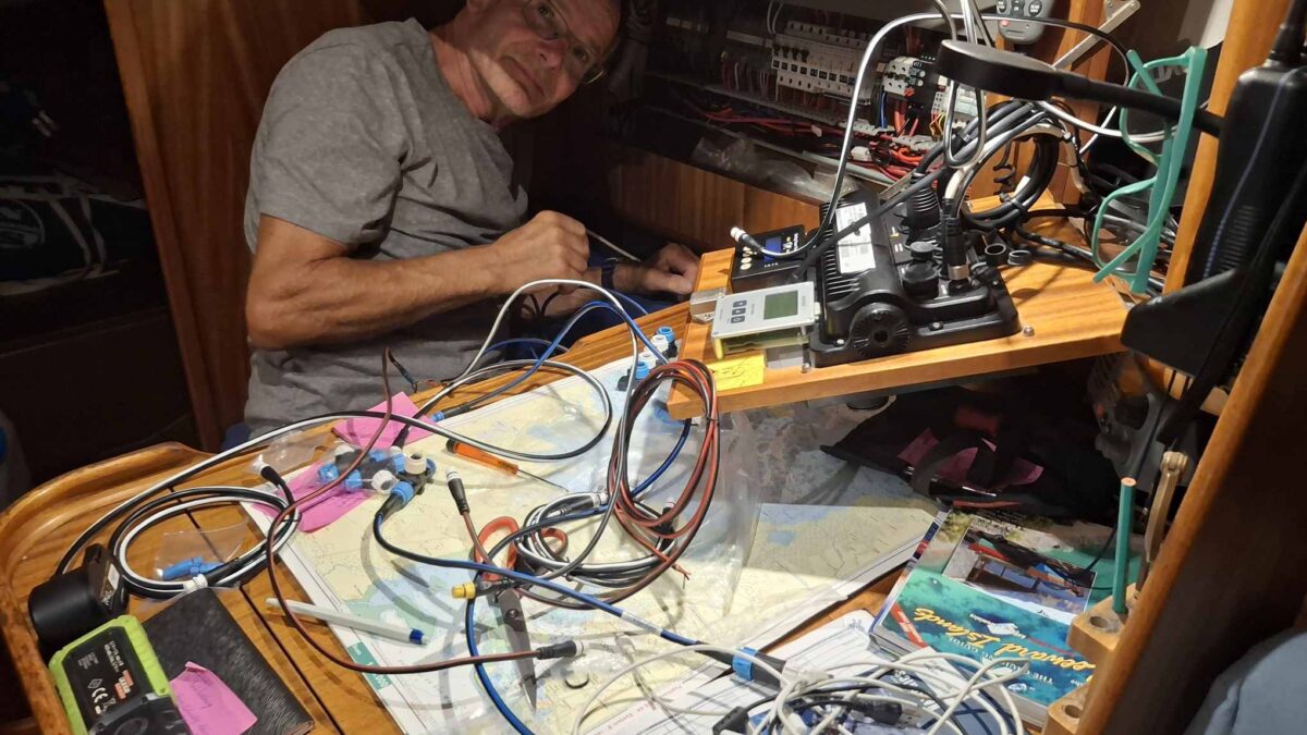 Bis am Abend hatten wir dann traurige Gewissheit: das Autopilot-Problem konnte mit dem neuen Controller nicht gelöst werden. Und so folgte ein weiterer, frustrierender Tag für den Rückbau zum alten Gerät. „Nur mal schnell“ hatte diesmal in äusserst heftiger Form zugeschlagen. Wie Bänz in gewohnt positiver Art feststellte, hatte er zwar sehr viel über das Bordnetzwerk und die einzelnen Geräte gelesen und gelernt, hatte aufgeräumt, schön verkabelt, und ein sehr detailliertes Fachwissen aufgebaut. Aber wir werden nun trotzdem auch die nächsten Monate mit dem alten Autopiloten unterwegs sein, der ja ausgetauscht werden sollte, weil er mit zunehmendem Alter öfters unerwartete Aussetzer hatte und wir ihm nicht mehr so richtig trauen…