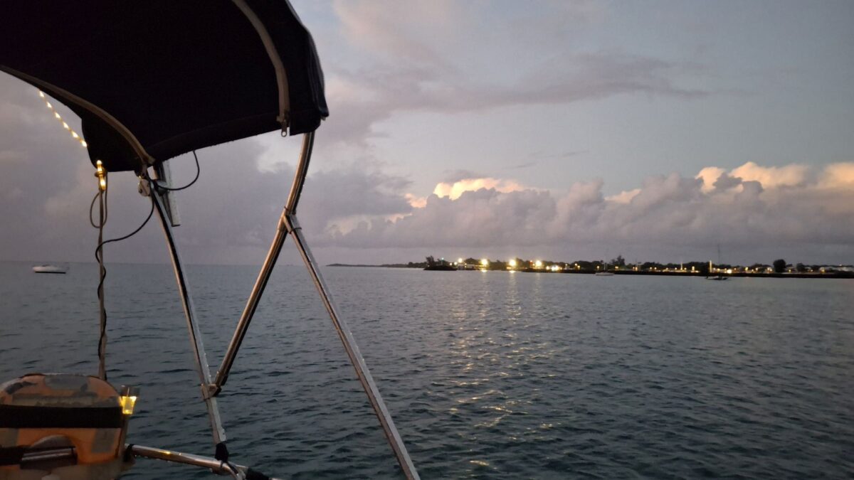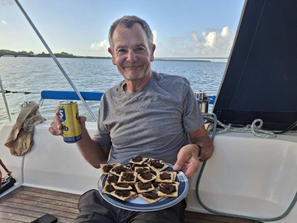 Bis am Abend veränderte sich das Bild nur geringfügig. „Nur mal schnell“ hatte wieder zugeschlagen. Mit Hilfe eines lieben Überraschungsanrufs von Marc und Karin von der SY St. Raphael, die seit Wochen auf Curaçao mit bewundernswertem Humor und Gleichmut mit den Herausforderungen ihres schönen Stahlschiffs kämpfen (siehe ihr sehr empfehlenswerter Blog: https://sailing-st-raphael.de/reiseblog/), konnte ich ihn dann rechtzeitig für den Sundowner in Form einer Büchse „Caribe“ vom Kartentisch los-eisen.