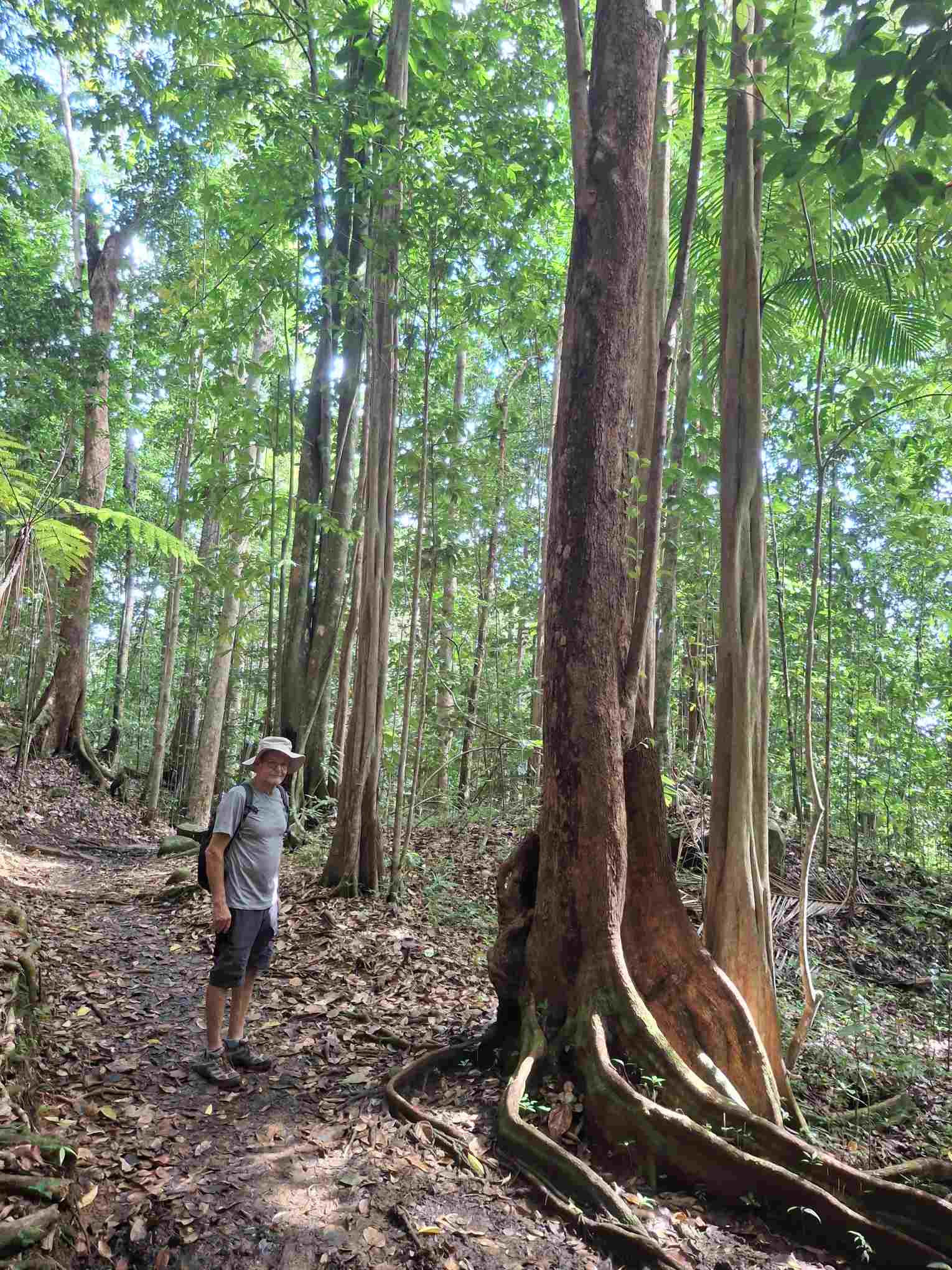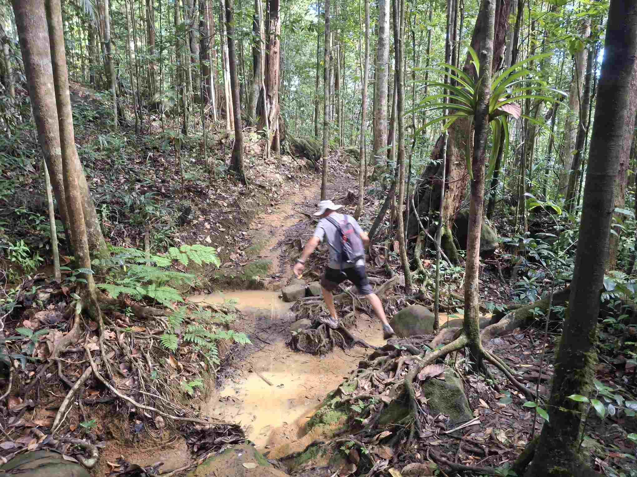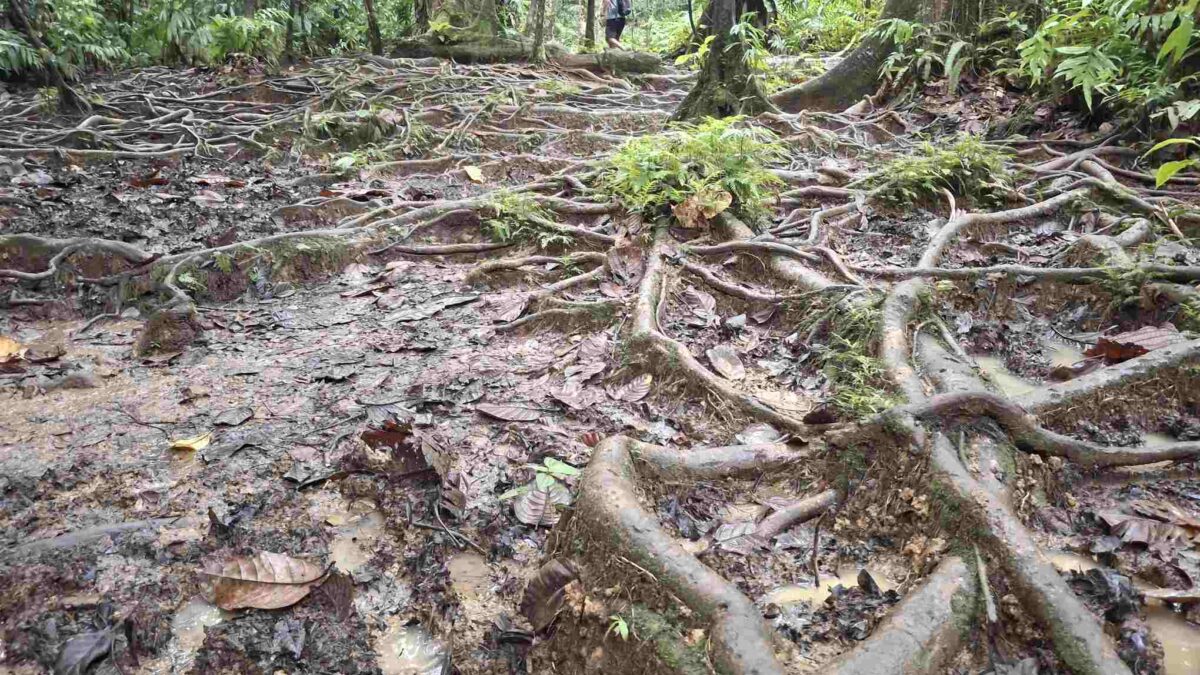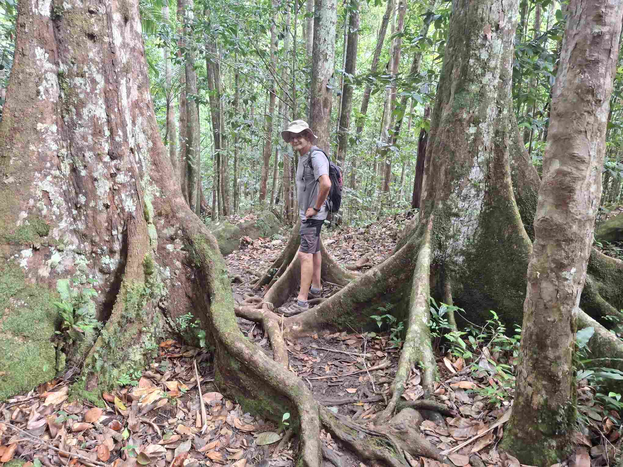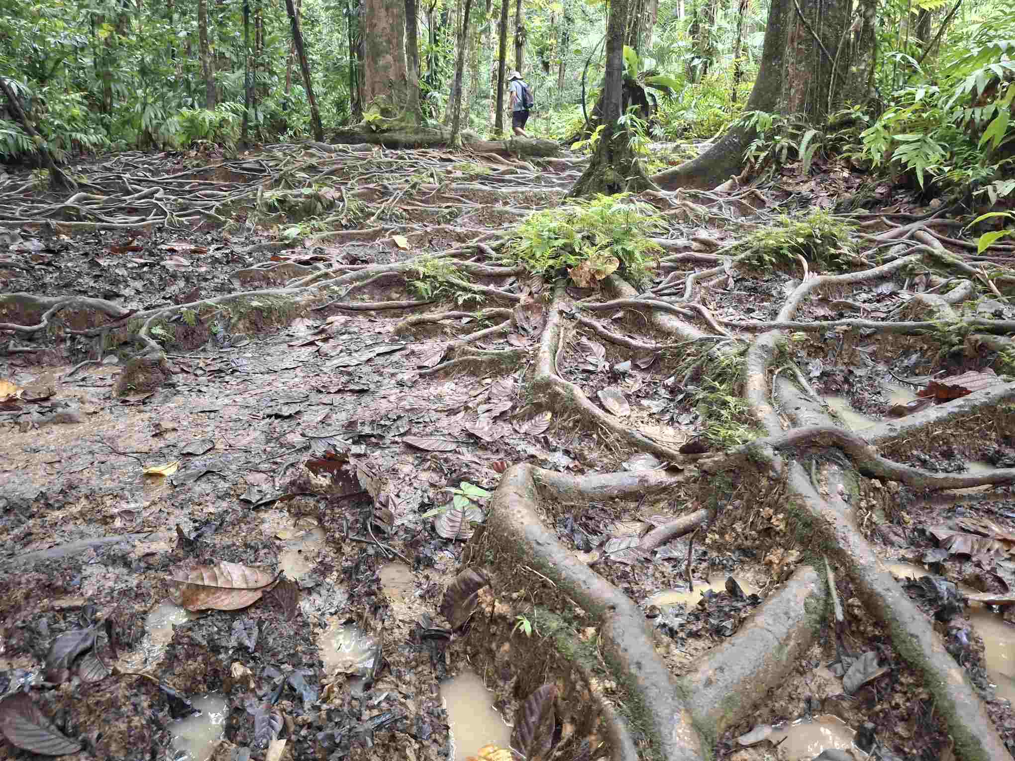 Eigentlich kein besonders schwieriger Wanderweg, aber nach den häufigen Regenfällen der letzten Tage eben doch eine grössere Herausforderung als erwartet: der Weg führte wie erhofft durch den faszinierend grün schillernden Feuchtwald mit seiner unendlichen Vielfalt an Flora (und wohl auch Fauna, nur sehen wir die als Laien kaum). Grüntöne in allen Schattierungen. Pflanzenblätter in allen Formen und Grössen (vor allem 4XL), riesige Bäume, Schlingpflanzen, Farne und dazwischen immer wieder auch kleinste Blümchen oder sonstige Pflanzentriebe. Und am Boden den ganzen Weg lang die verzweigten, rutschigen Wurzeln, in deren Löchern tiefer Matsch nur so darauf wartete, einen unserer Wanderschuhe zu verschlucken.