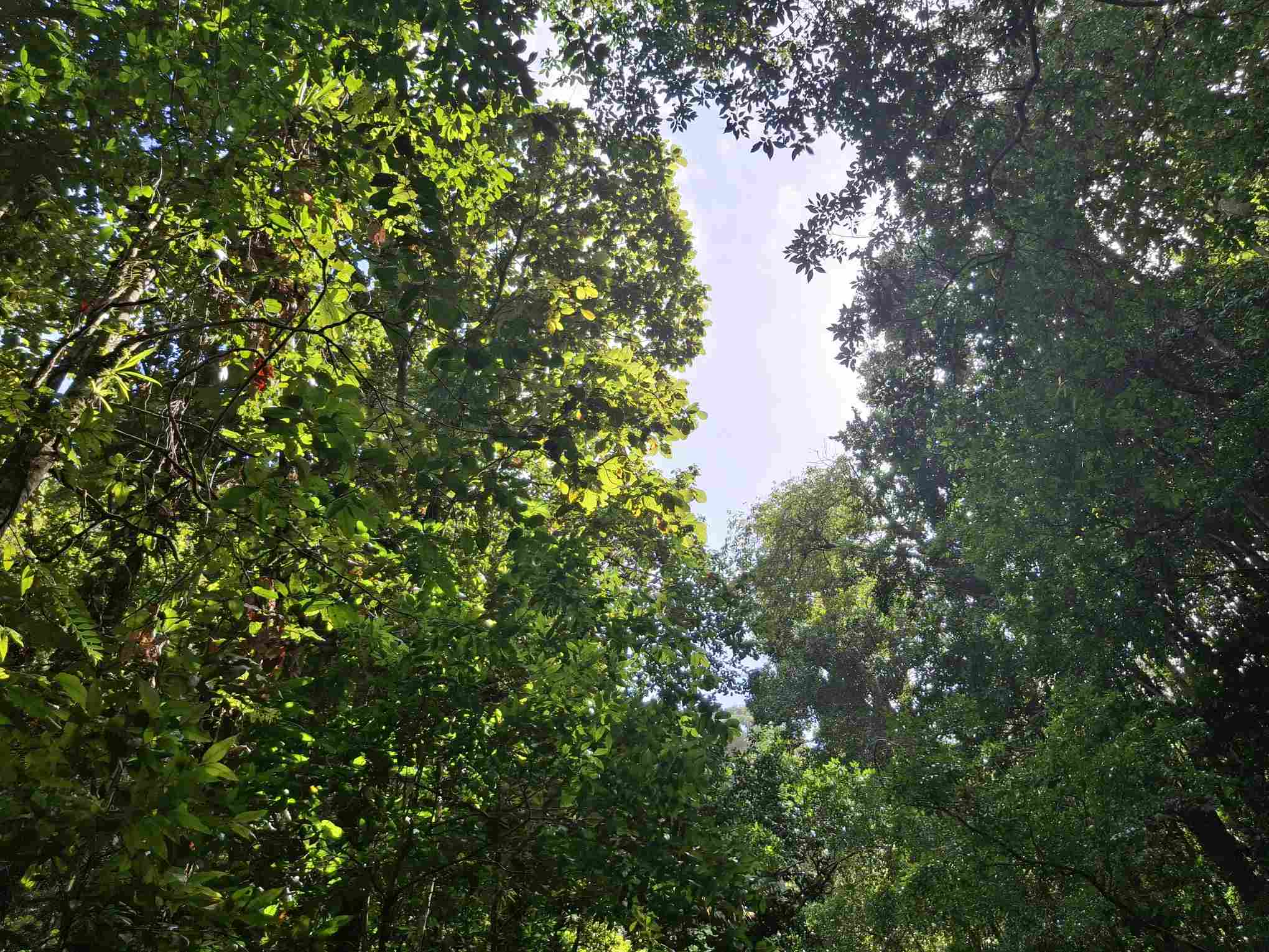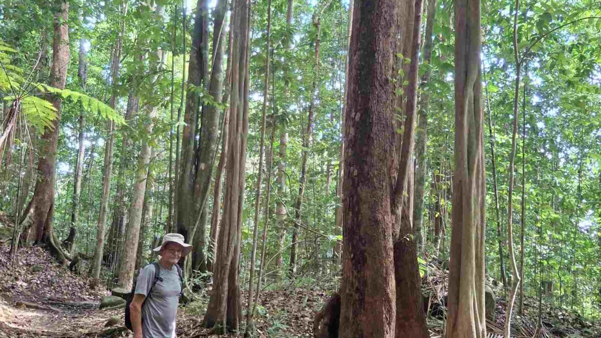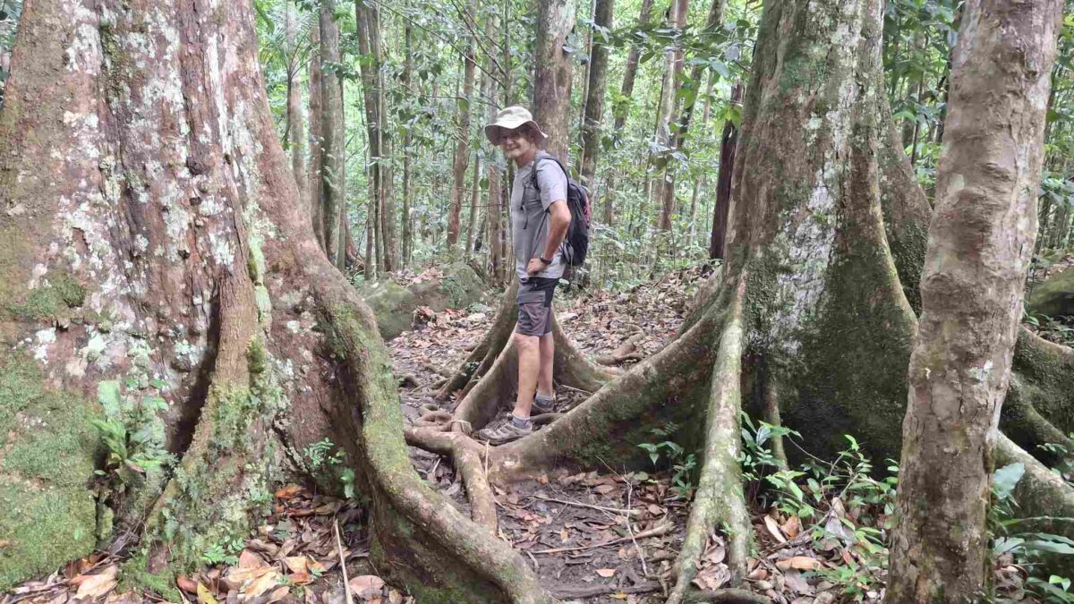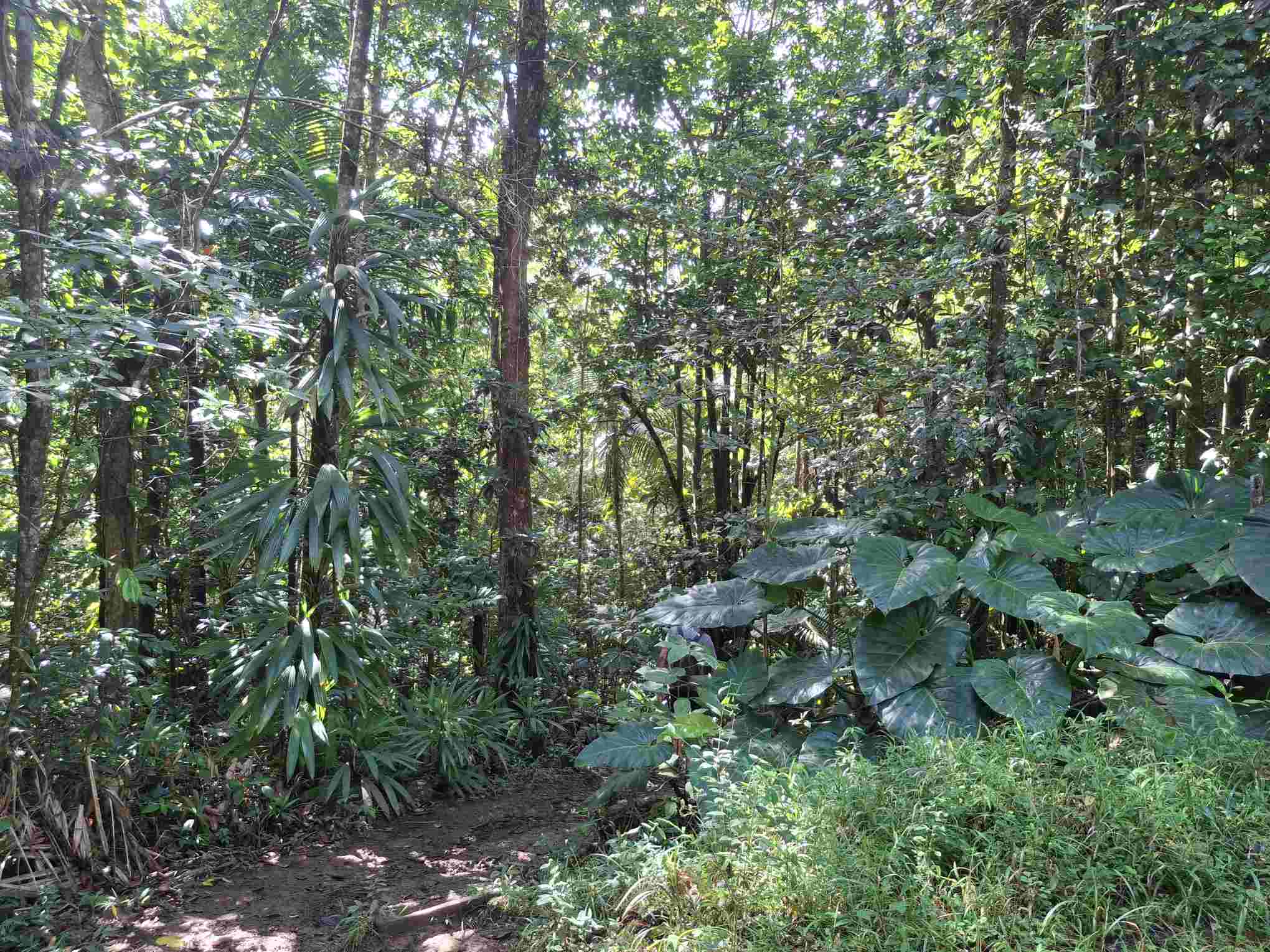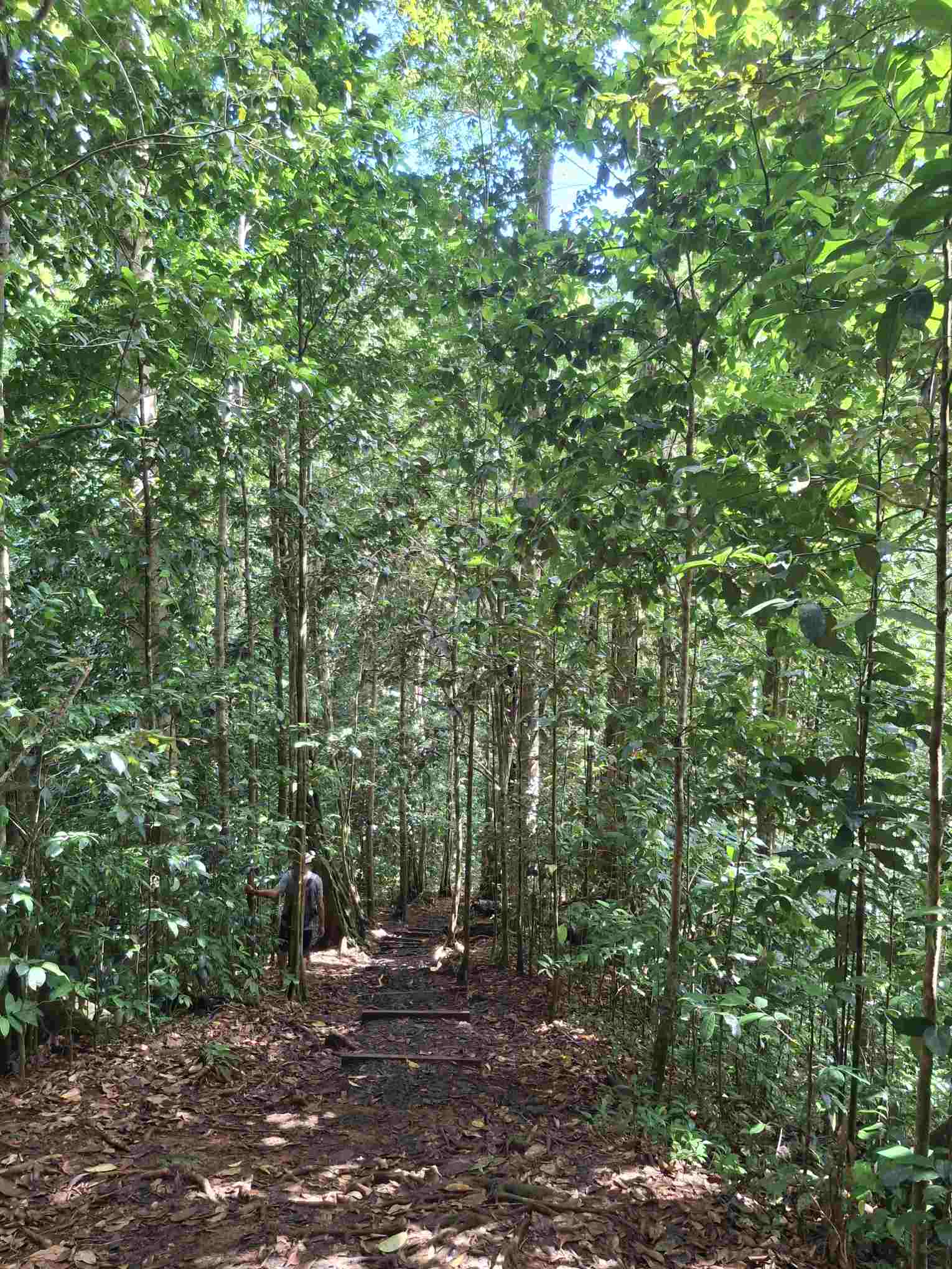 Eigentlich kein besonders schwieriger Wanderweg, aber nach den häufigen Regenfällen der letzten Tage eben doch eine grössere Herausforderung als erwartet: der Weg führte wie erhofft durch den faszinierend grün schillernden Feuchtwald mit seiner unendlichen Vielfalt an Flora (und wohl auch Fauna, nur sehen wir die als Laien kaum). Grüntöne in allen Schattierungen. Pflanzenblätter in allen Formen und Grössen (vor allem 4XL), riesige Bäume, Schlingpflanzen, Farne und dazwischen immer wieder auch kleinste Blümchen oder sonstige Pflanzentriebe. Und am Boden den ganzen Weg lang die verzweigten, rutschigen Wurzeln, in deren Löchern tiefer Matsch nur so darauf wartete, einen unserer Wanderschuhe zu verschlucken.