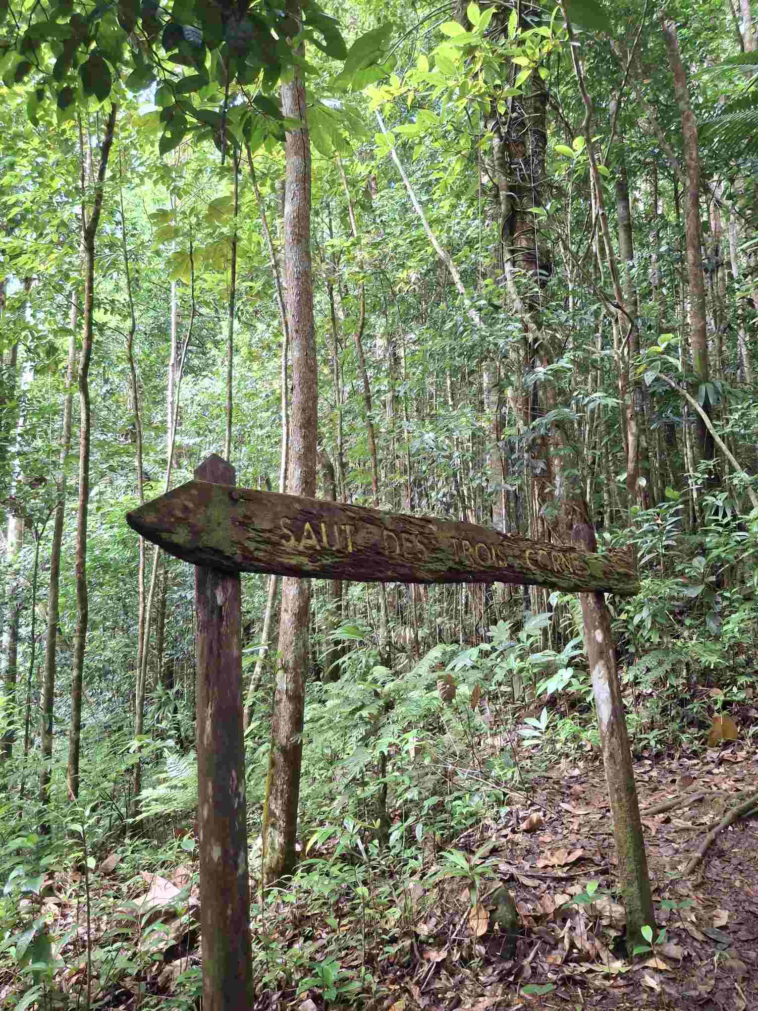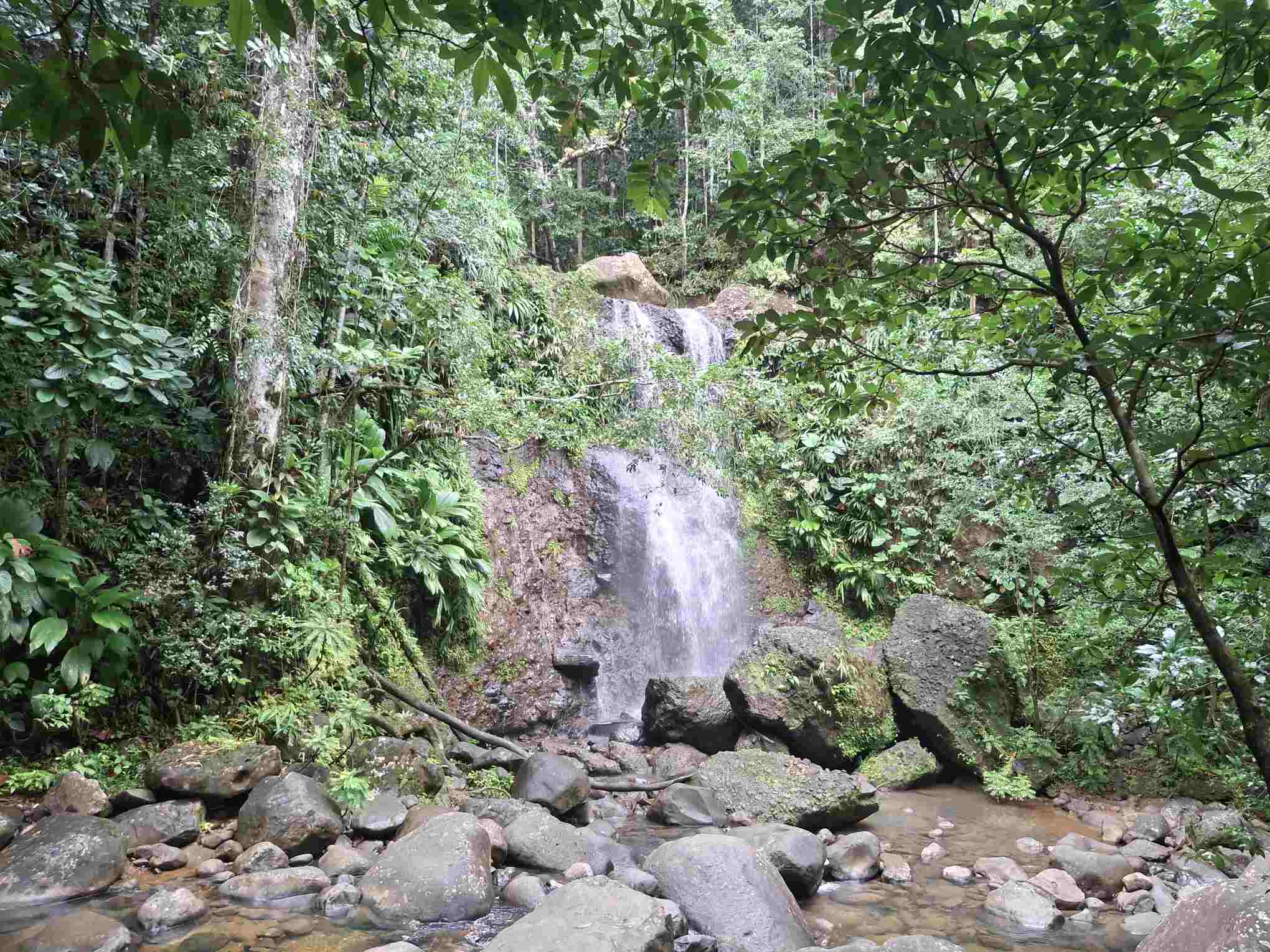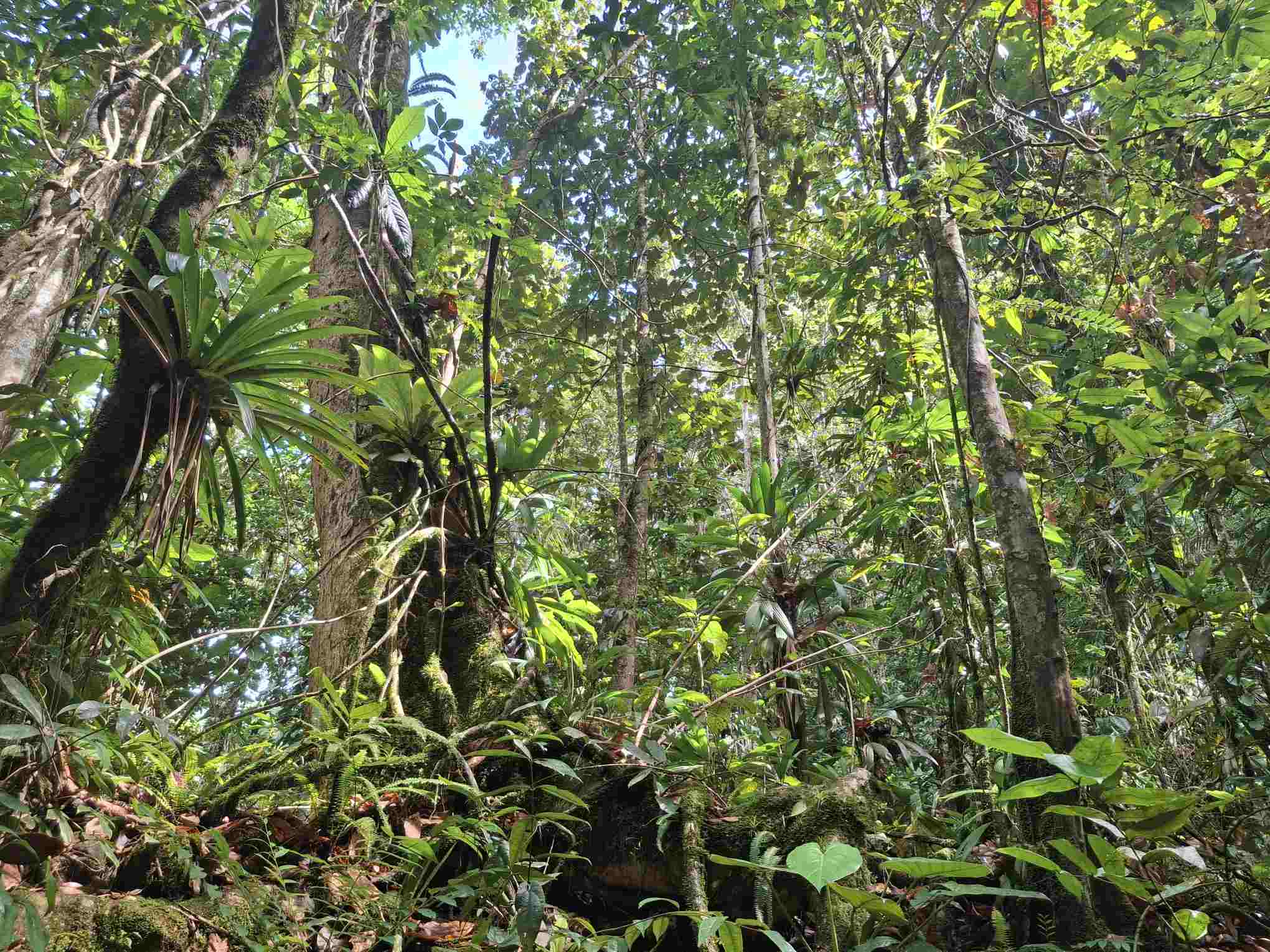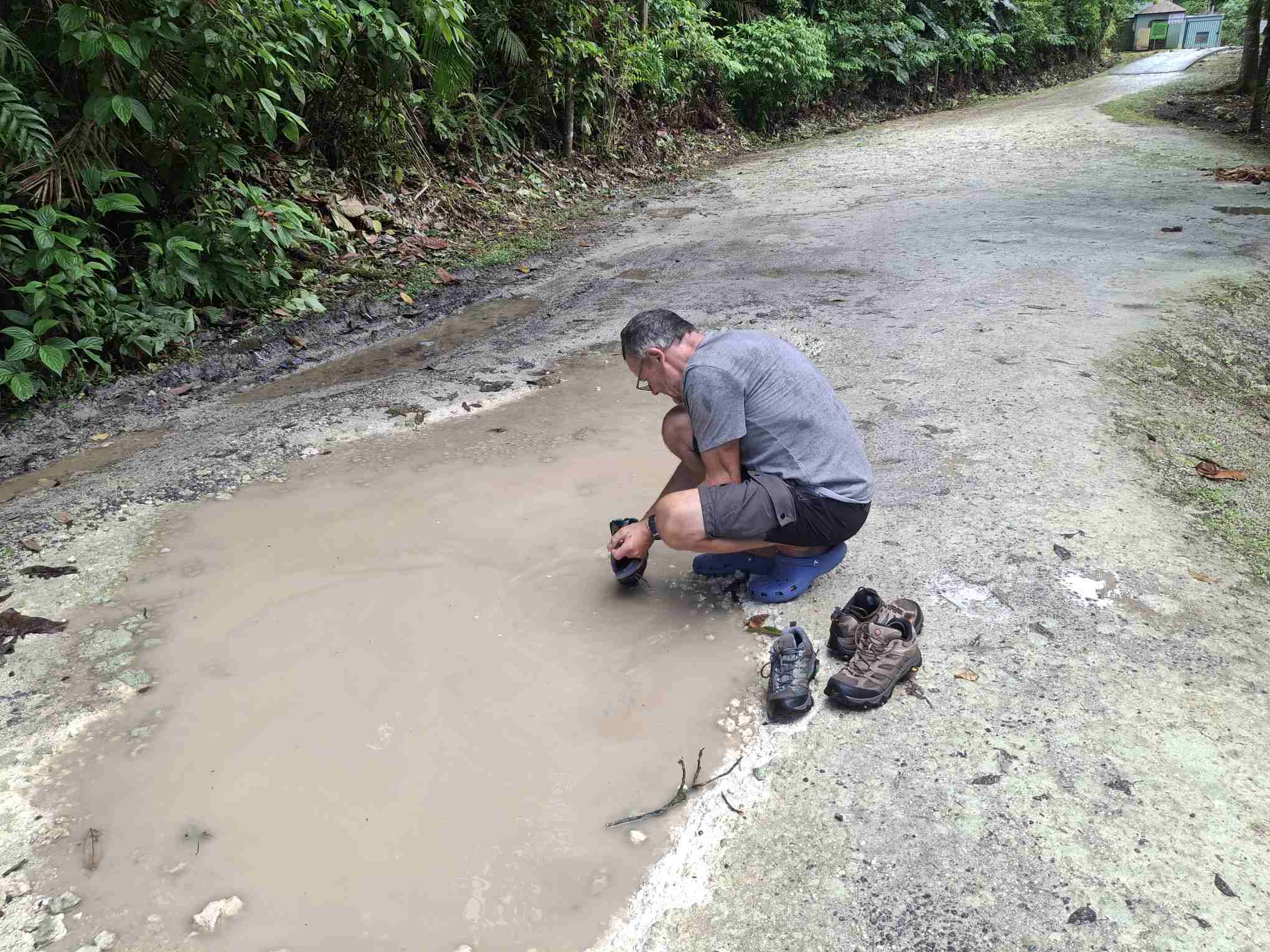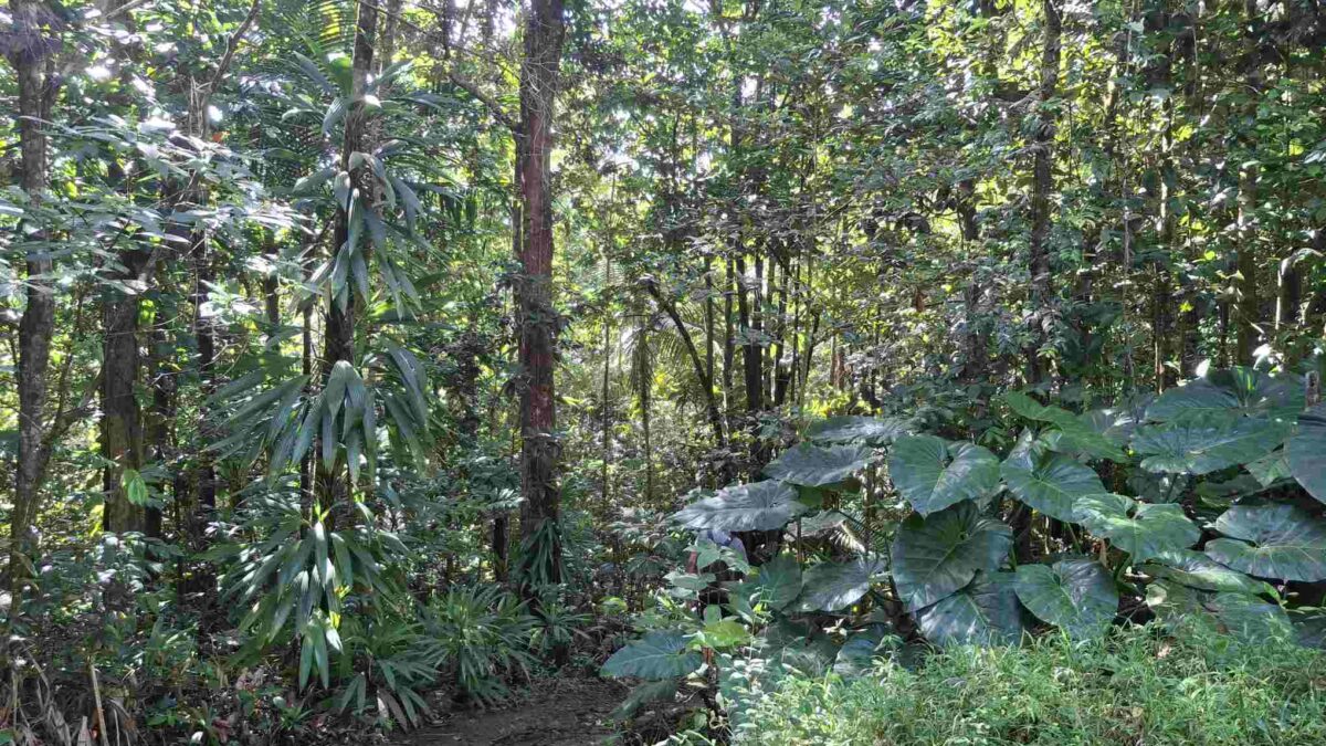 Eigentlich kein besonders schwieriger Wanderweg, aber nach den häufigen Regenfällen der letzten Tage eben doch eine grössere Herausforderung als erwartet: der Weg führte wie erhofft durch den faszinierend grün schillernden Feuchtwald mit seiner unendlichen Vielfalt an Flora (und wohl auch Fauna, nur sehen wir die als Laien kaum). Grüntöne in allen Schattierungen. Pflanzenblätter in allen Formen und Grössen (vor allem 4XL), riesige Bäume, Schlingpflanzen, Farne und dazwischen immer wieder auch kleinste Blümchen oder sonstige Pflanzentriebe. Und am Boden den ganzen Weg lang die verzweigten, rutschigen Wurzeln, in deren Löchern tiefer Matsch nur so darauf wartete, einen unserer Wanderschuhe zu verschlucken.