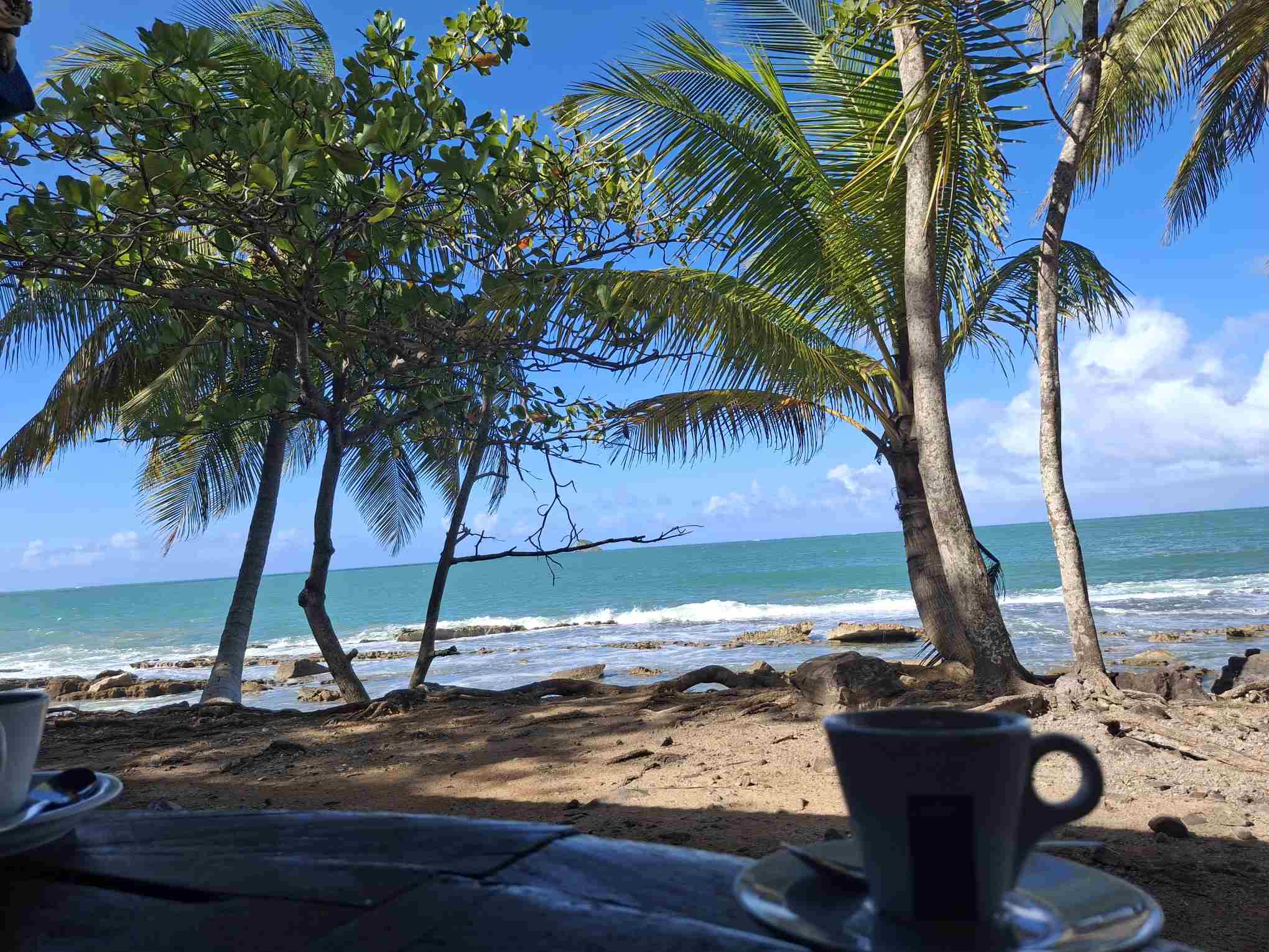 Dort sprach uns der Garten mehr an als die Ausstellung und schon bald waren wir wieder unterwegs, der Küstenstrasse entlang. Ein idyllisch gelegenes Restaurant in der Baie de Cugny lieferte zwei feine Espressi.