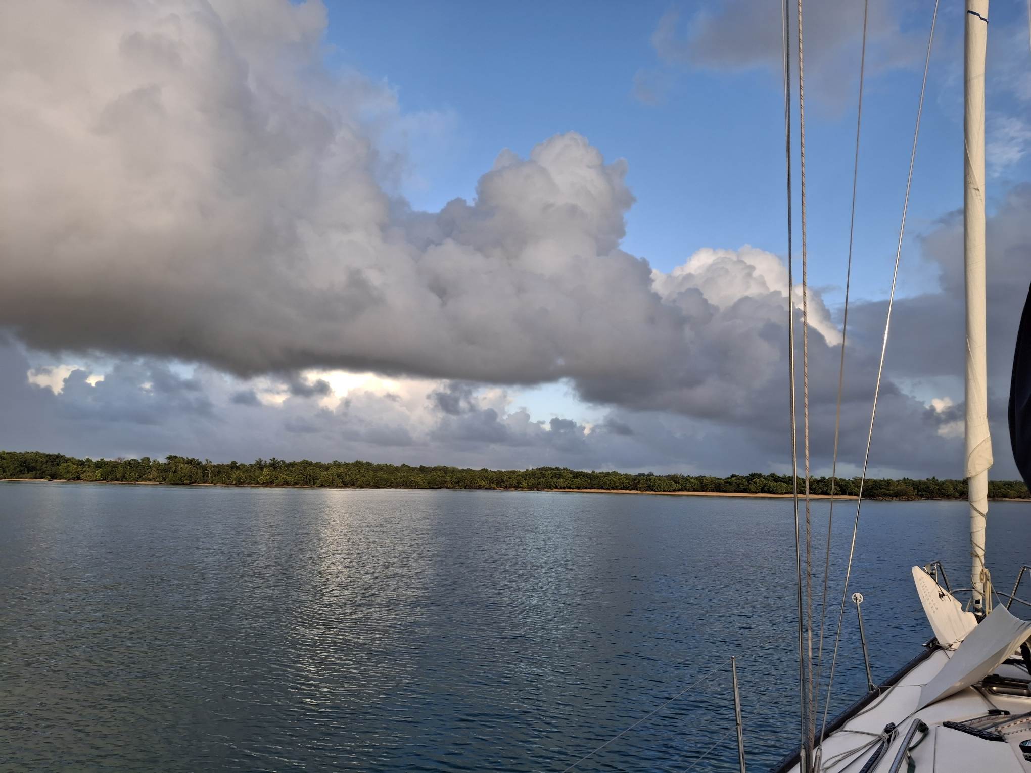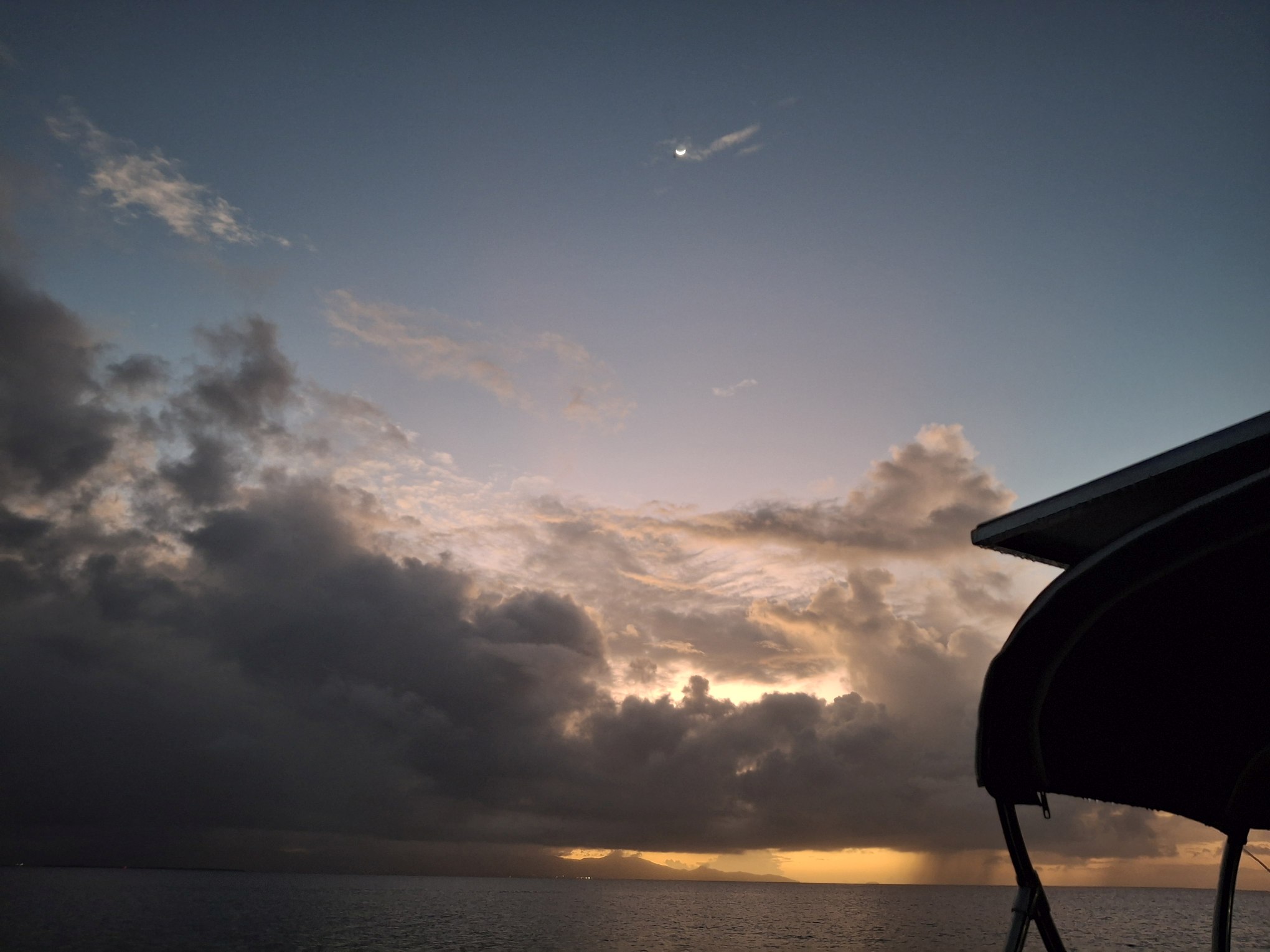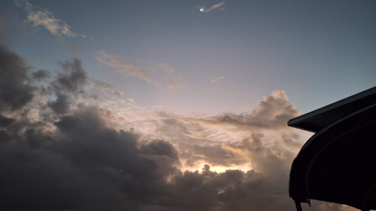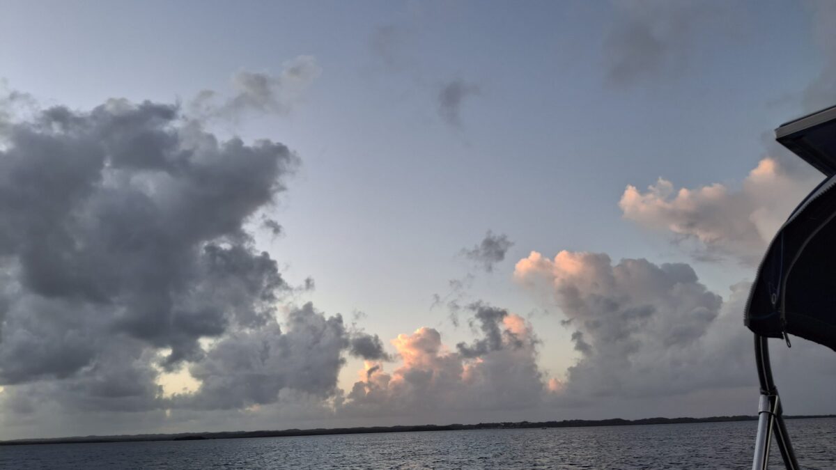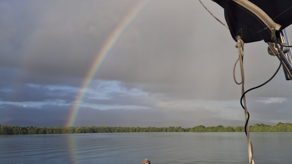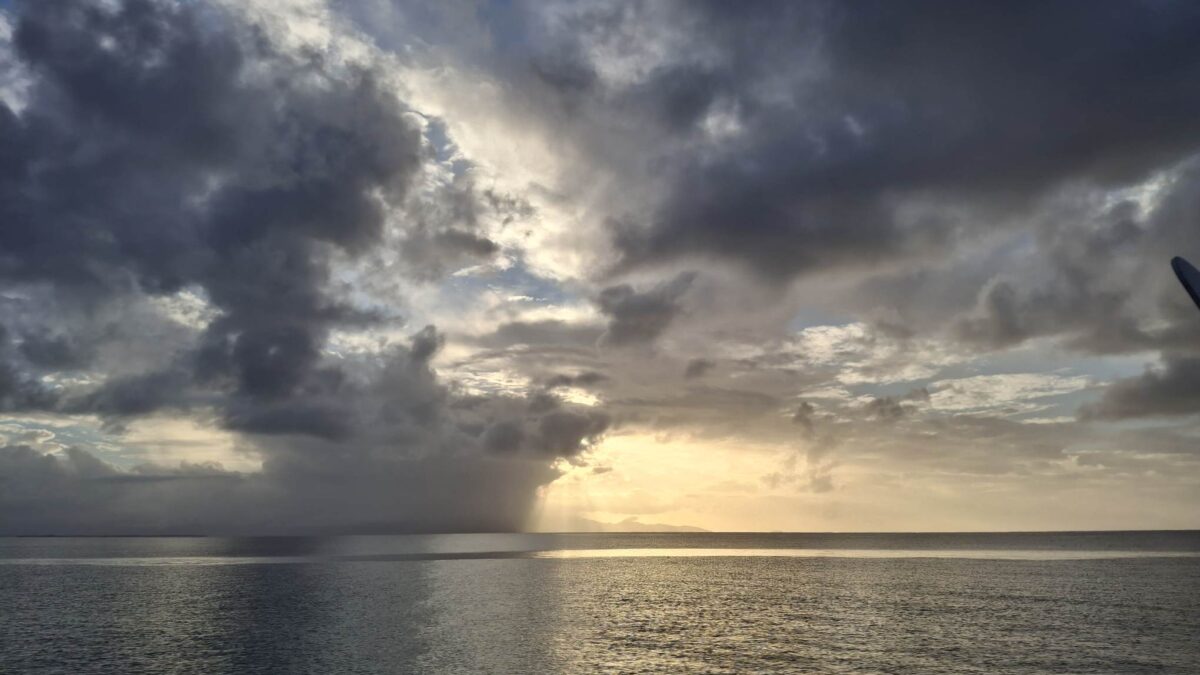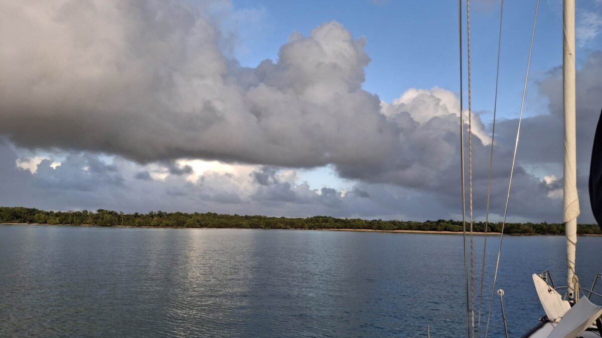 Antigua? Morgen? Übermorgen? Die Unruhe beginnt sich allmählich auszubreiten. Andererseits – es gefällt uns hier eben auch noch immer und gerade zieht wieder ein Schauer in unserem Süden durch… Und abends, wenn sich der Wind legt, zaubert es hier so wunderschöne Stimmungen.