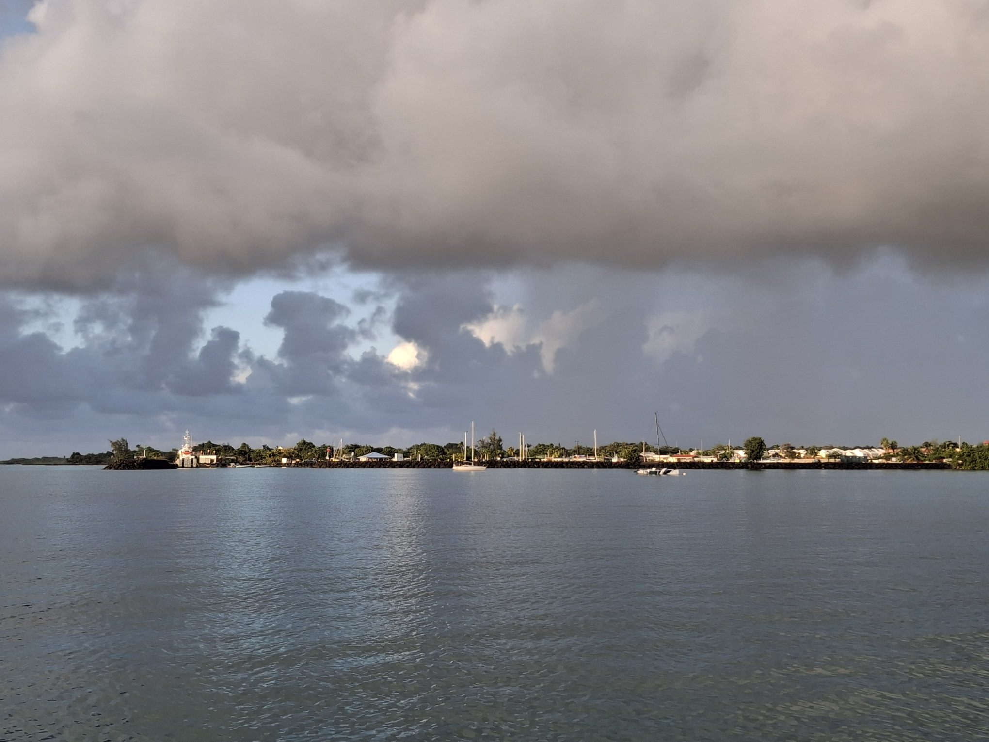 Nachmittags verlegten wir in einer Schauerpause dann doch aus unserer einsamen Lage im weiten Wasser näher ans Land vor Port St. Louis. Hier ist der Weg zum Café oder zur Bar nun doch etwas weniger weit. Und die Grille, die sich wohl schon in Baie Mahault irgendwo in unserem Dinghy eingerichtet hat, hat eine Chance, vielleicht wieder an Land zu gelangen, bevor wir uns aufraffen und in Richtung Antigua losfahren. (Ein unerwartetes Geräusch, wenn vom Dinghy her mitten im Meer das typische Zirpen ertönt! Ob Grillen wohl seekrank werden können?)