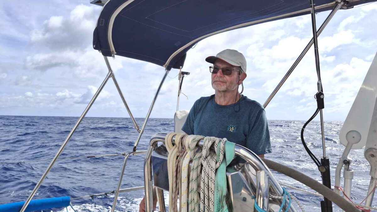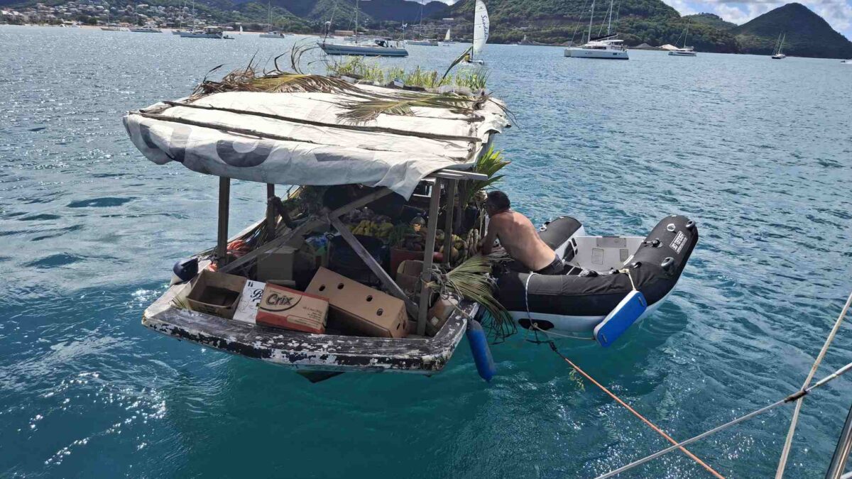 Wir hatten uns in den letzten Tagen so viele Gedanken dazu gemacht, mehrfach die Aufhängung diskutiert und immer wieder bei anderen Booten abgeschaut, wie sie bei denen funktionierten. Lazy Jacks sind dünne Leinen, die auf beiden Seiten des Grosssegels aufgespannt werden, damit man beim Bergen des Segels das Tuch einfach in dieses Netz fallen lassen kann. Dass wir seit Jahrzehnten keine solchen Helferlein haben, liegt daran, dass sich das Segel beim Setzen sehr häufig darin verfängt. Aber wir dachten, man könne ja mit zunehmendem Alter mal schauen, ob es nicht doch eine Vereinfachung wäre. Und so wendete ich beim markanten Felsen „le Diamant“ hin und her, damit der Skipper jeweils an die entsprechende Seite des Segels kam, um die Leinen zu montieren. Nach einiger Zeit sah es recht gut aus und wir waren gespannt, wie das dann beim Bergen gehen würde. Kurz vor St. Anne, als der Wind anfing, aus dem Loch von Le Marin zu pfeifen, war es dann so weit. Die Lazy Jacks wurden aufgespannt und dann das Fall (die Leine, welche das Segel oben hält) freigegeben. Und es passierte – nichts. ☹ Weil unser schönes Grosssegel aus steifem Material ist und zusätzlich von durchgehenden Latten in Form gehalten wird, ist es etwas unhandlicher als ein einfaches Dacron-Segel und muss Meter für Meter heruntergeholt werden, auch wenn man ziemlich gerade im Wind steht. Das hatten wir ja eigentlich auch erwartet. Aber was dann zuerst für lange Gesichter und dann für viel Erheiterung sorgte, war der Wust an Segelmaterial, der sich in den Lazy Jack Leinen aufbauschte wie die Federn eines angriffigen Schwans. Wegen der Lazy Jacks konnte man nämlich nicht dafür sorgen, dass sich unser hartes Segel auch hinten am Baum schön in Falten legte. Wir brauchten danach mindestens eine Viertelstunde, um unseren Segelwust einigermassen zu bändigen und deckten das Ergebnis schnell mit der Persenning zu: aus den Augen, aus dem Sinn.