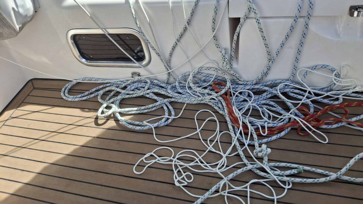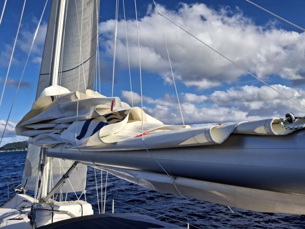 Fazit: ok, die Lazy Jacks können dran bleiben, wenn wir es hinkriegen, dass sie nicht in der Gegend rum baumeln, aber benützt werden sie nur in Notfällen, wenn das Segel einfach runter muss und das Auftuchen absolut sekundär ist. Ich bin ja gespannt, ob wir sie am Ende dieser Tour im Juni noch dran haben werden oder nicht!
