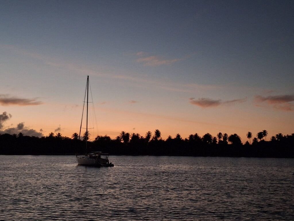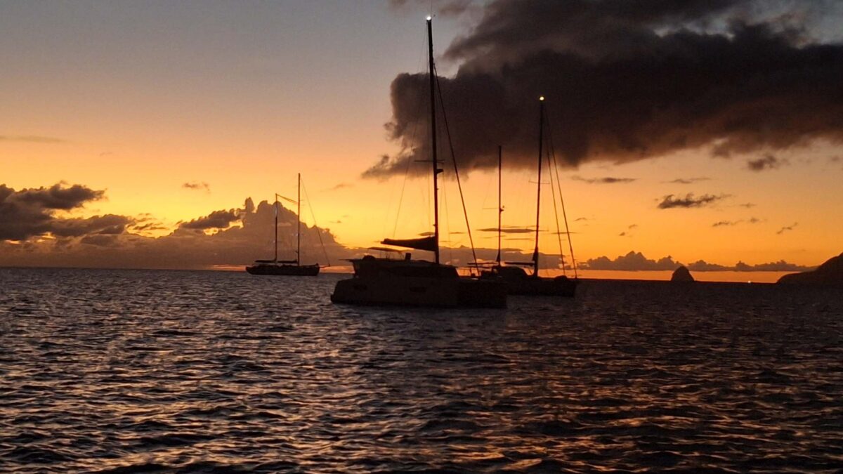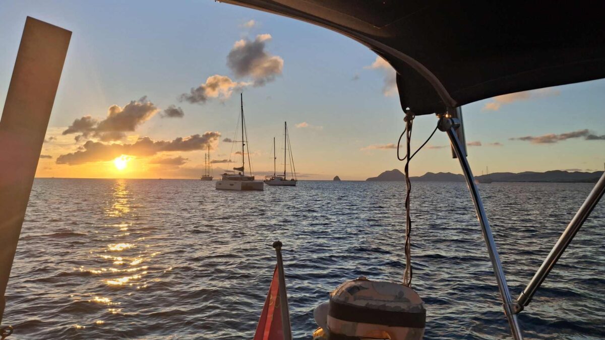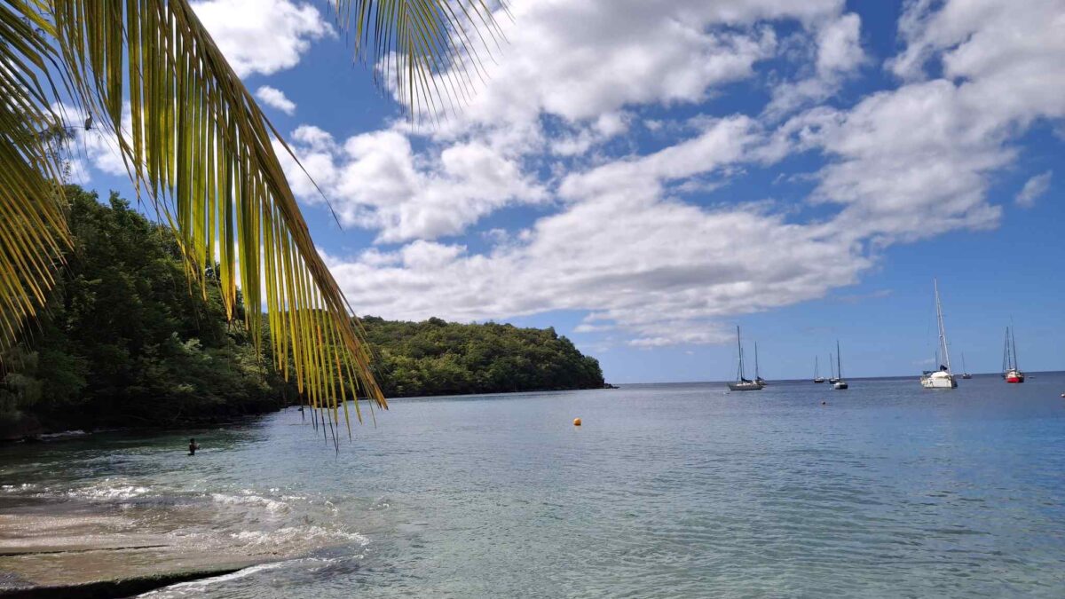 Es wurde ein wunderbarer, sonniger Segelnachmittag und um 16h fiel der Anker im grünen Wasser vor dem Palmenstrand. Während sich nördlich von uns vor dem Ort „Les Anses d’Arlet“ die Boote ein wenig zu drängen schienen, war es bei uns mit 3-4 Nachbarn gemütlich ruhig. Am Ufer lagen ein paar Motorboote mit dem entsprechenden Sound aus ihren Boxen, aber die packten wie üblich gegen 17h ihre Siebensachen zusammen und für den Sundowner hatten wir die Bucht für uns und teilten sie nur noch mit den unzähligen Grillen am Ufer.