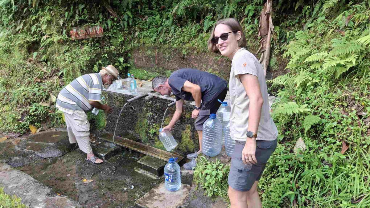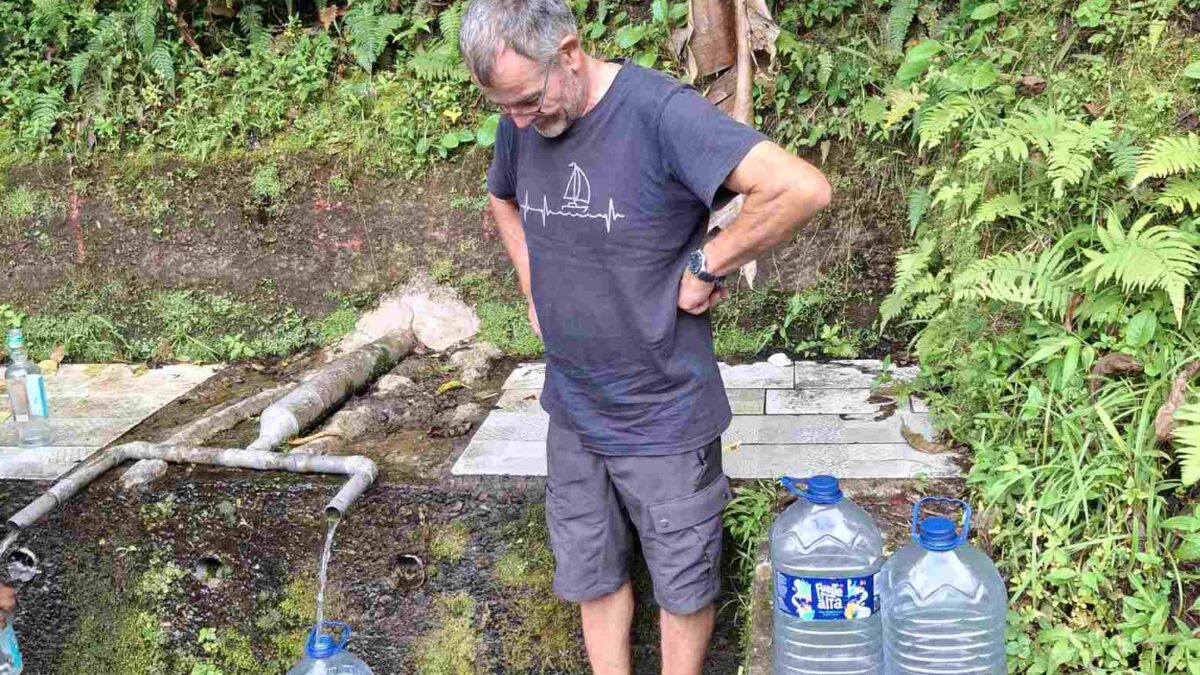 Am Rückweg gabs dann nicht nur reines Quellwasser für unsere mitgebrachten Wasserkanister, sondern auch wieder ein kühlendes Bad im reichlichen aber ungewohnt kühlen Süsswasser eines weiteren Flüsschens an der Strasse. Müde gings abends wieder zurück an Bord.