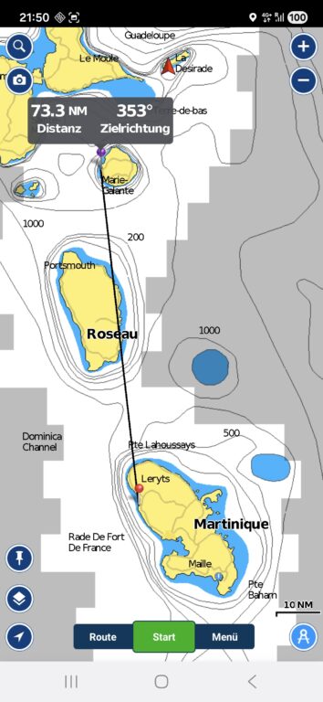 Die Überfahrt von Martinique nach Marie Galante an Dominica auf dessen Luvseite vorbei ist ca. 80 SM weit nach Norden.