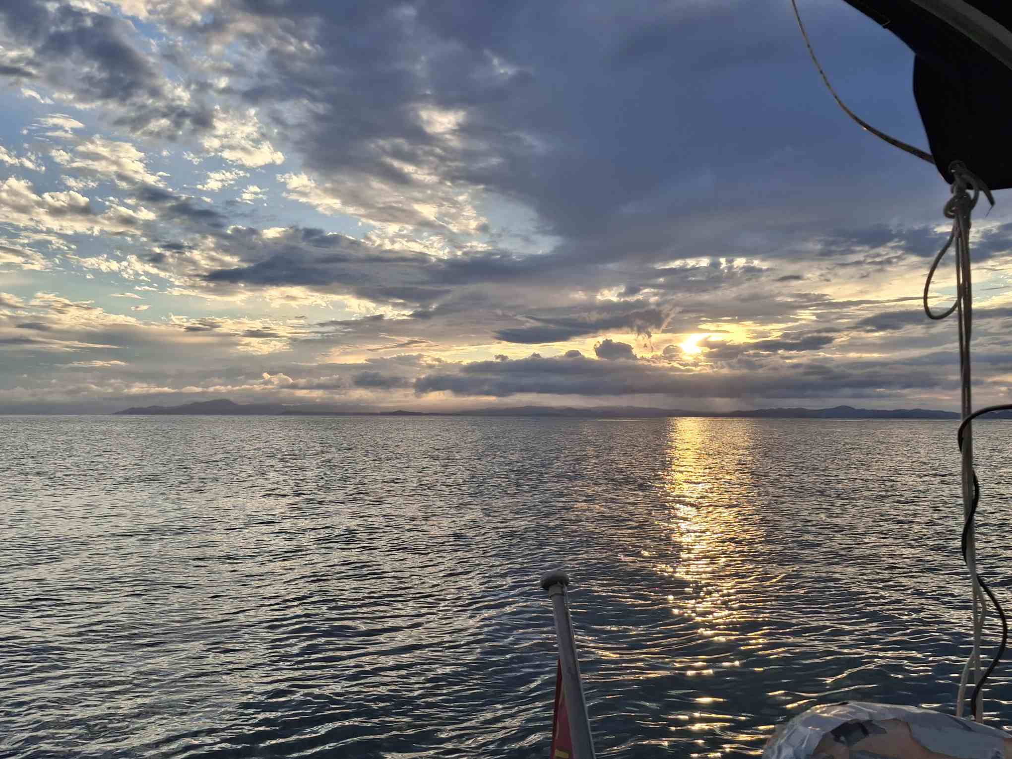 Die Rückfahrt per Dinghy zu sea magiX an ihrer einsamen Boje wurde auch in der Bucht ziemlich bumpy und nass: da draussen blies noch immer starker Ostwind. Weil man an der Tagesboje nicht übernachten darf, motorten wir nach dem Ausflug wieder zurück zu unserem Sandfleck und stellten fest, oh Schreck, dass sich zwei Motorboote darauf eingerichtet hatten. Eines davon ein Motorkat mit sehr vielen Solarpaneelen; das wäre wohl ein spannendes Boot, um mal nähere Bekanntschaft zu machen. Aber vorerst mussten wir uns einen anderen Fleck zum Ankern suchen. Beim zweiten Versuch hielt der Anker dann auch etwas weiter drüben in der Bucht. Der Blick beim Kontroll-Schnorchelgang kurz vor Sonnenuntergang zeigte dann jedoch klar, dass dies eine weniger ruhige Nacht werden würde: wir lagen auf felsigem Grund und die Kette rumpelte hörbar über die Steine hin und her. Naja, das konnten wir nicht ändern.