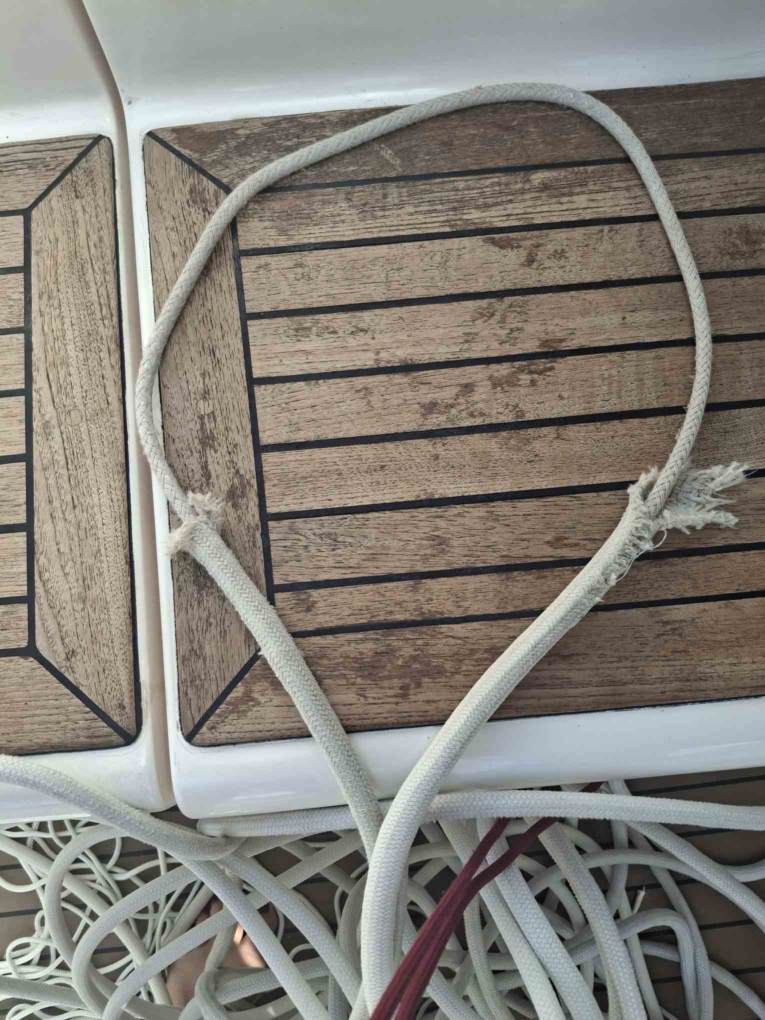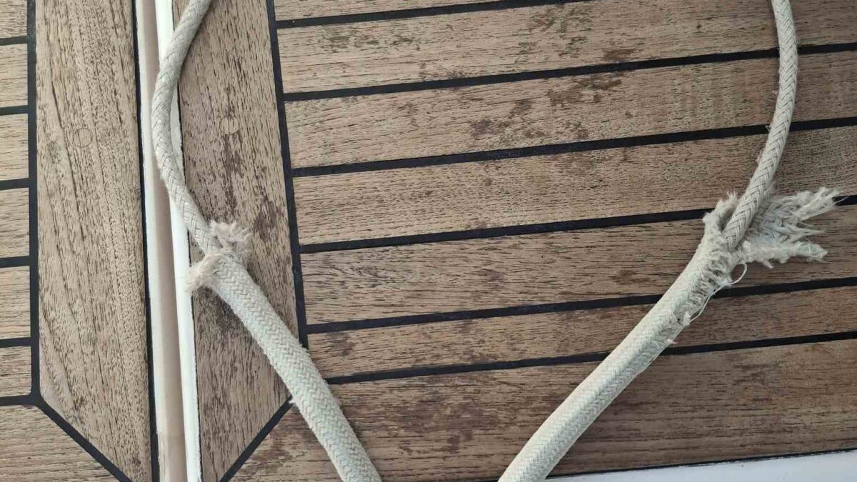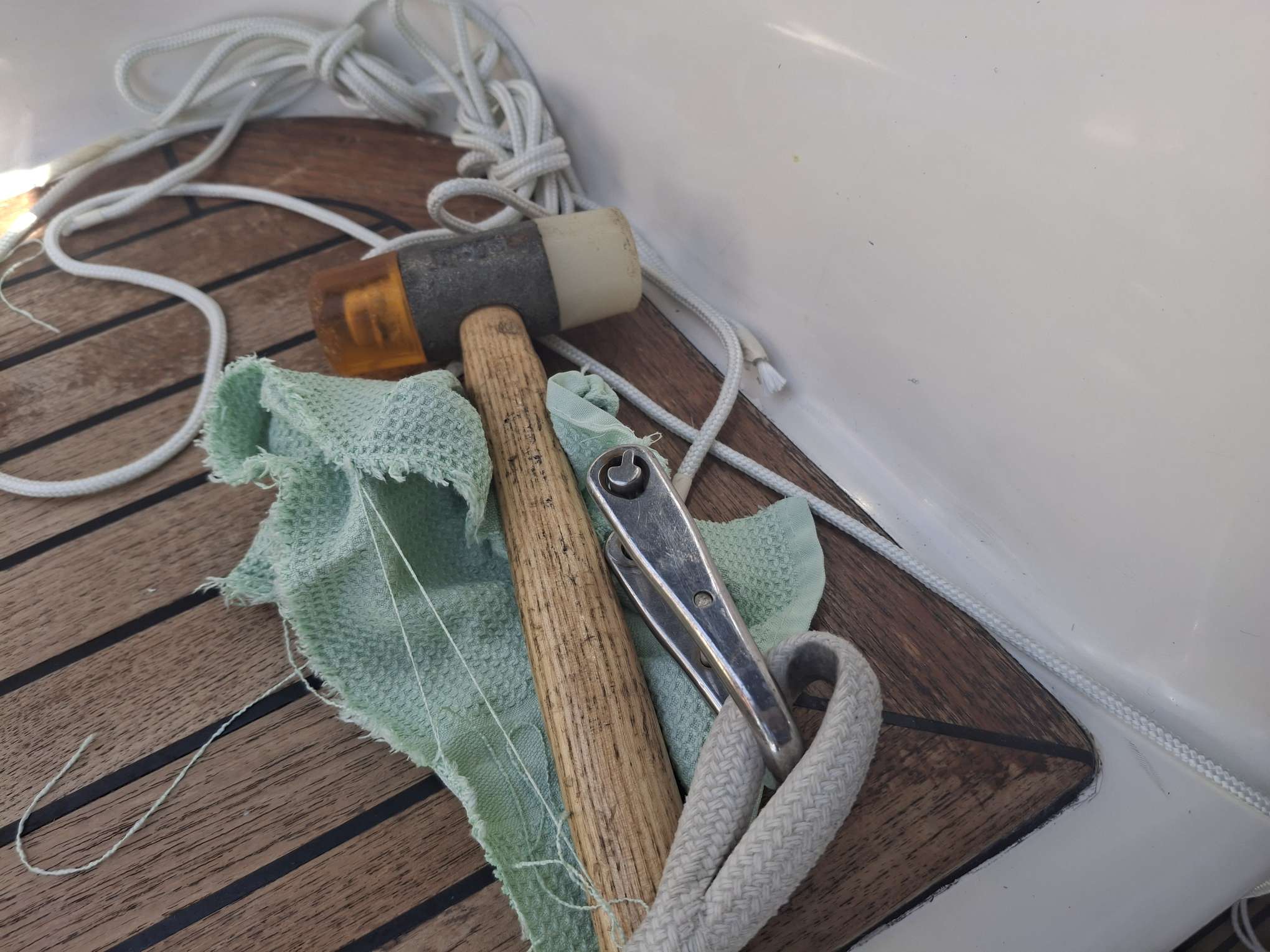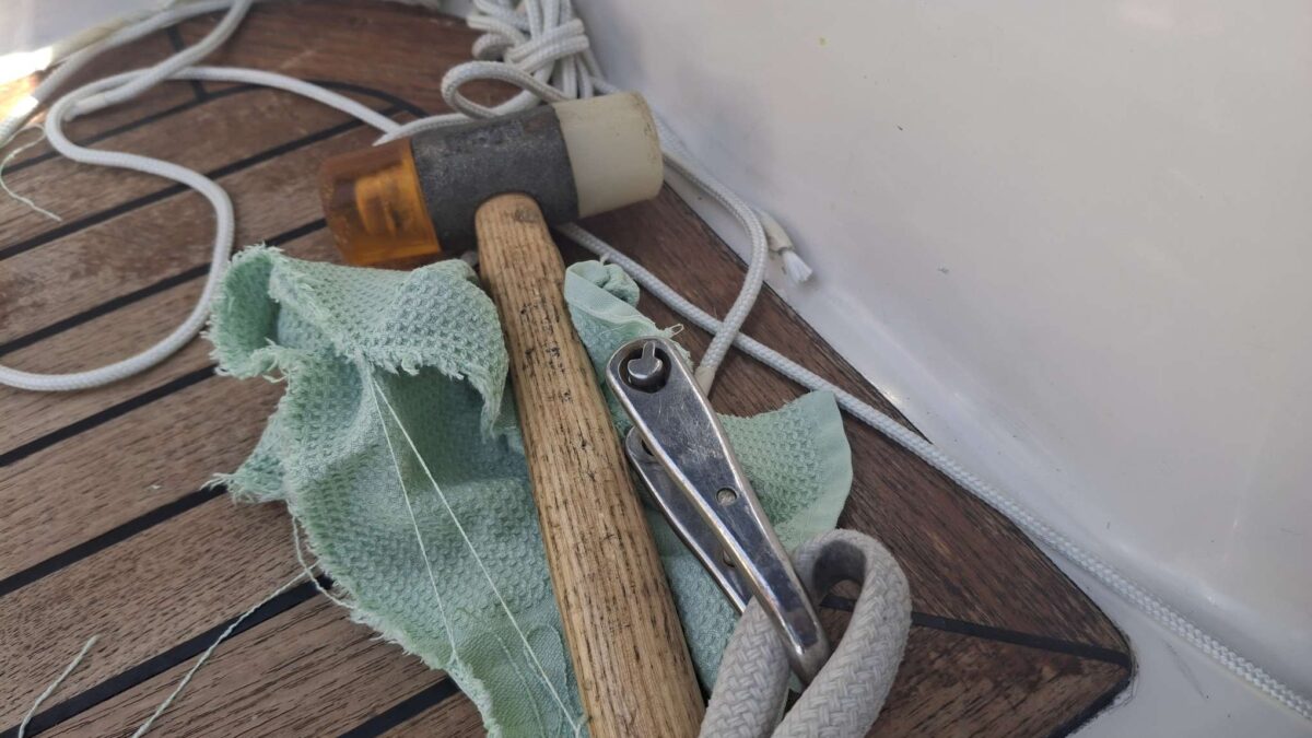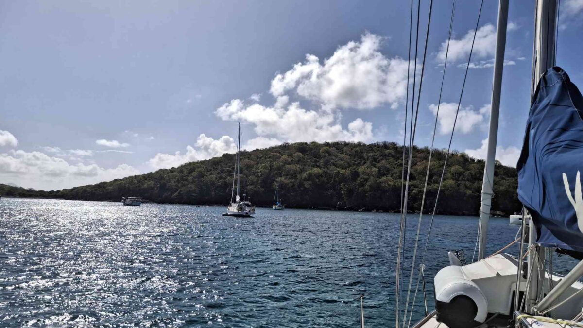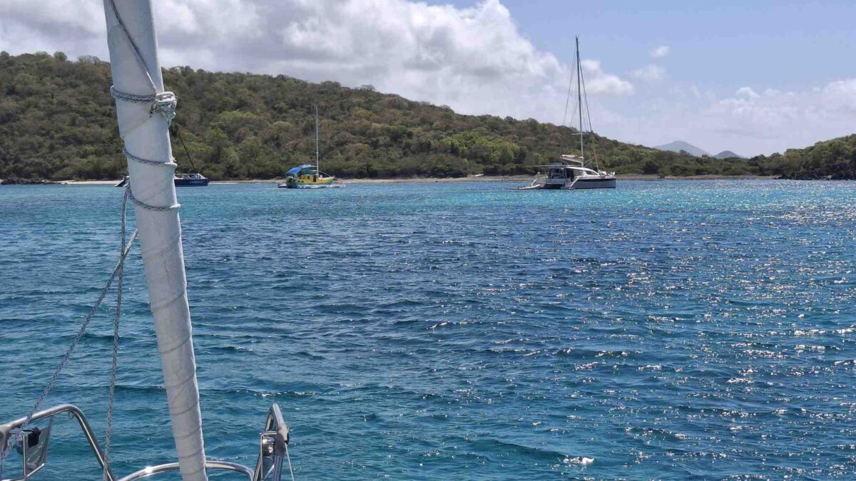 Wie üblich segelten wir bis kurz vor den Ankerplatz. Als es dann darum ging, das Grosssegel zu bergen, wollte es aber nicht herunter kommen. Von hinten tönte es “zieh doch endlich runter!” während von vorne die Bucht und die darin versammelten Ankerlieger allmählich näher rückten. Sea magiX hielt unter Autopilot unbeirrbar auf das Heck einer dicken Ami-Jacht zu, während ich am Vorliek des Grosssegels hing und nichts passierte… Oje, not good. Platzwechsel: der Skipper vorne und ich (in einem unbeobachteten Moment schnell den Kurs etwas weiter hinaus richtend ;-)) hinten. Mit etwas Vorwissen hatte es der Skipper bald erkannt: unser Grossfall (das Seil, an dem man das Grosssegel hochzieht) war so aufgerieben, dass es beim Mast nicht mehr durchs Loch passte. Mit einem scharfen Messer, ein paar Schimpfwörtern und beherztem Eingreifen hatte Bänz das Problem bald gelöst und wir konnten unser grosses Segel doch noch rechtzeitig wegpacken. Alles klar – die nächste Pendenz hatte sich soeben unmissverständlich angemeldet.