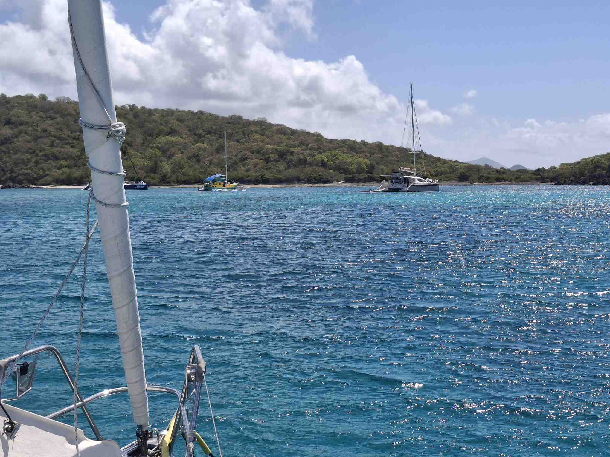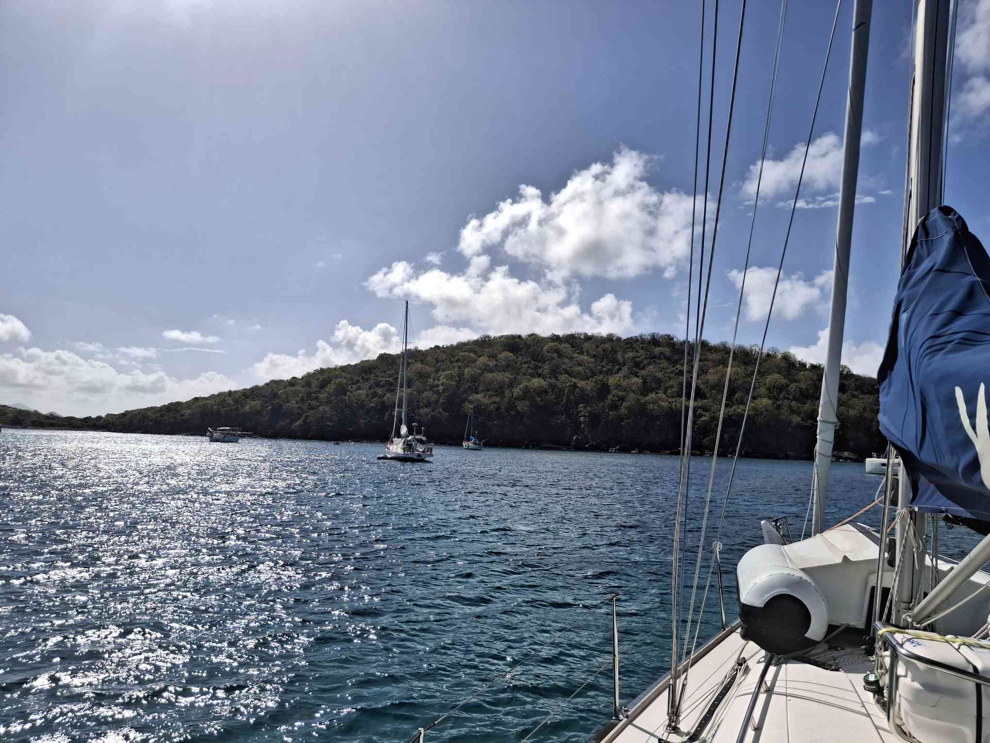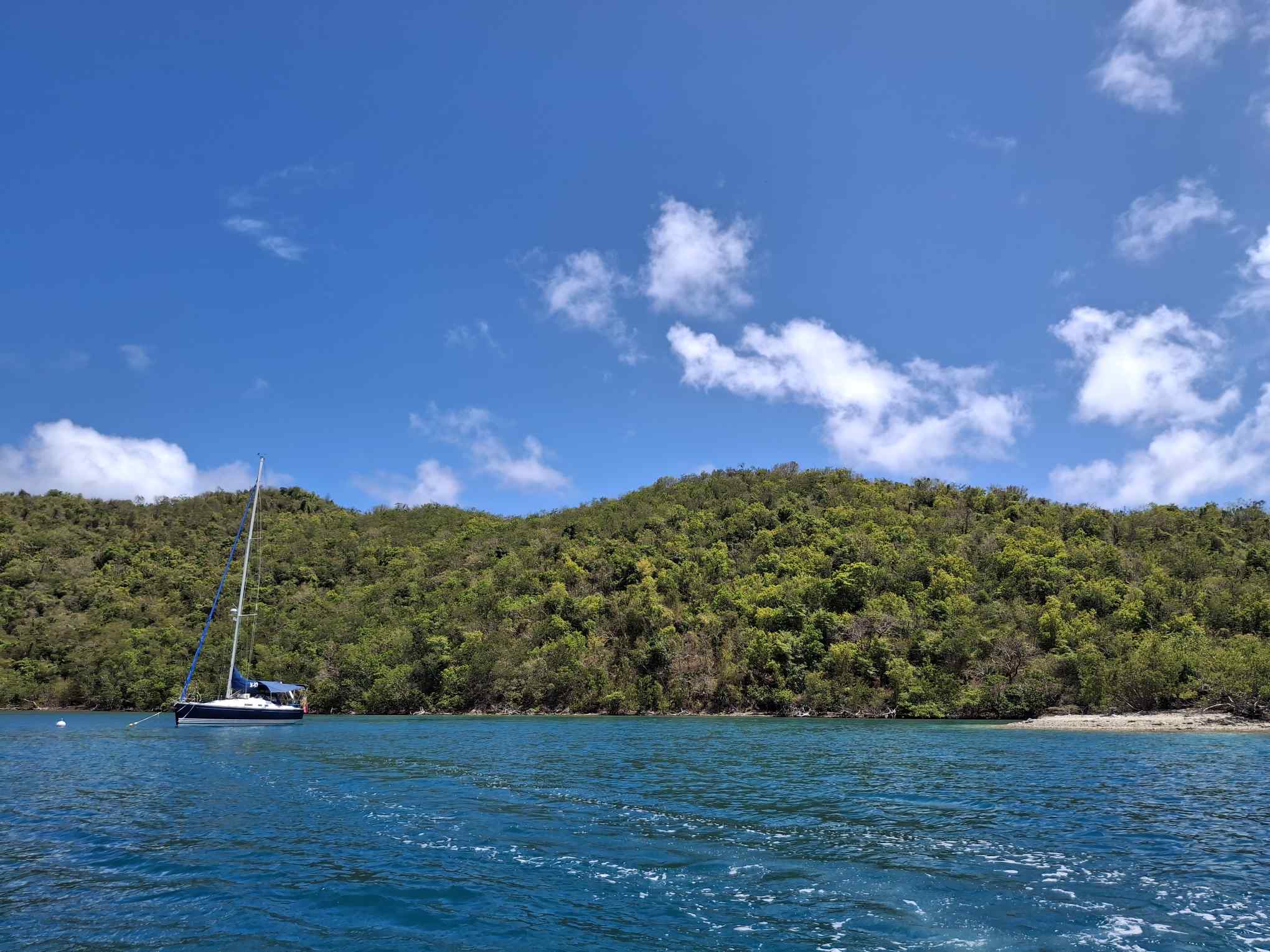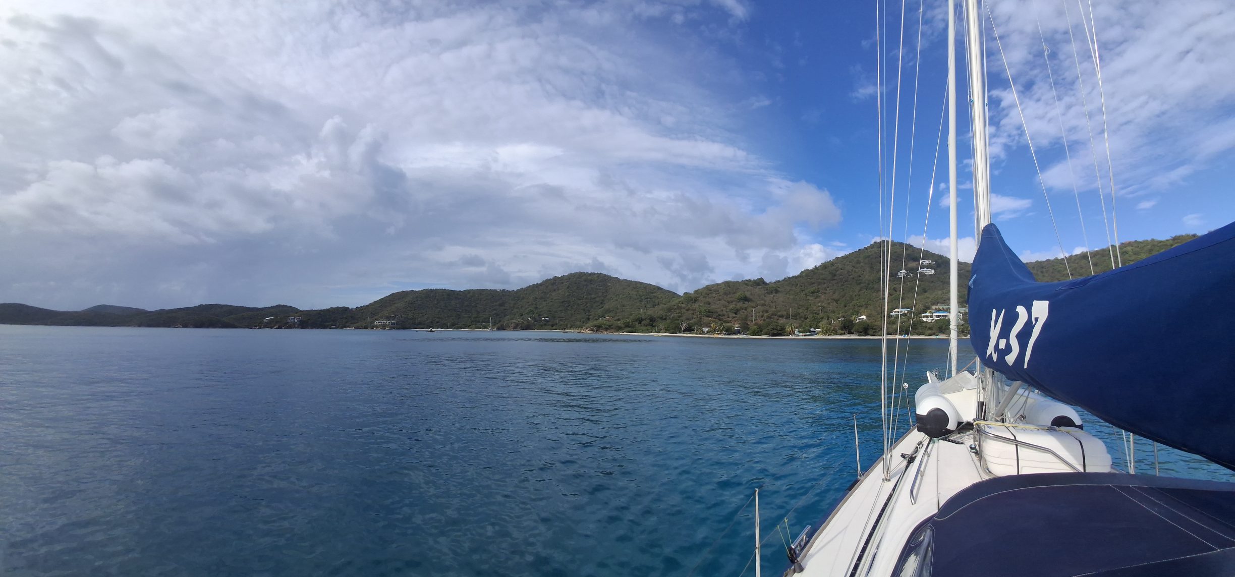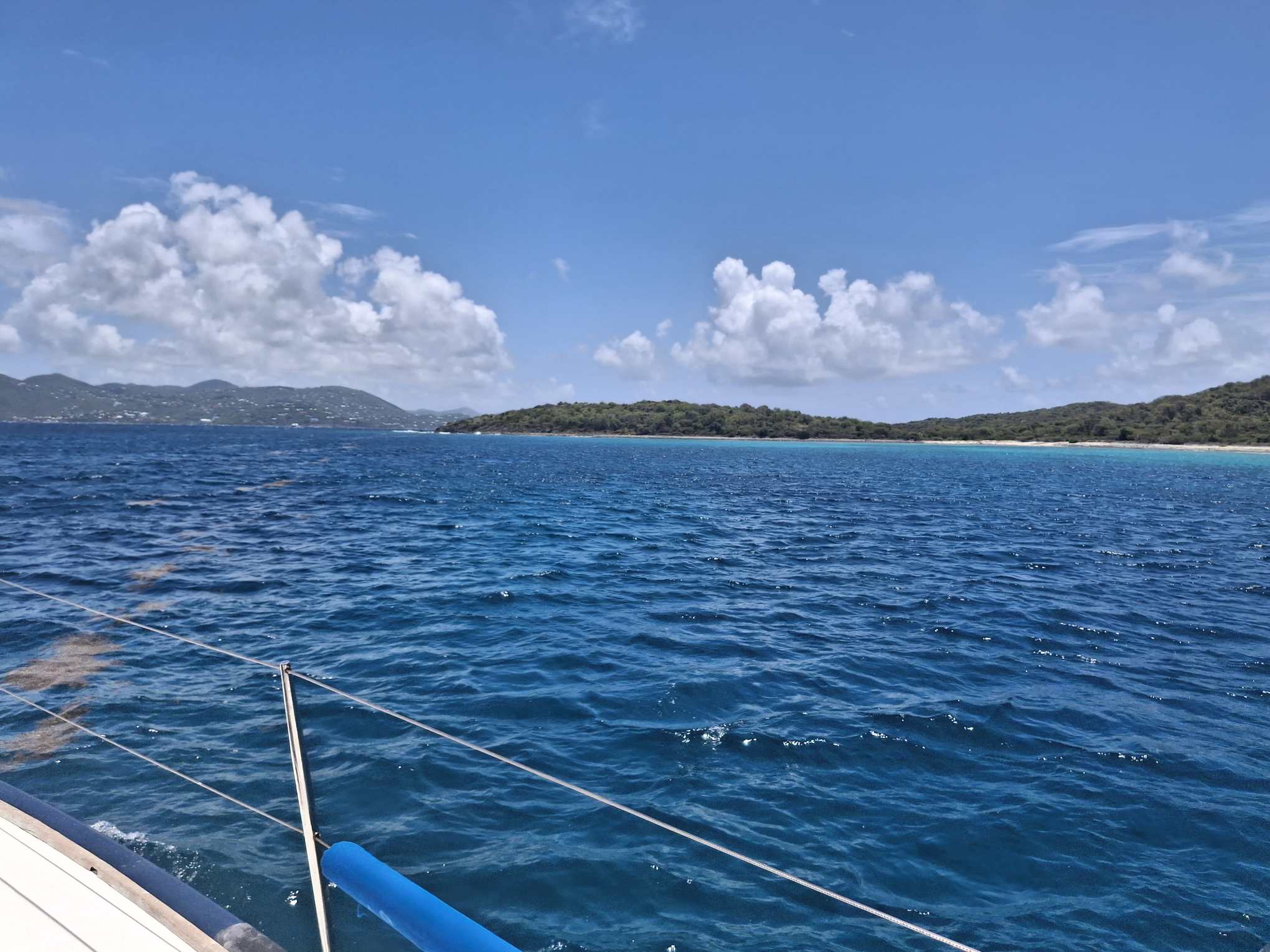 Nach dieser unruhigen Nacht war es mir ganz recht, am Mittwochmorgen bald nach Sonnenaufgang zu starten, um den inzwischen auf Südost gedrehten und gemässigten Wind für den Amwindkurs zu den USVIs zu nutzen. Unsere Devise war weiterhin, so weit nach Osten zu kommen, wie nur möglich. Denn der nächste grössere Sprung von ca. 100SM wird nach Südosten führen. Bei normalerweise vorherrschendem Ostwind ist es deshalb sinnvoll, möglichst weit im Osten starten zu können, um nicht gegenan kreuzen zu müssen. Wir verbrachten einen wunderbar sonnigen Tag mit schönem Amwindsegeln nach St. Thomas, wo wir nach zwei Kreuzschlägen ein Plätzchen in der berühmten Christmas Cove ergattern wollten.
