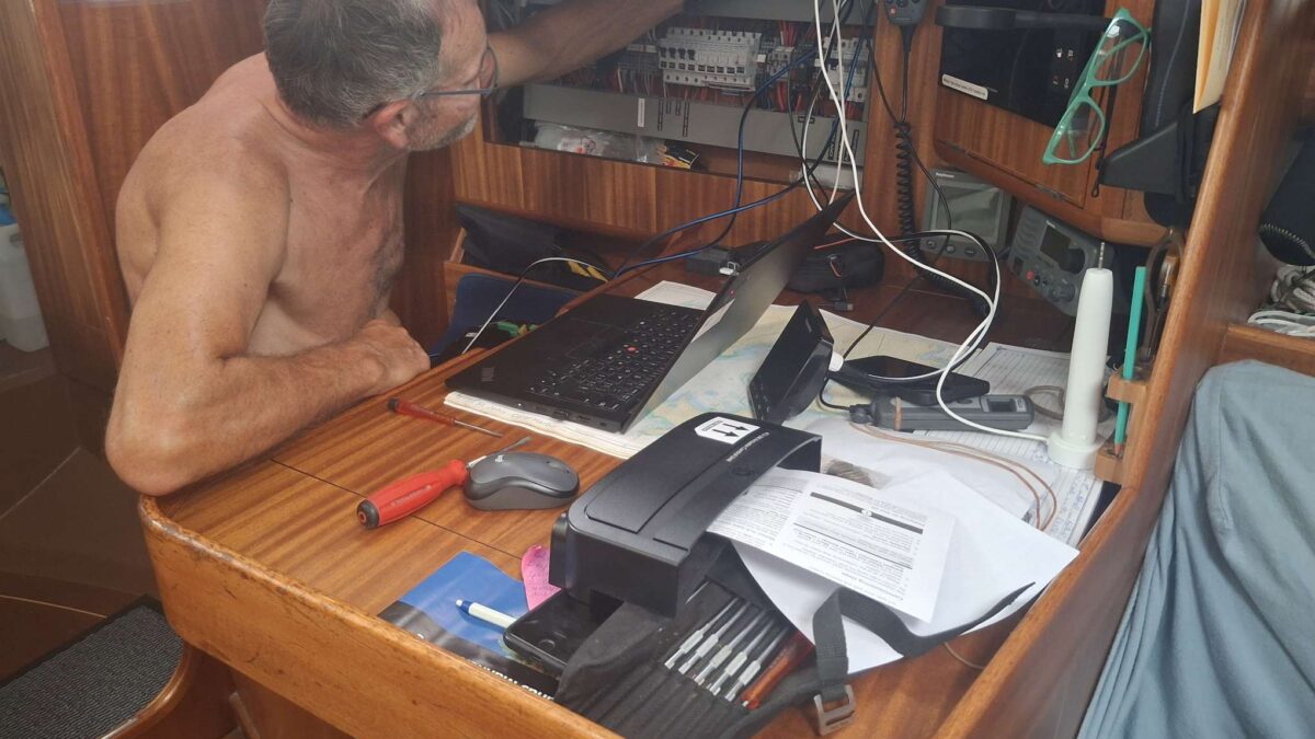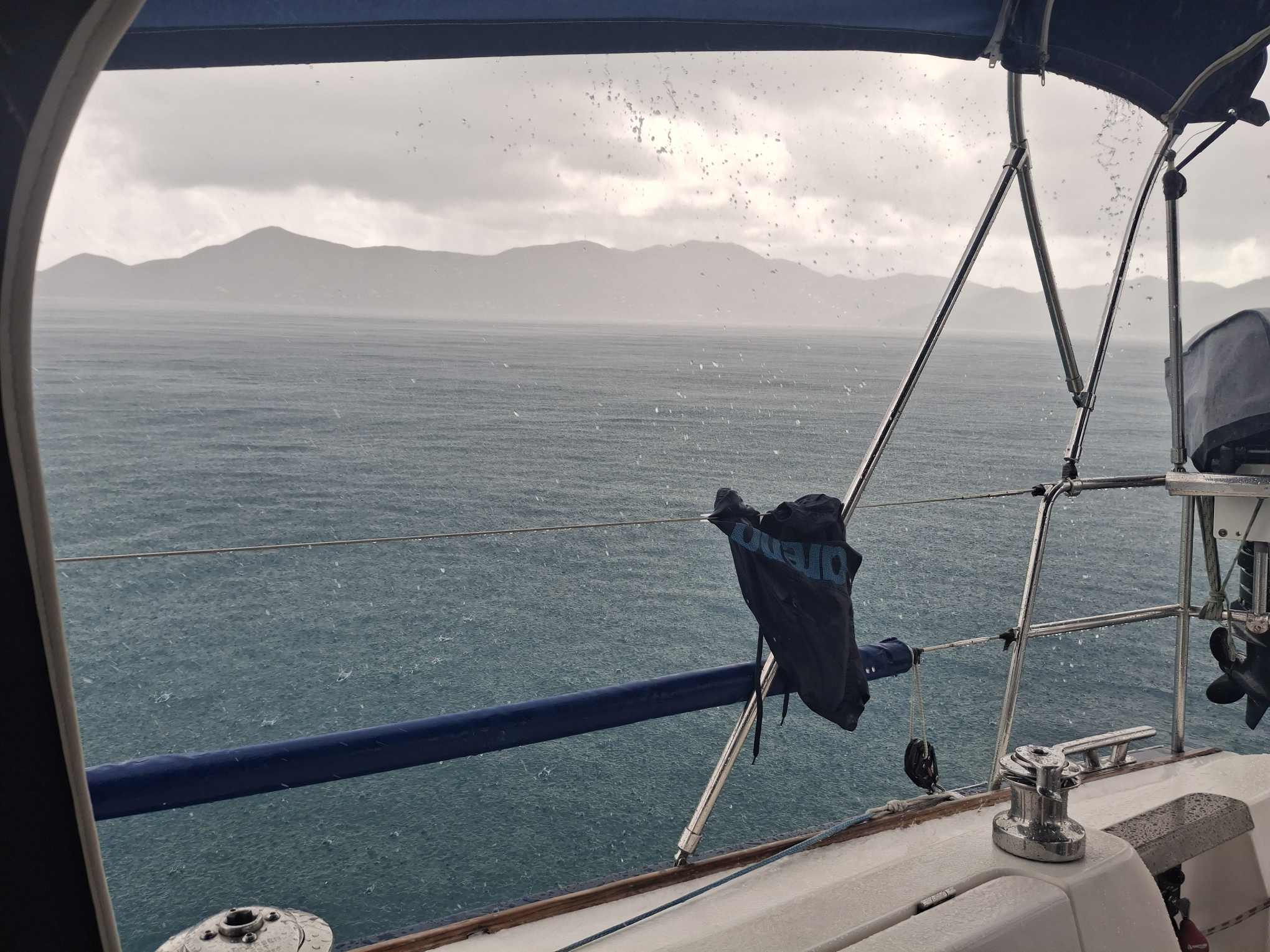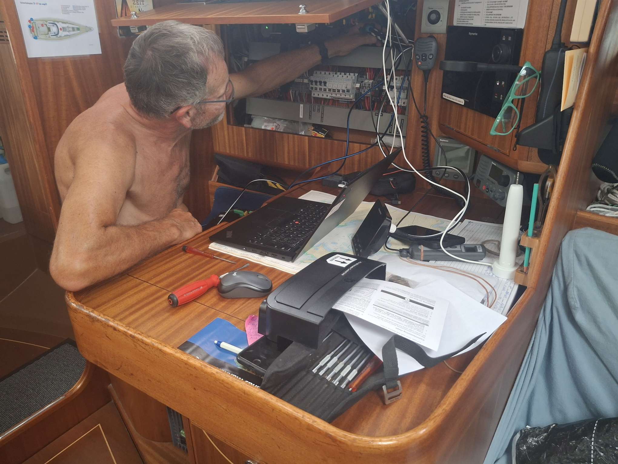 Einen Grossteil des Freitags verbrachten wir beide auch noch mit anderen Arbeiten: der Skipper hatte sich den Einbau unseres weitgereisten Ersatz-Autopiloten vorgenommen und ich musste mich um Büro-Arbeiten kümmern. Auch die gelegentlichen Regenschauer sorgten für Abwechslung und kübelweise Frischwasser.