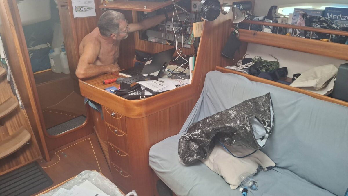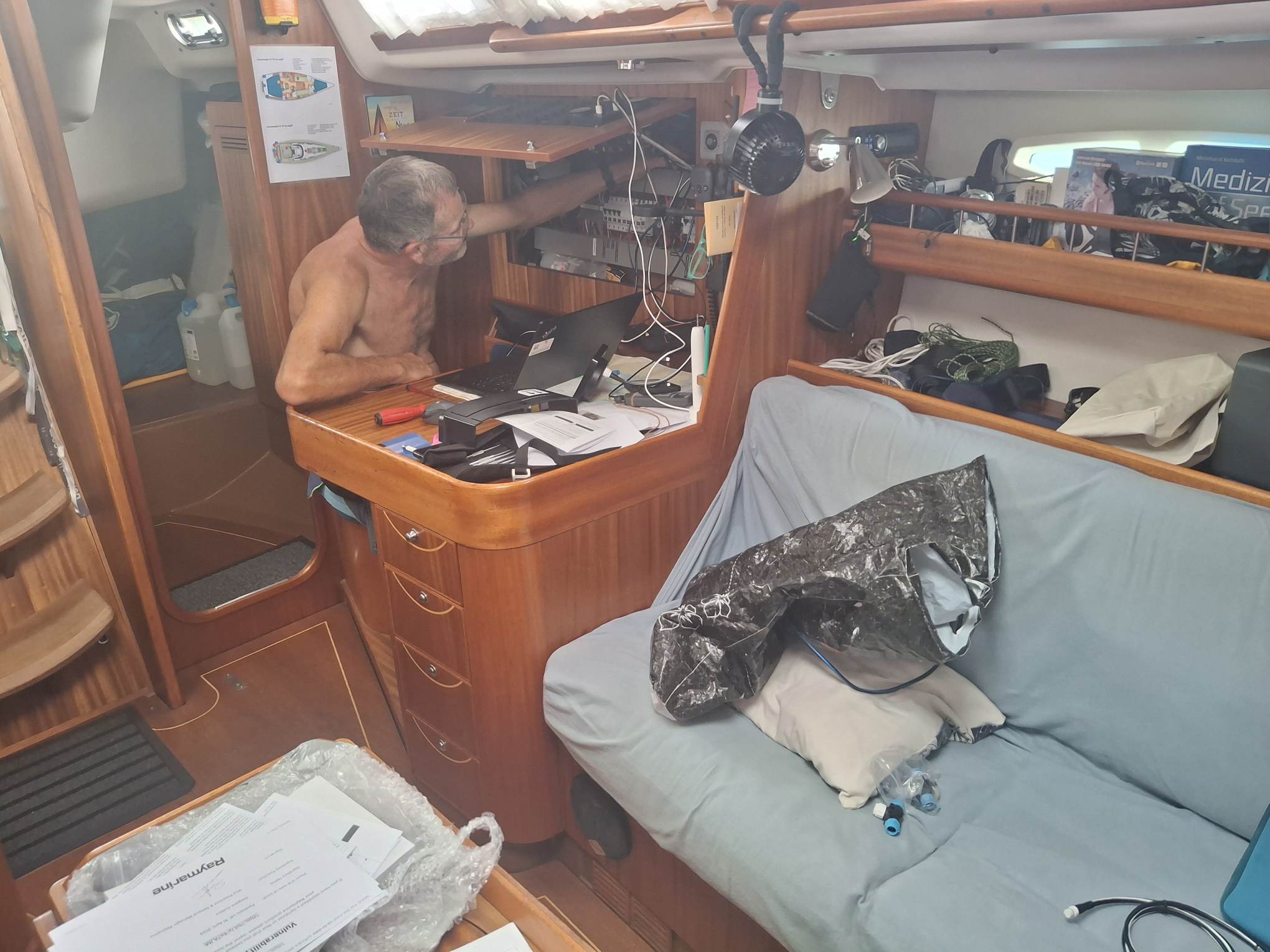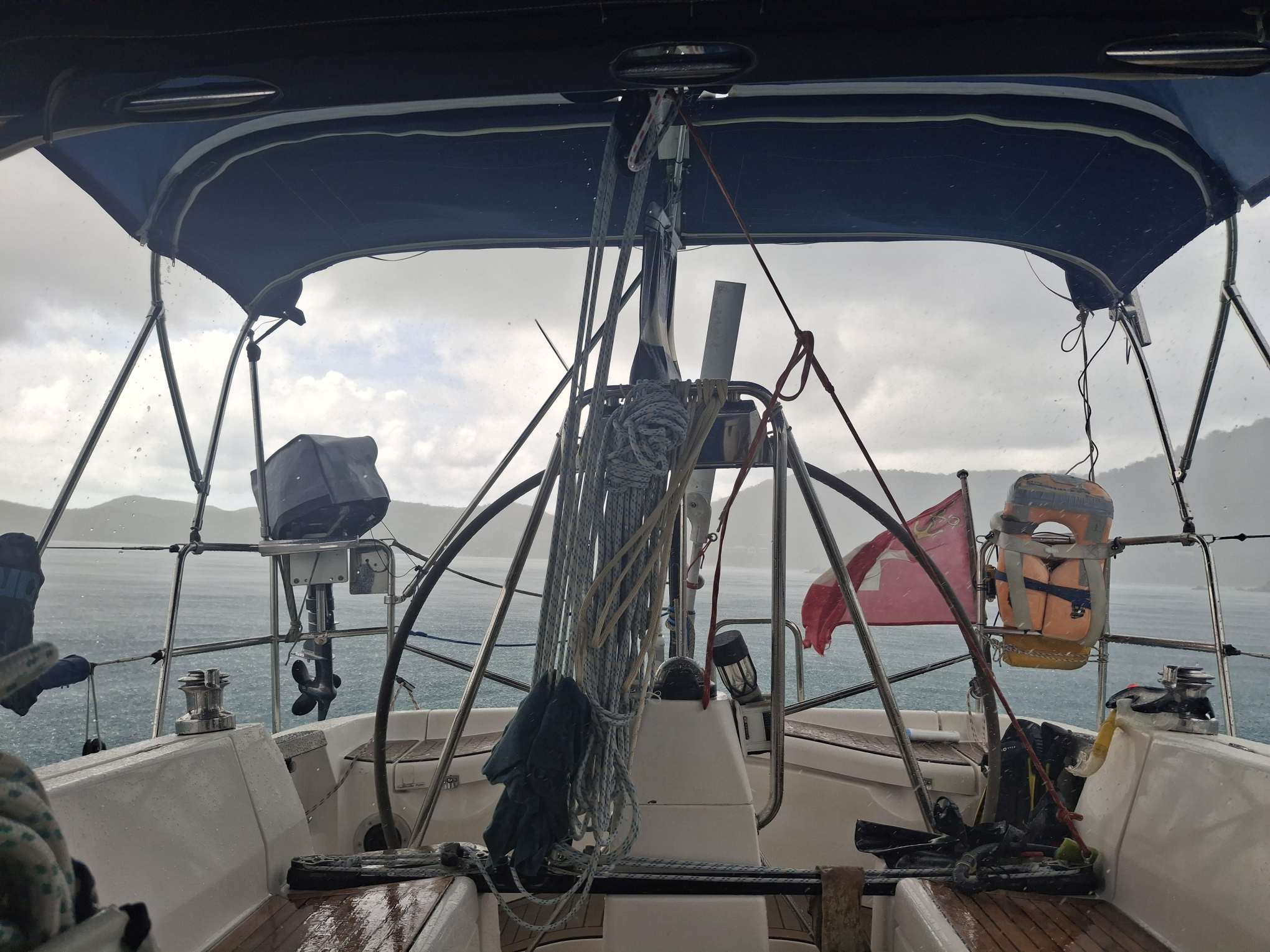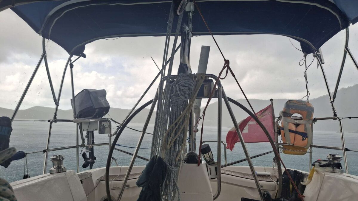 Einen Grossteil des Freitags verbrachten wir beide auch noch mit anderen Arbeiten: der Skipper hatte sich den Einbau unseres weitgereisten Ersatz-Autopiloten vorgenommen und ich musste mich um Büro-Arbeiten kümmern. Auch die gelegentlichen Regenschauer sorgten für Abwechslung und kübelweise Frischwasser.