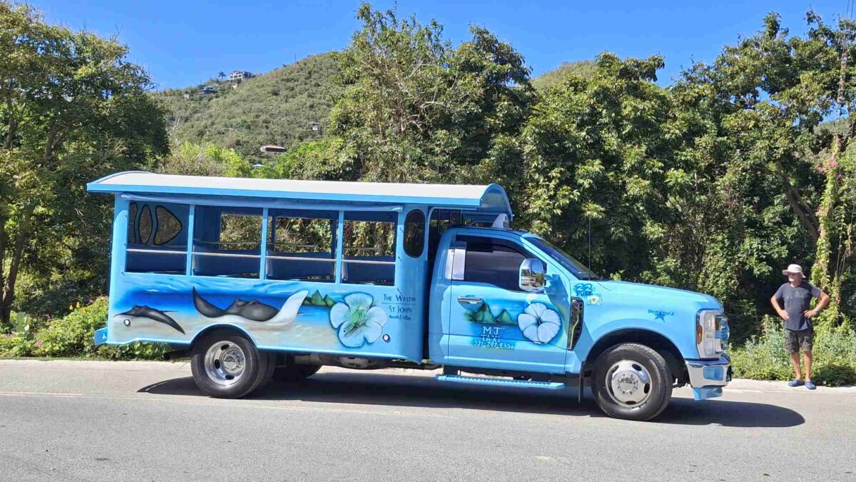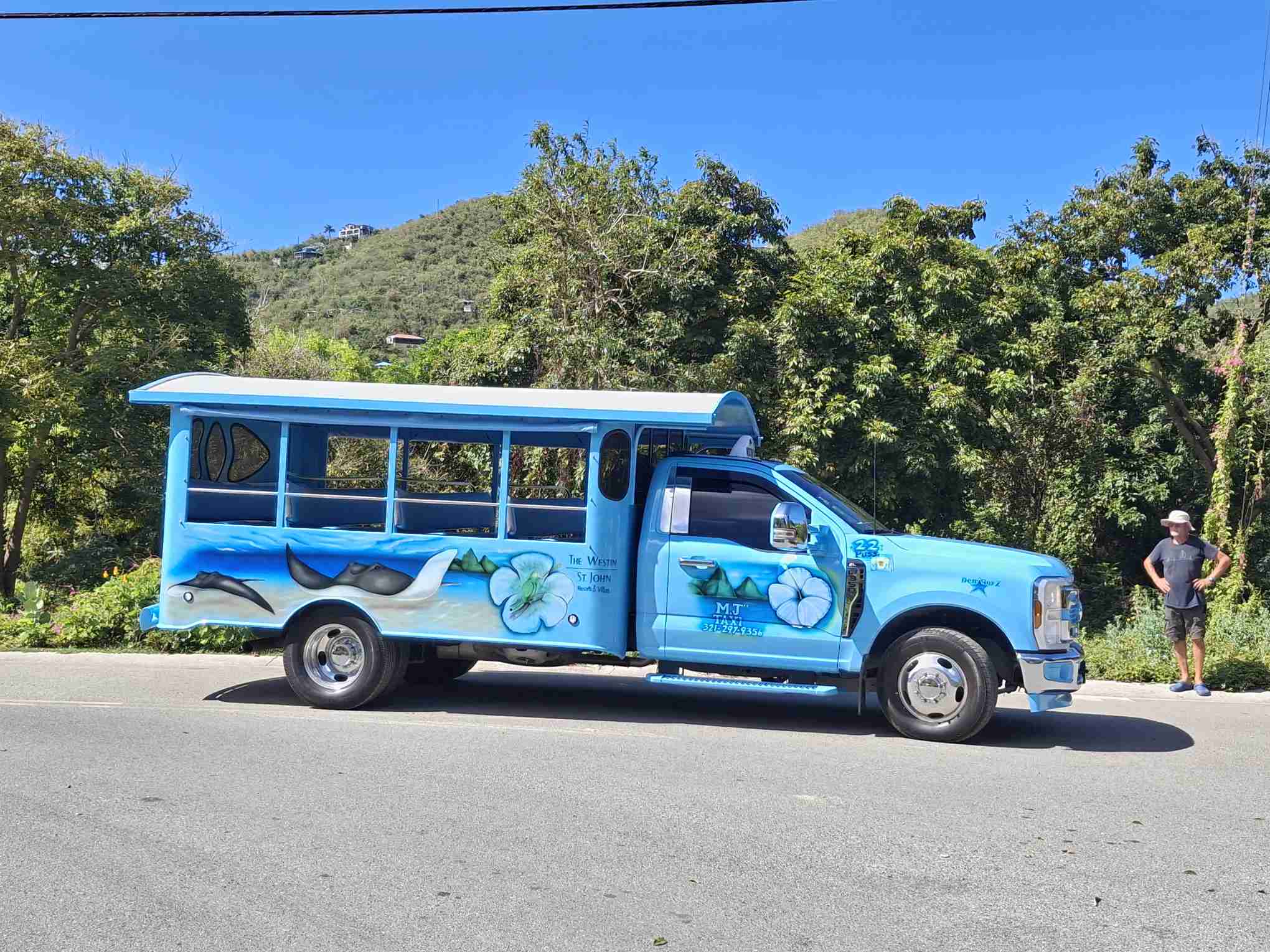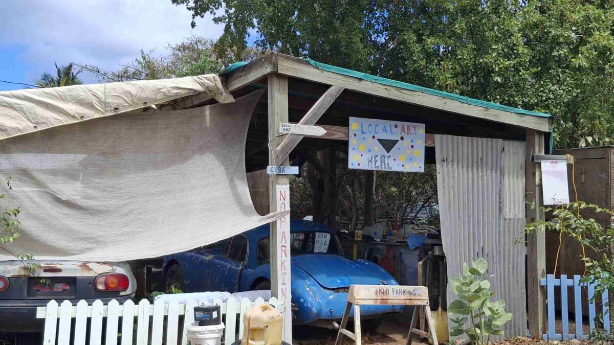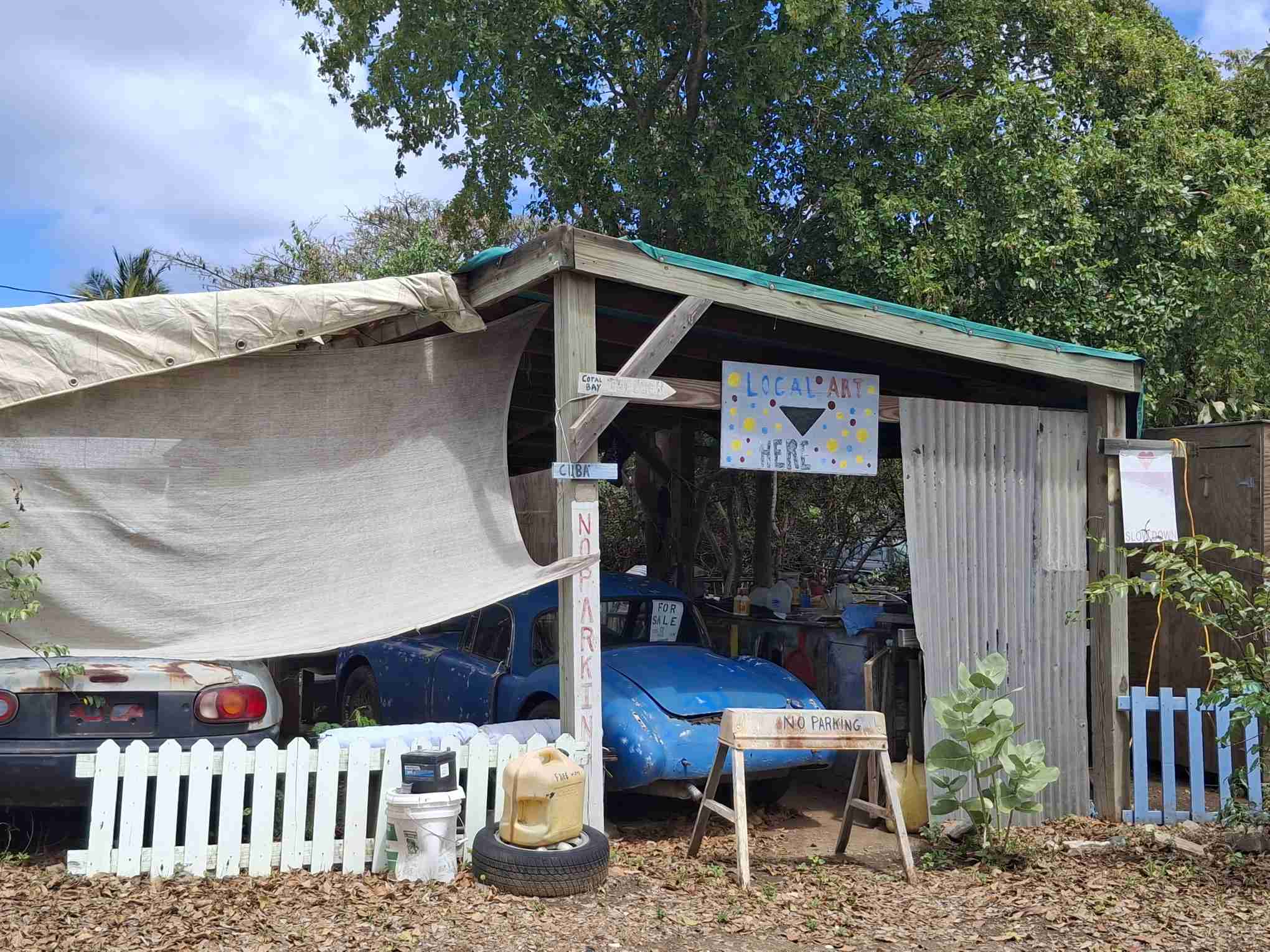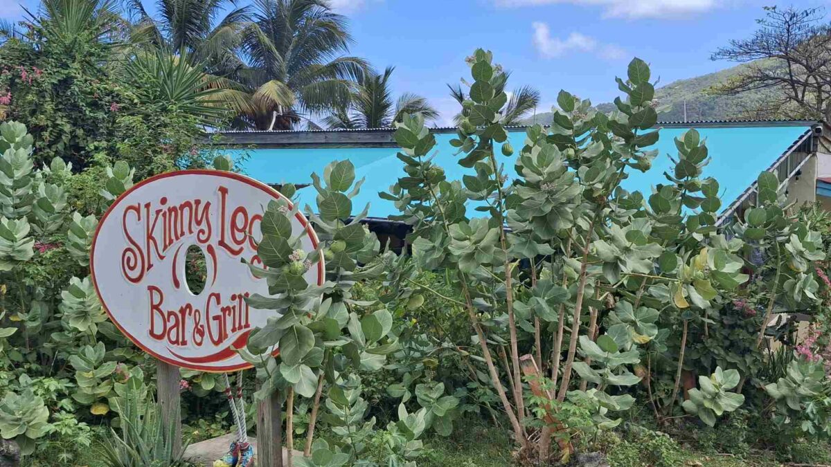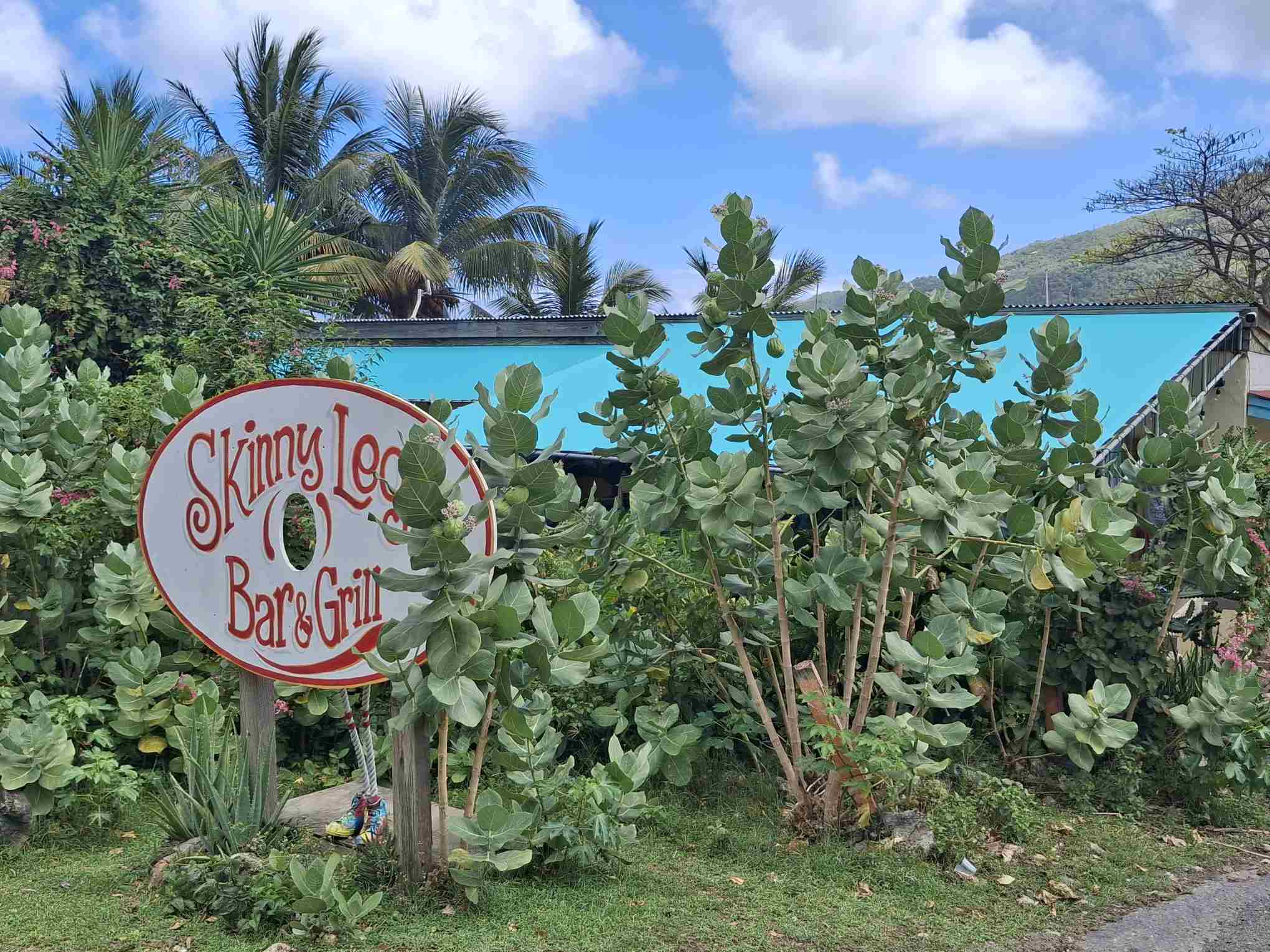 Im Skinny Legs leisteten wir uns zwei Biers und einen Mahi Mahi und einen Burger of the day und bezahlten dafür mit dem Service Zuschlag 53 USD. Nicht gerade günstig, aber die Bar gibt vielleicht einen kleinen Eindruck vom Leben auf dieser Insel. Der Tresen war besetzt von Menschen, die wir zu den „Hängengebliebenen“ der Seglercommunity zählen würden. Zumeist Ältere (noch älter als wir! 😉) mit diversen Beschwerden am Bewegungsapparat, viel Übergewicht, einem Fläschchen Bier vor sich und viel Zeit für den Austausch von Seemannsgarn. Vor der Bar beim Dinghysteg war eine Baracke, bzw. ein Unterstand, von dem aus zwei der späteren Barbesucherinnen ihre Kunstwerke (bemalte Holzplatten) verkauften und ein Dritter sich bemühte, alten Schrott an den Mann zu bringen. Es gelang ihm, Bänz eine ausrangierte Autonummer von St. Johns zu verkaufen; da staunte ich nicht schlecht. St. John ist anscheinend eher als die Künstlerinsel der USVIs bekannt und wir waren wohl gerade dreien davon begegnet.