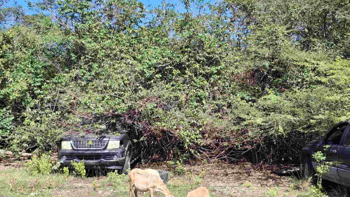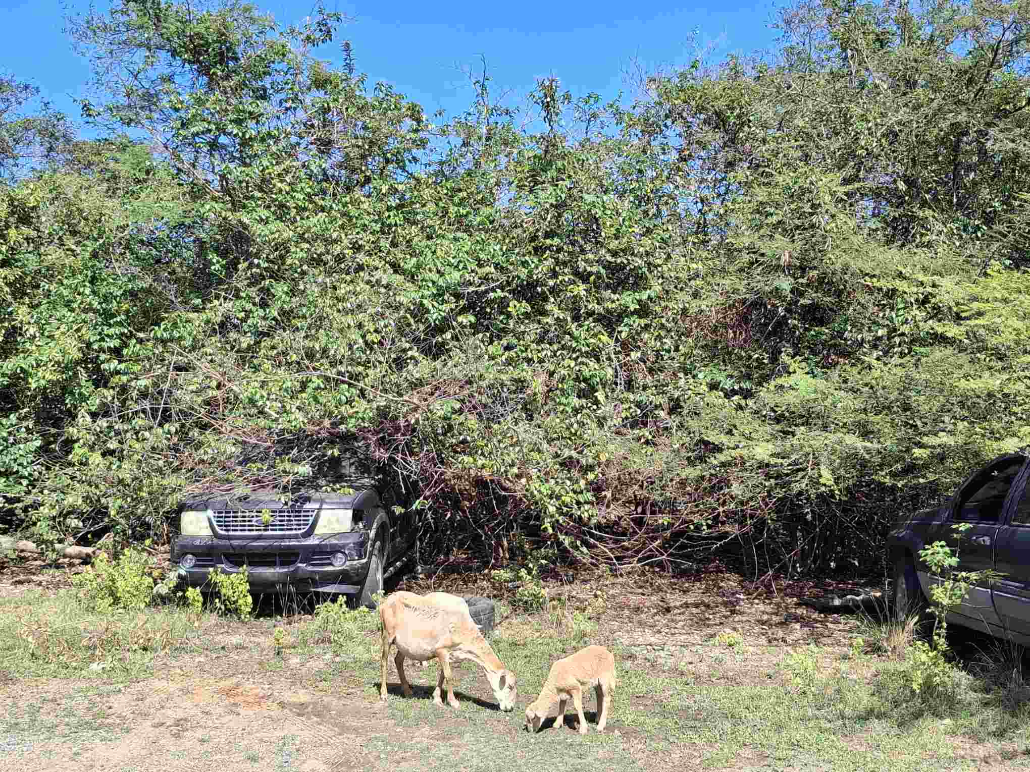 Der kleine Ort besteht hauptsächlich aus der Skinny Legs Bar u Restaurant mit grossem Parkplatz davor, sowie der Fire Station mit den üblichen amerikanischen, altertümlich wirkenden Feuerwehrlastern draussen, damit in ihrer Garage drinnen ein Kraftraum eingerichtet werden konnte, und dem Friedhof mit zerfallender Kirche und vielen Ziegen auf beiden Seiten des Zauns. Der Bucht entlang führt die Strasse (mit Linksverkehr, wie ich überrascht mit einem Sprung in Sicherheit feststellte) und an der Strasse stehen überall zerfallende und überwachsene Autowracks.