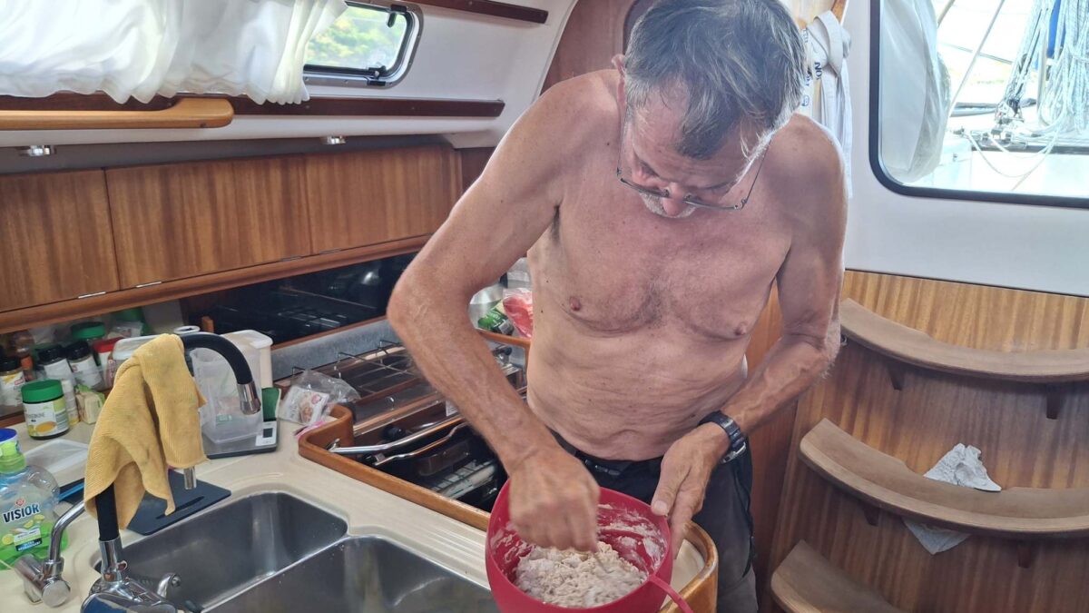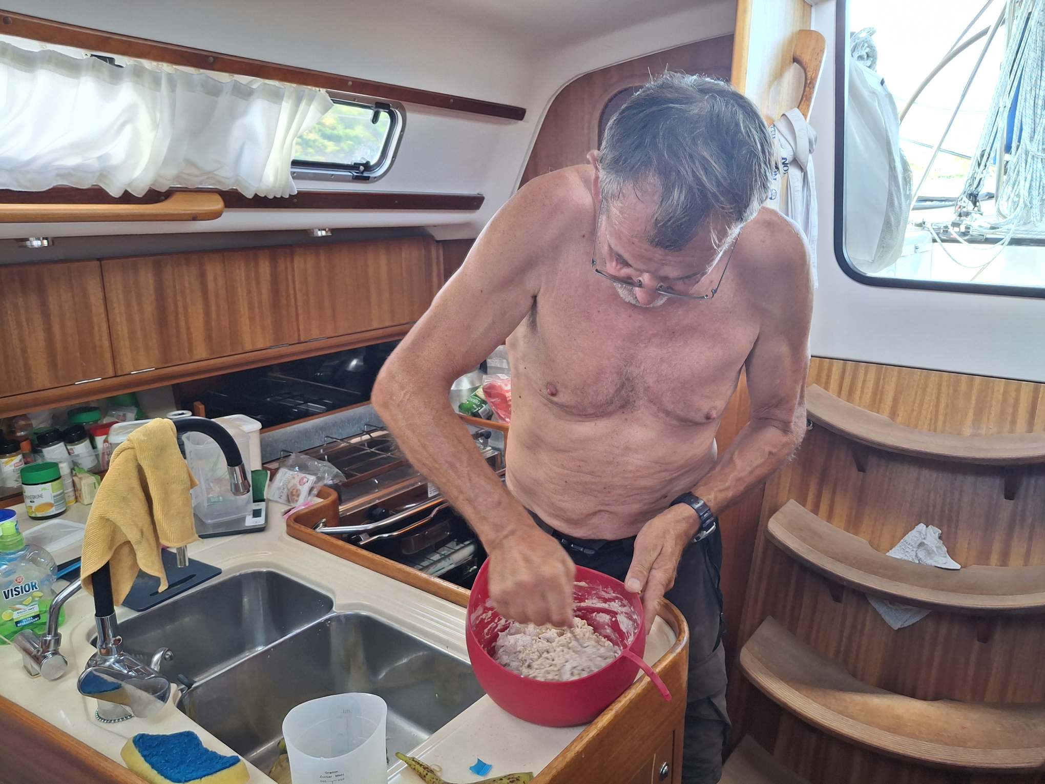 Inzwischen ist es Sonntagmittag geworden. Die Nacht war tatsächlich etwas unruhiger als bisher wegen des lauten Rumpelns. Wir kompensierten mit gemütlichem Ausschlafen und einem ausgiebigen Schnorchelgang. Diesmal erstmals mit der alten GoPro-Kamera dabei. Auch mit der gilt es noch zu lernen, aber immerhin, meistens ist erkennbar, was ich festhalten wollte. Vorher hatte der Skipper noch einen Teig für unser nächstes Brot gestartet.