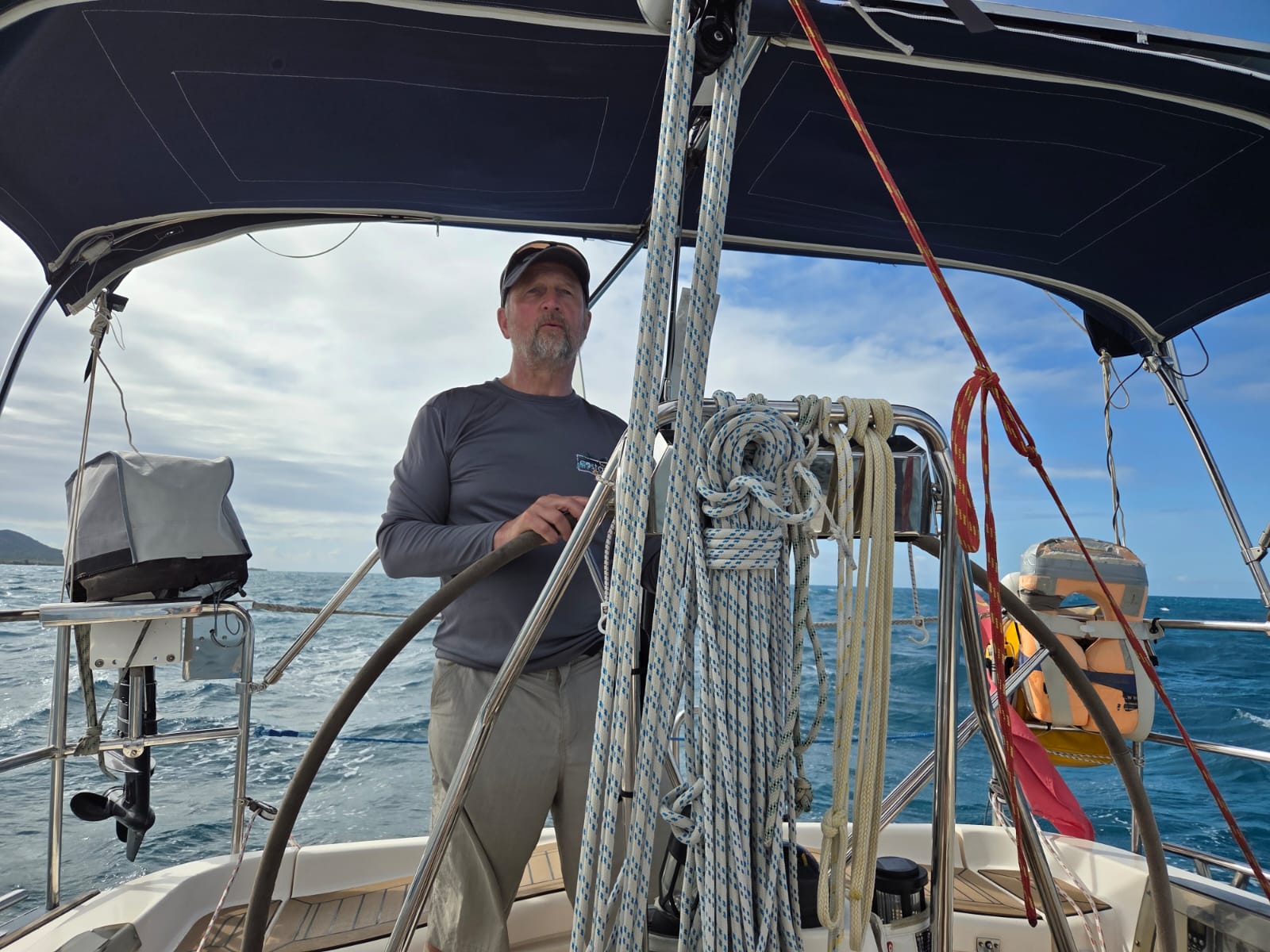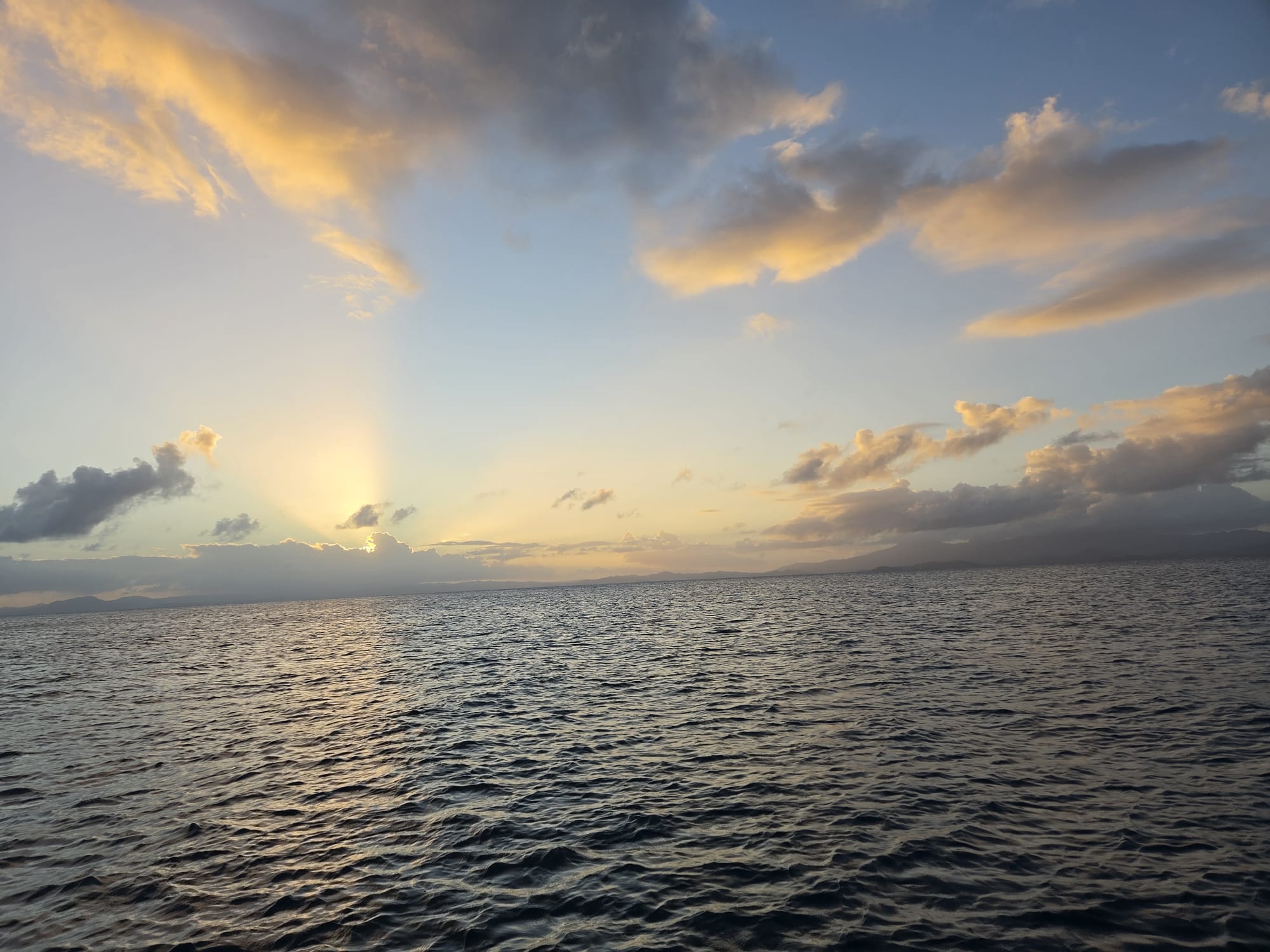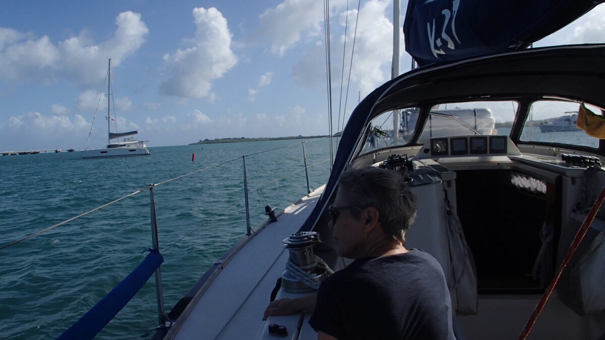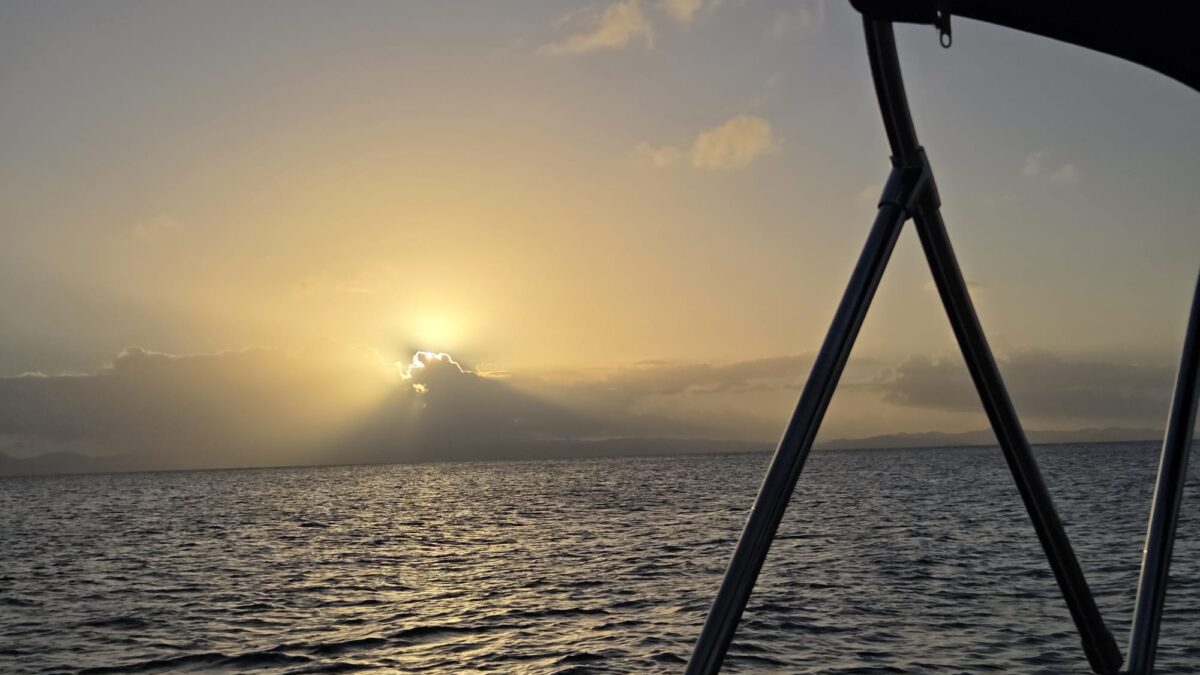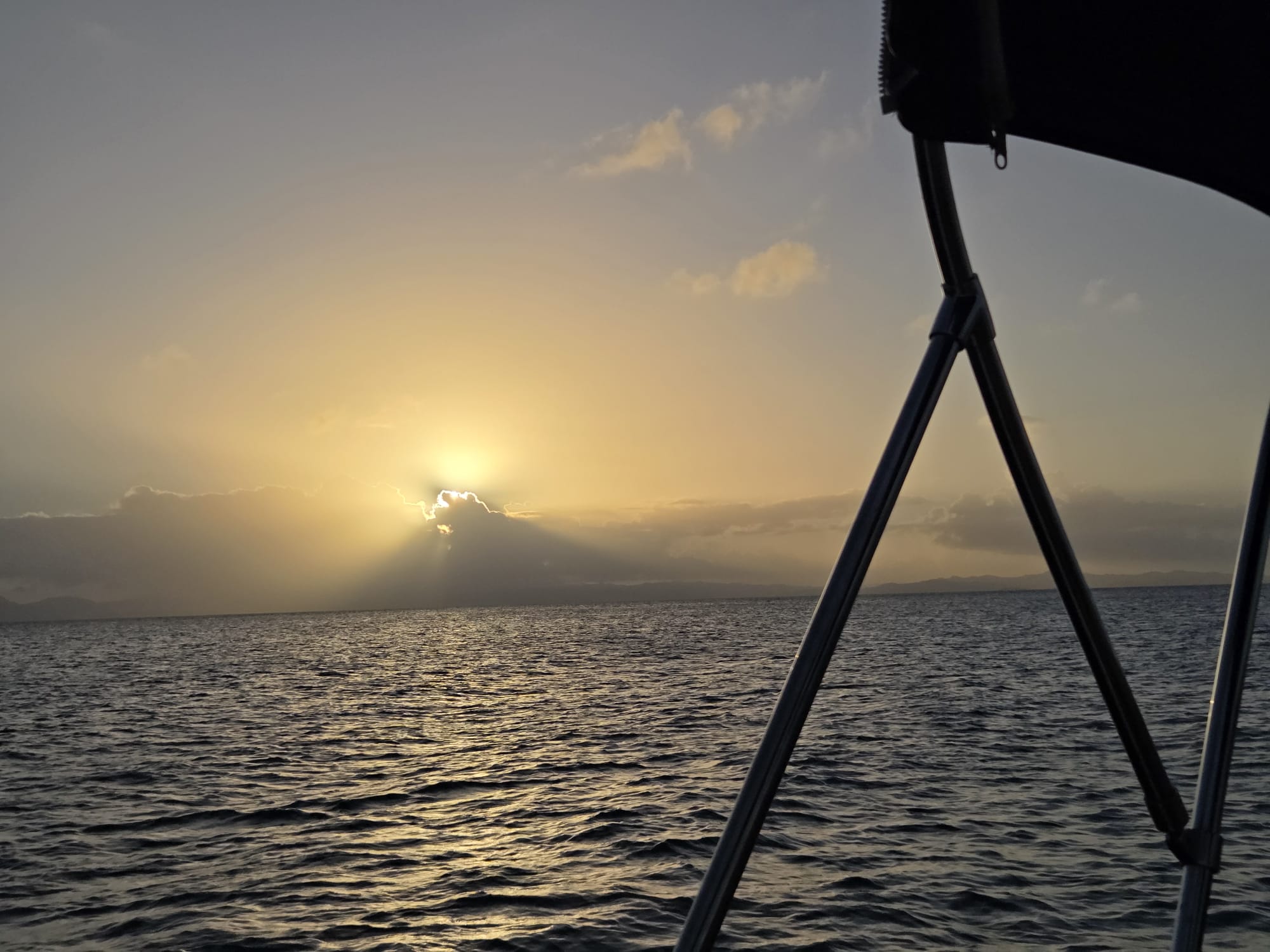 Dienstag, 17.3.26 Nach erstaunlich gutem Schlaf und einem feinen Müesli-Frühstück erhalten wir weitere Informationen gemäss Bänz’s Liste. Und spätestens jetzt merken wir, dass wir mit niemandem anderen als mit unserem jahrzehntelangen, sehr erfahrenen See-Bänz eine solche Segeltour wagen würden. Und dann – am Nachmittag geht es los mit Segeln! Bänz fährt uns aus der Bucht in Richtung Isla de Vieques und wir dürfen beide unsere ersten Steuer-Erfahrungen machen. Uhhhh, das sieht ja so viel einfacher aus beim Zuschauen von Bänz, als es sich dann für Laien wirklich anfühlt!! In der wunderschönen und geschützten Green Bay gehen wir vor Anker und geniessen auf Deck gemütlich einen Sundowner, zusammen mit der grandiosen Abendstimmung und anschliessend einen feinen Gemüseeintopf zum Znacht. Diese Nacht schaukelt es schon deutlich mehr, aber auch diese Mal schlafen wir gut.