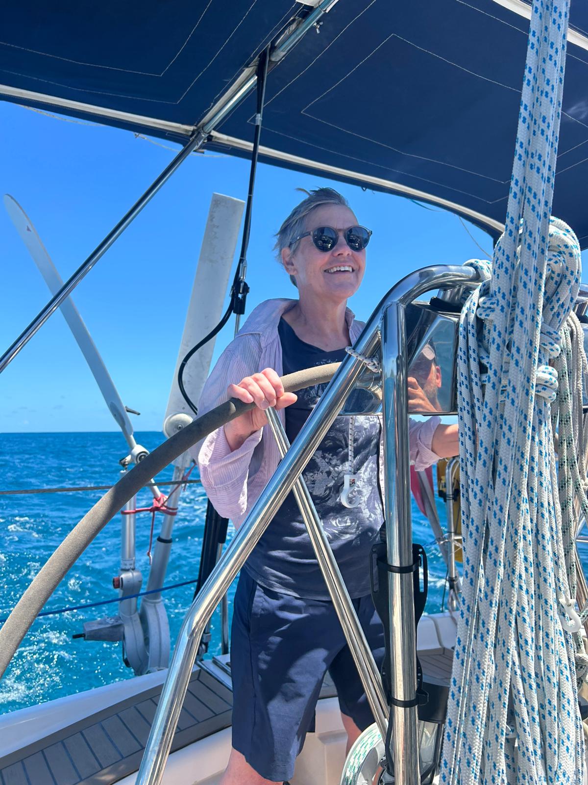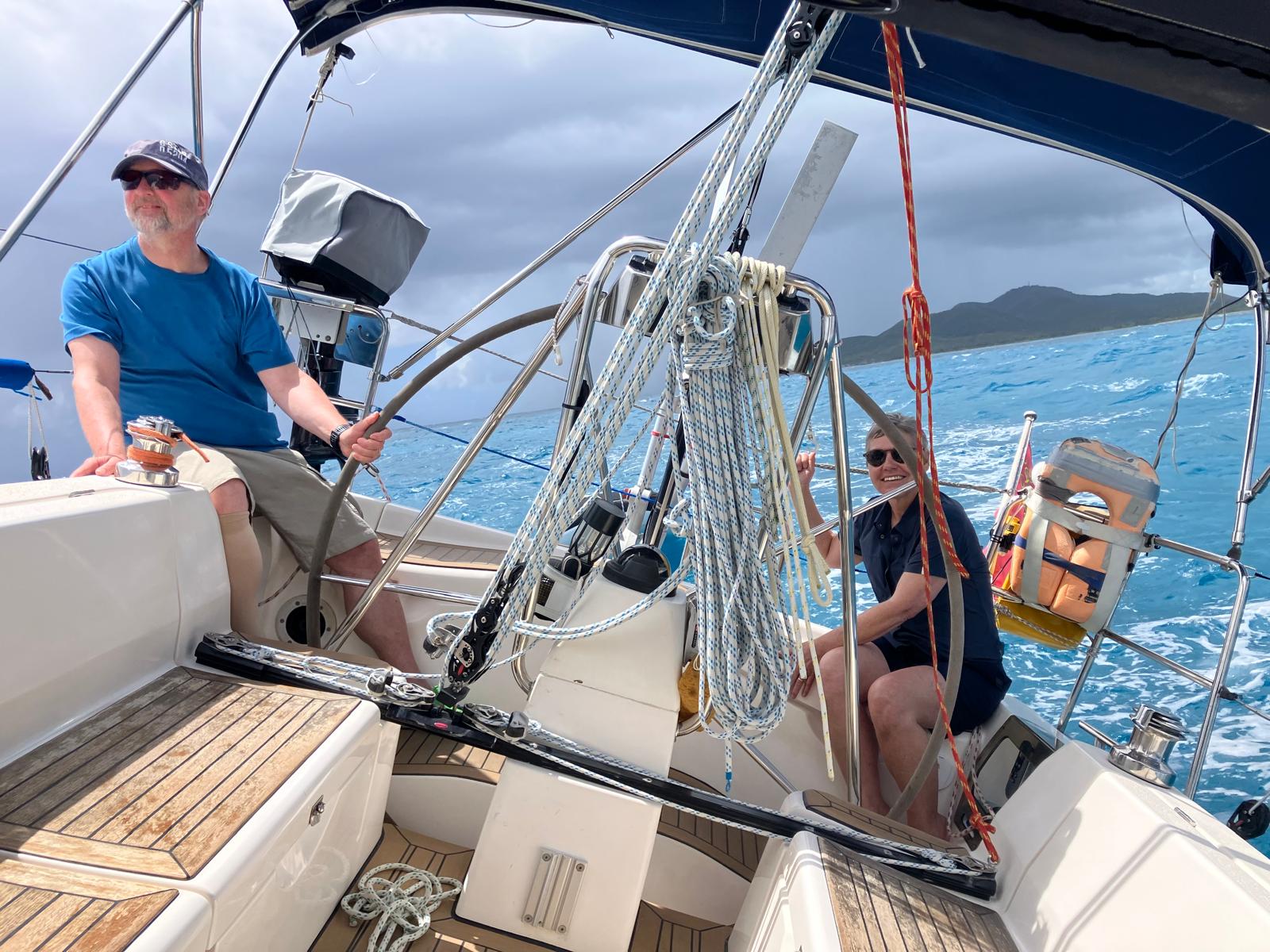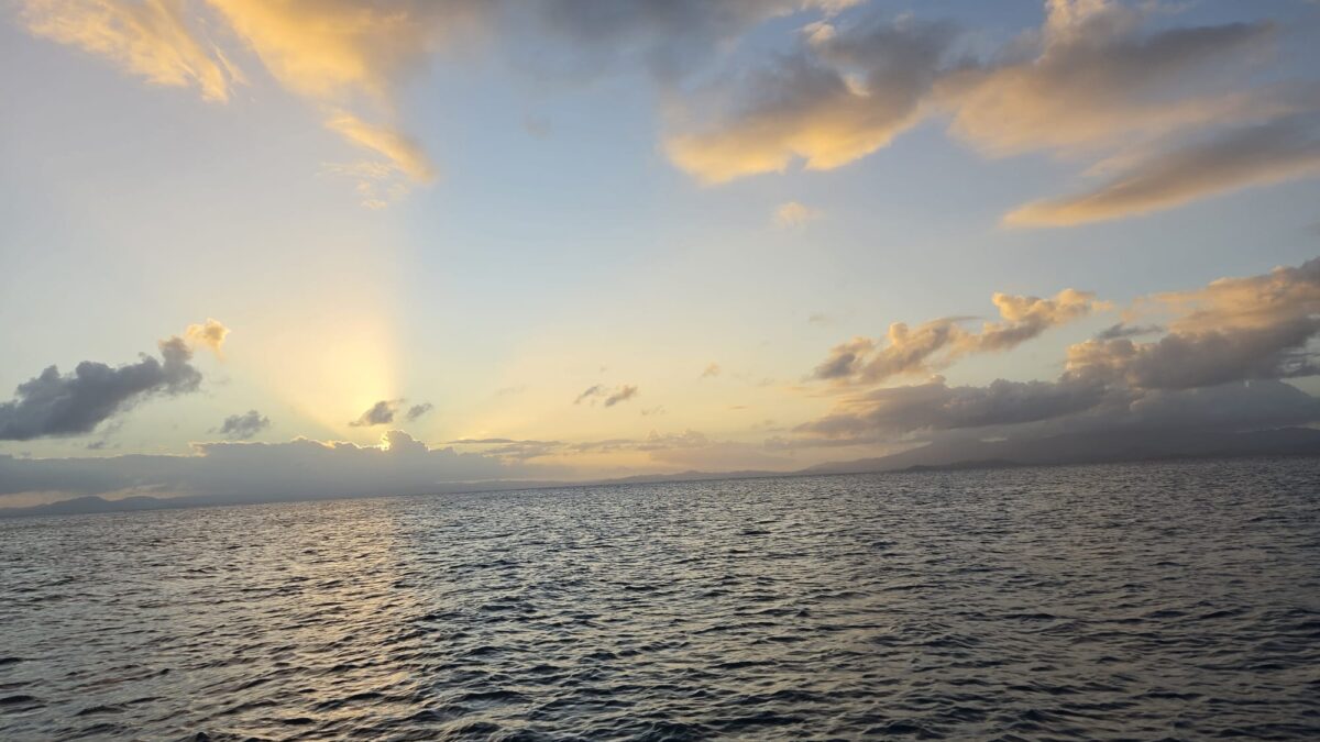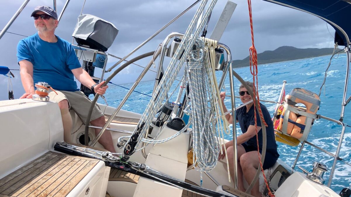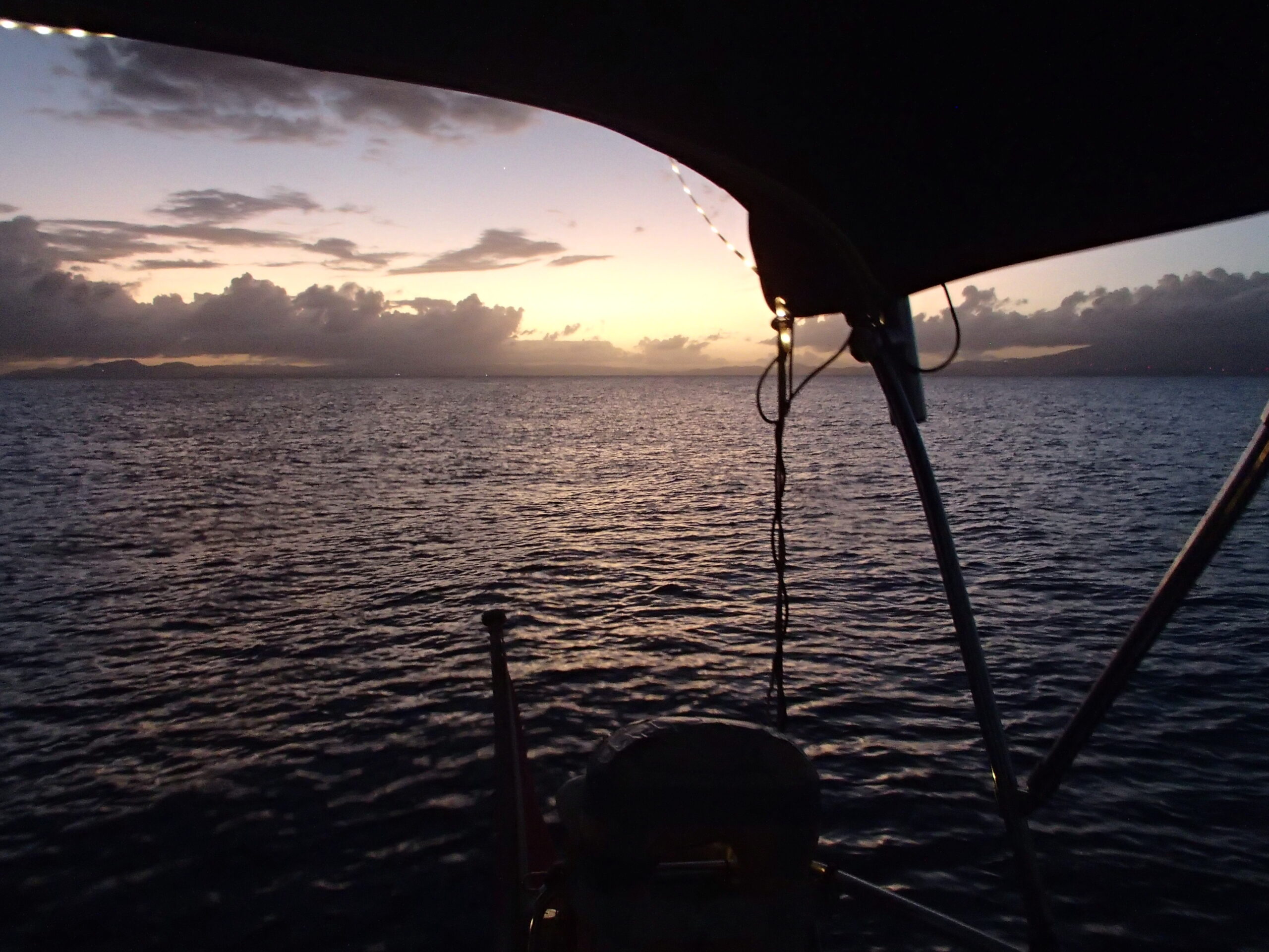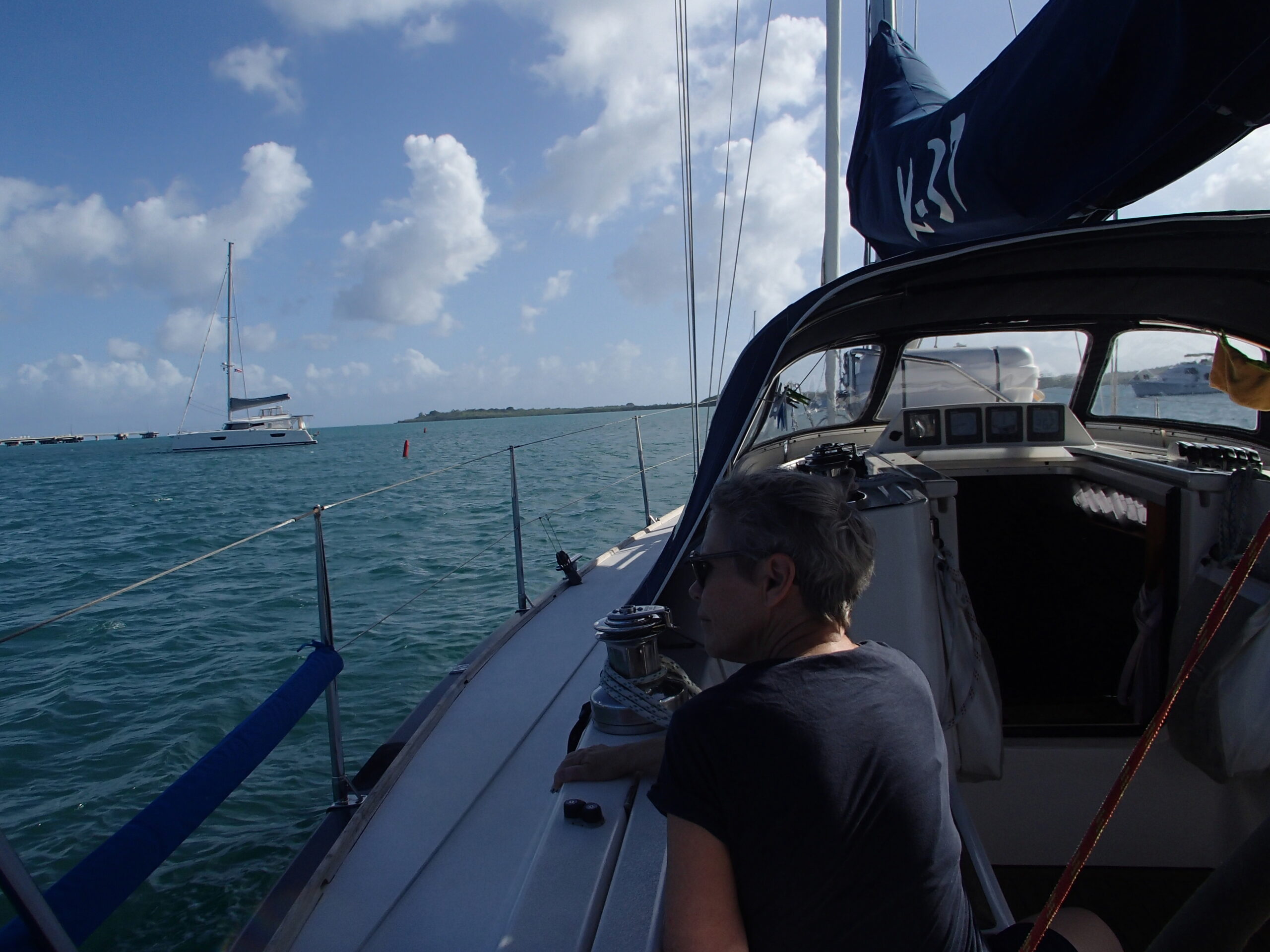 Dienstag, 17.3.26 Nach erstaunlich gutem Schlaf und einem feinen Müesli-Frühstück erhalten wir weitere Informationen gemäss Bänz’s Liste. Und spätestens jetzt merken wir, dass wir mit niemandem anderen als mit unserem jahrzehntelangen, sehr erfahrenen See-Bänz eine solche Segeltour wagen würden. Und dann – am Nachmittag geht es los mit Segeln! Bänz fährt uns aus der Bucht in Richtung Isla de Vieques und wir dürfen beide unsere ersten Steuer-Erfahrungen machen. Uhhhh, das sieht ja so viel einfacher aus beim Zuschauen von Bänz, als es sich dann für Laien wirklich anfühlt!! In der wunderschönen und geschützten Green Bay gehen wir vor Anker und geniessen auf Deck gemütlich einen Sundowner, zusammen mit der grandiosen Abendstimmung und anschliessend einen feinen Gemüseeintopf zum Znacht. Diese Nacht schaukelt es schon deutlich mehr, aber auch diese Mal schlafen wir gut.