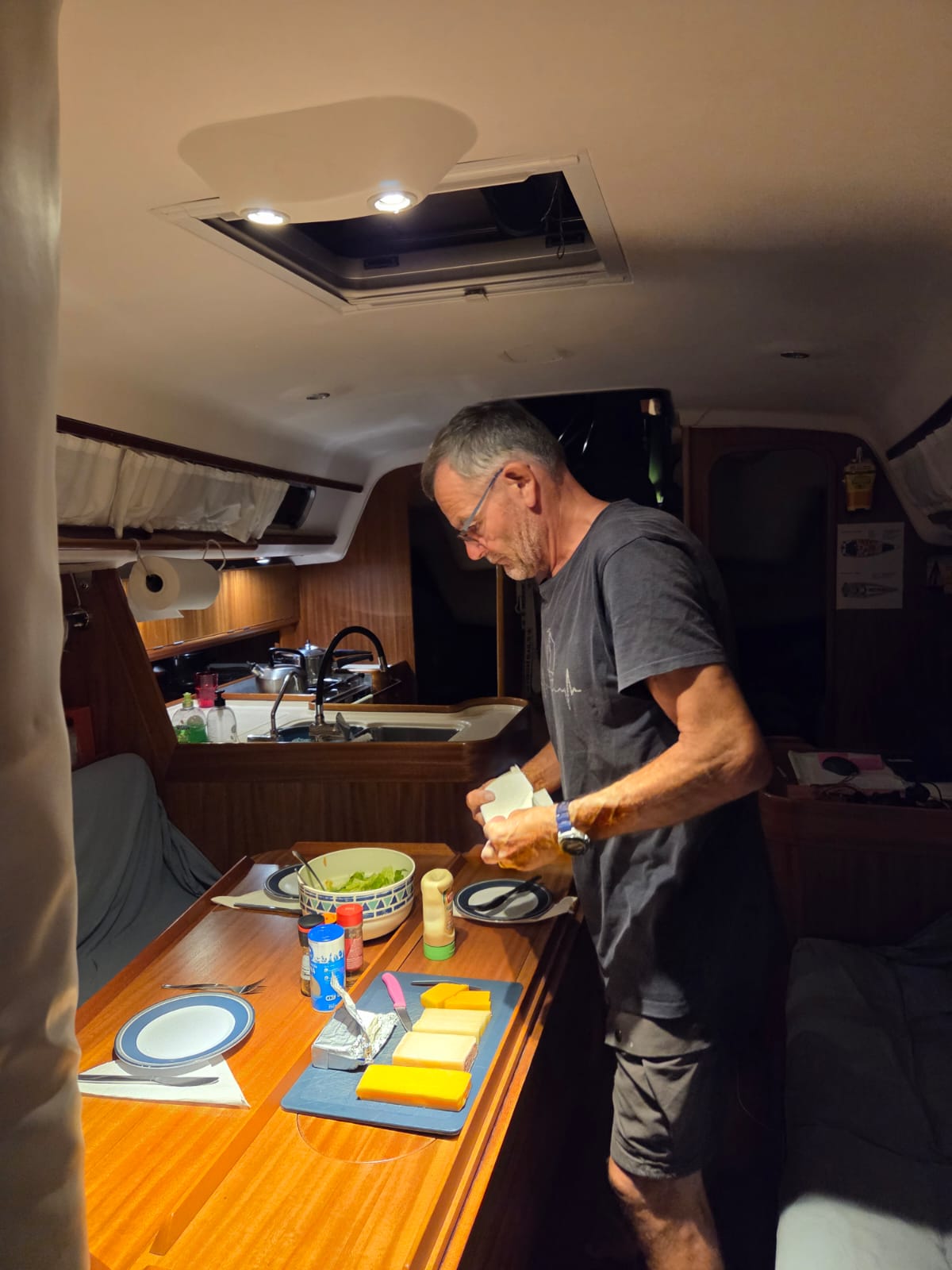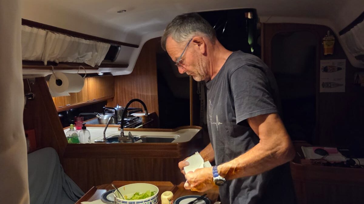 Wie beziehen unsere Kajüte und verstauen unsere Siebensachen. Dann folgt die erste Einführung bzw. Abarbeitung der laaaaangen Liste der Dinge, die es zu lernen und zu wissen gibt. Bedienung der Toilette (da gibt’s doch einiges zu beachten 😉), Sicherheit und Brandschutz sind ganz wichtige Themen, verständlicherweise! Auch Wassermanagement ist ein bedeutender Teil der Einführung. Ein spannendes Thema ist auch die Vermeidung von Seekrankheit, gegen die Bänz viele hilfreiche Tipps auf Lager hat (die sich wirklich bewähren, wir haben auf der ganzen Reise nicht die geringsten Probleme). Leider können wir aufgrund der Wetterverhältnisse noch nicht lossegeln, so dass wir die erste Nacht in der nicht allzu schönen ehemaligen Marinabucht verbringen.