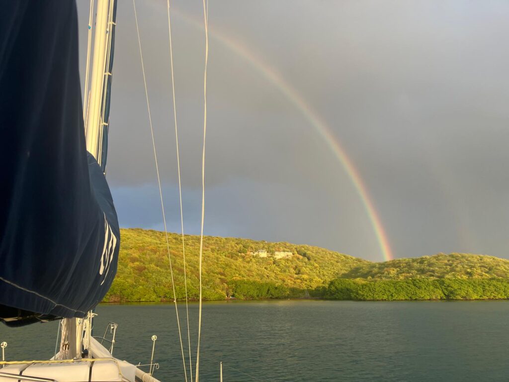 Sonntag, 22.3.26 Der Morgen begrüsst uns mit Doppel-Regenbogen – welch herrliches Naturspektakel in dieser wunderschönen Umgebung! Den Regensonntagvormittag verbringen wir mit langem und gemütlichen Zmörgelen und mit vielen interessanten Diskussionen. Als Abschluss gibt es für die Männer einen fantastischen Espresso à la Bänz! Was unser Skipper doch nicht alles für Überraschungen auf Lager hat!! Gegen Mittag geht es bei durchzogenem Wetter unter Motor weiter zur Ensenada Honda (tiefe Bucht) auf Culebra., wo wir vor Anker gehen. Die Steuerfrau hat Freude, dass sie wiederum neue Fahrerfahrungen machen darf. In der Bucht ist präzises Fahren gefragt, was aber nach Anleitung von Bänz gut gelingt.