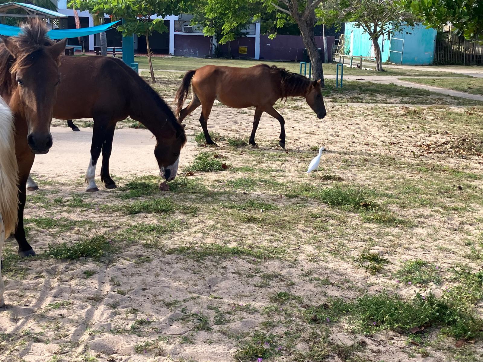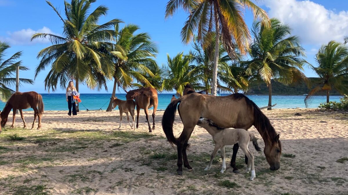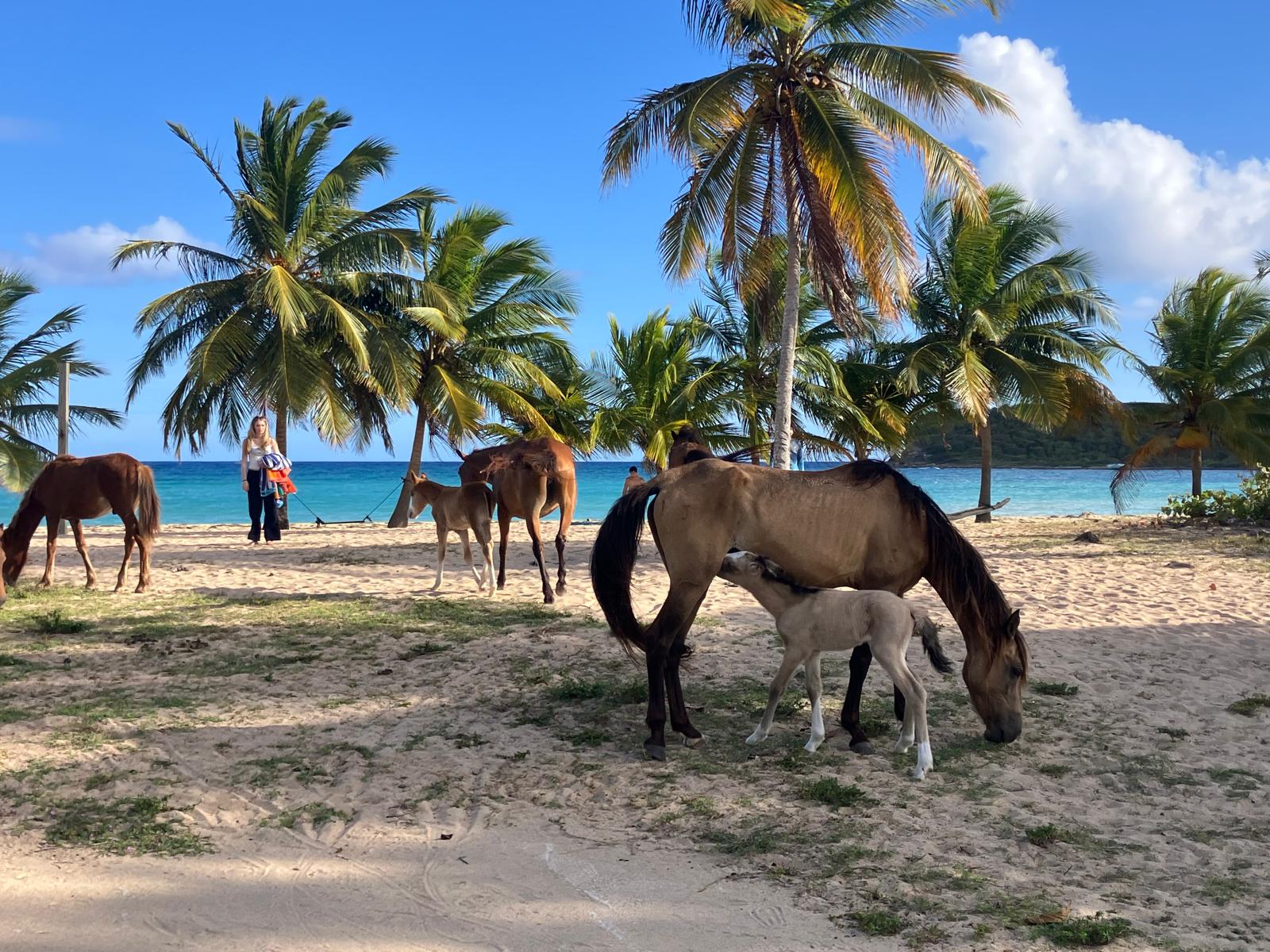 Donnerstag, 19.03.26 (der Tag der Tage 😉) Heute geht es weiter nach Esperanza. Wir müssen diese Mal mehr oder weniger gegen den Wind fahren, was vieles Kreuzen gegen den Wind bedeutet. Der blutige Anfänger-Steuermann kommt da schon an seine Grenzen inkl. Querstellen des Ruders mit entsprechender Abbremsung des Bootes (selbst der sehr geduldige Bänz braucht doch auch mal klare und deutliche Worte ob der noch nicht vorhandenen Künste …). Aber am Ende schaffen es alle mehr oder weniger unbeschadet (abgesehen vom leicht angeröteten Arm des Möchtegern-Steuermanns) an unser Ziel Esperanza. Hier geht es an Land mit dem Dinghi und als erstes buchen wir eine Tour zur Mosquito Bay, DER Attraktion von Esperanza. Nämlich ein nächtlicher Besuch in der fast abgeschlossenen Bucht mit Bioluminiszenz-Licht!! Ziemlich einmalig in der Welt und deshalb natürlich eine grosse Attraktion, die viele Touristen anzieht. Erst um 20.30 ist ein Slot frei und nach vielem Abnicken von Bedingungen kriegen wir eine Buchung. Nach einer feinen Salat-Stärkung in der «Bananas-Bar» geht’s zu Fuss zum wunderbaren Strand in der Sunbay, wo Bänz eine öffentliche Dusche kennt – mit nahezu unendlichem Frischwasser.😊 Auch die vielen freilaufenden Wildpferde, klein und gross, die sich auf dem Gelände tummeln, erstaunen uns, weil so noch nie erlebt.